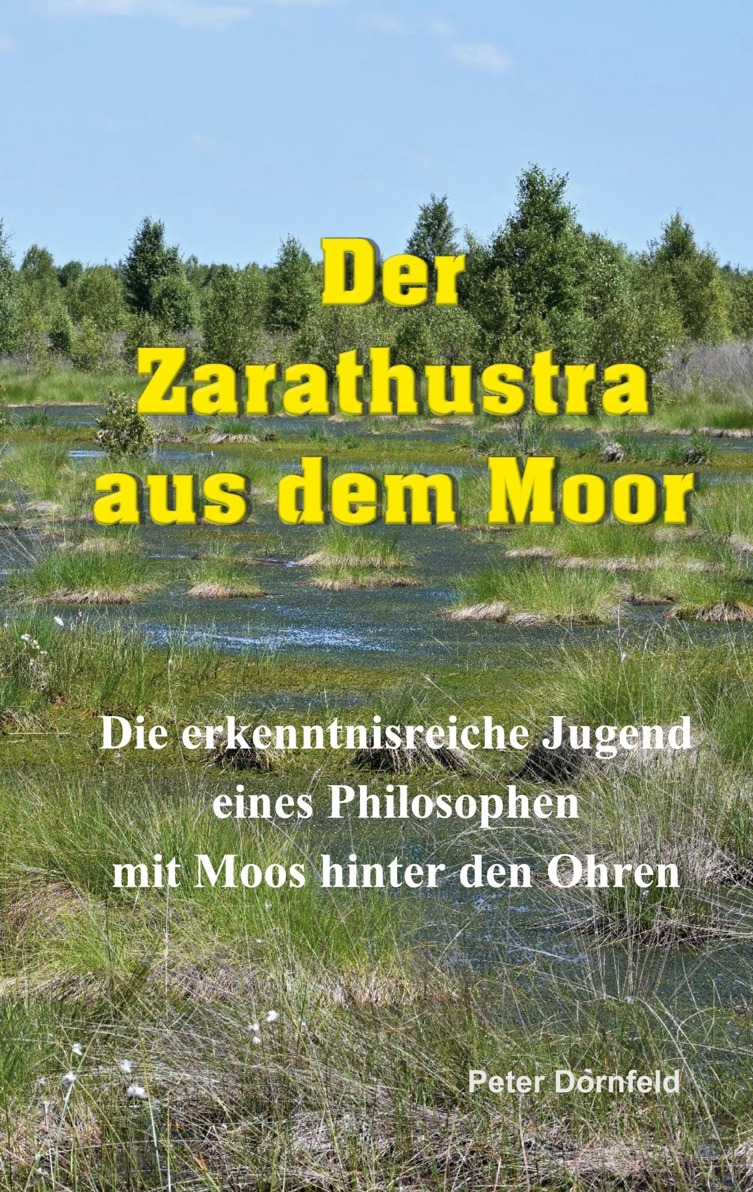 Text: "Der Zarathustra aus dem Moor. Die erkenntnisreiche Jugend eines Philosophen mit Moos hinter den Ohren". Moorlandschaft., Buch