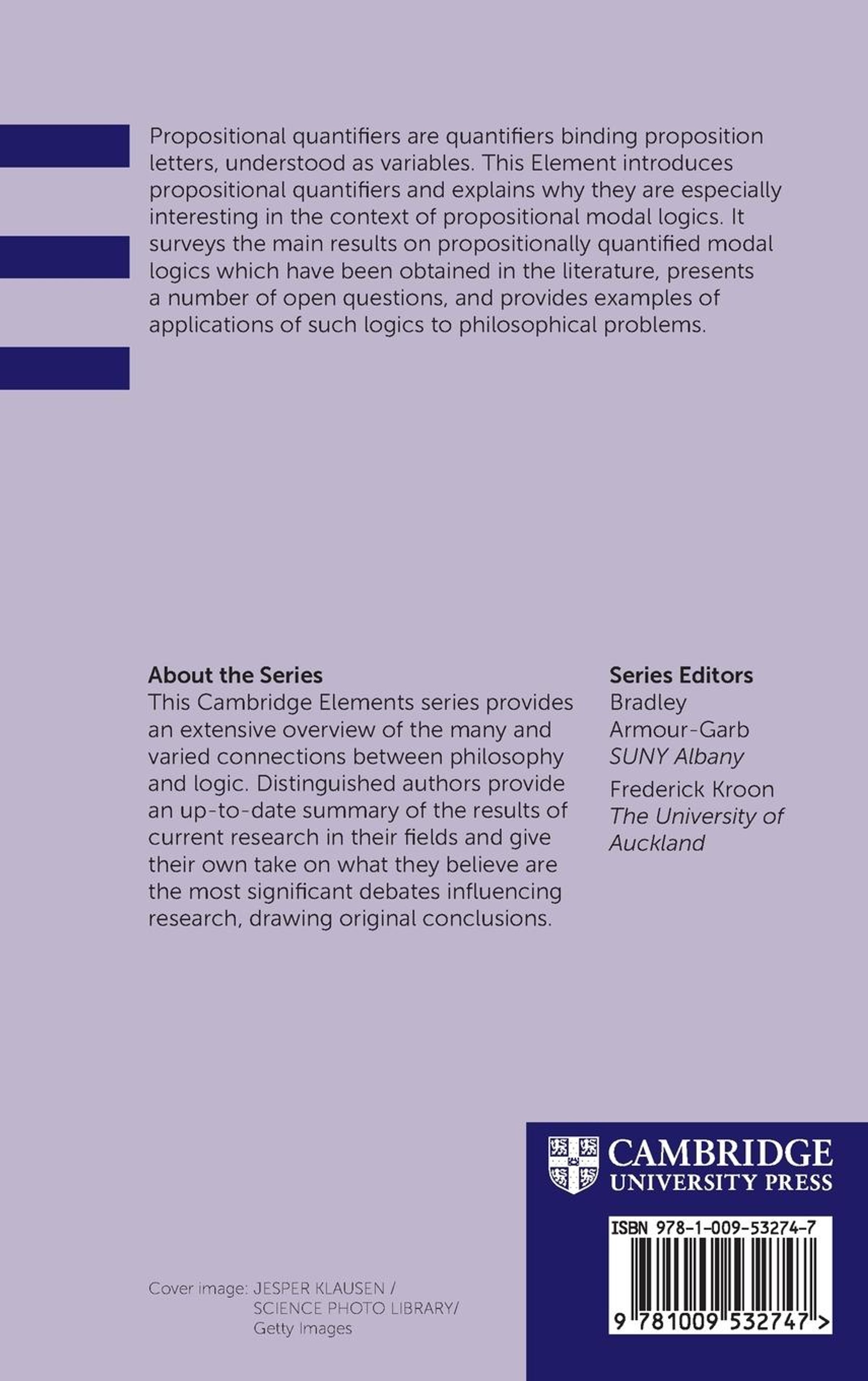 "Propositional quantifiers are quantifiers binding proposition letters, understood as variables. This Element introduces propositional quantifiers and explains why they are especially interesting in the context of propositional modal logics. It surveys the main results on propositionally quantified modal logics which have been obtained in the literature, presents a number of open questions, and provides examples of applications of such logics to philosophical problems"--