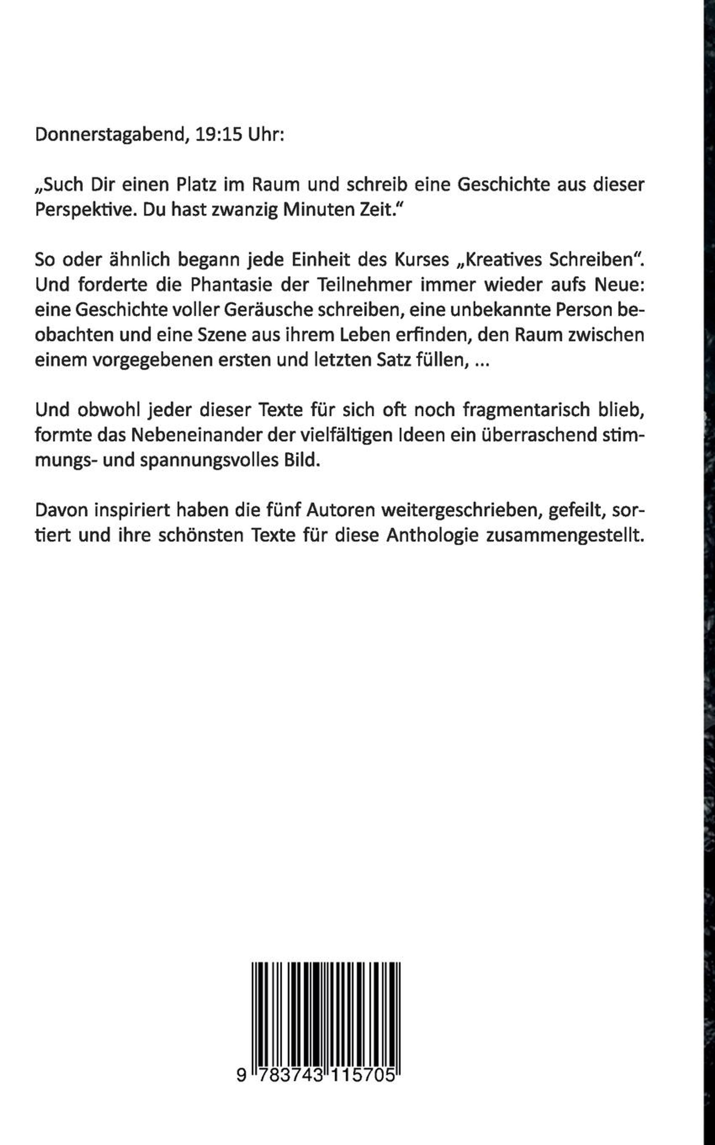 Donnerstagabend, 19: 15 Uhr: "Such Dir einen Platz im Raum und schreib eine Geschichte aus dieser Perspektive. Du hast zwanzig Minuten Zeit." So oder ähnlich begann jede Einheit des Kurses "Kreatives Schreiben". Und forderte die Phantasie der Teilnehmer immer wieder aufs Neue: eine Geschichte voller Geräusche schreiben, eine unbekannte Person beobachten und eine Szene aus ihrem Leben erfinden, den Raum zwischen einem vorgegebenen ersten und letzten Satz füllen, ... Und obwohl jeder dieser Texte für sich oft noch fragmentarisch blieb, formte das Nebeneinander der vielfältigen Ideen ein überraschend stimmungs- und spannungsvolles Bild. Davon inspiriert haben die fünf Autoren weitergeschrieben, gefeilt, sortiert und ihre schönsten Texte für diese Anthologie zusammengestellt.