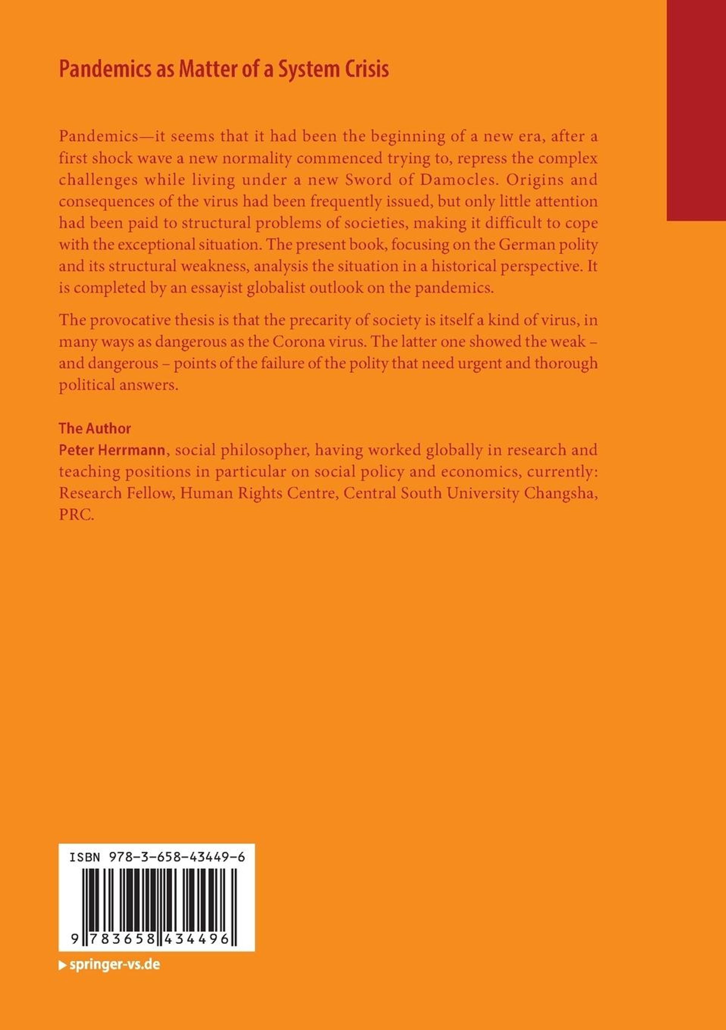 Pandemics ¿ it seems that it had been the beginning of a new era, after a first shock wave a new normality commenced trying to, repress the complex challenges while living under a new Sword of Damocles. Origins and consequences of the virus had been frequently issued, but only little attention had been paid to structural problems of societies, making it difficult to cope with the exceptional situation. The present book, focusing on the German polity and its structural weakness, analysis the situation in a historical perspective. It is completed by an essayist globalist outlook on the pandemics. The provocative thesis is that the precarity of society is itself a kind of virus, in many ways as dangerous as the Corona virus. The latter one showed the weak ¿ and dangerous ¿ points of the failure of the polity that need urgent and thorough political answers.