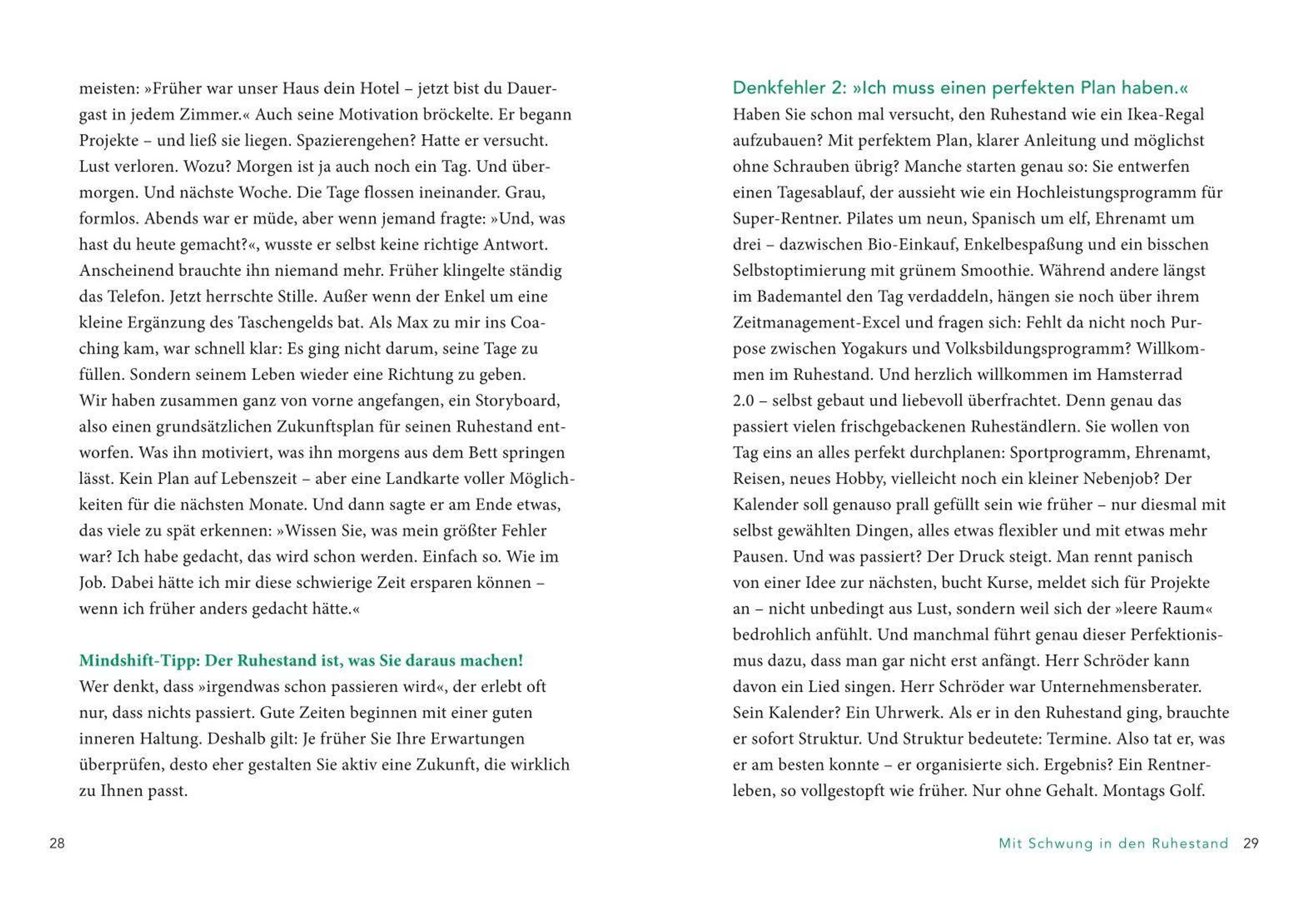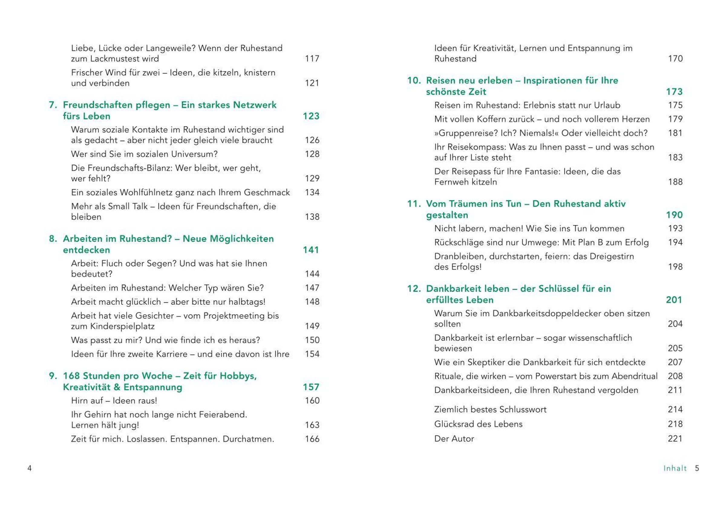 Peter Lennartz, erfahrener Coach für Ruheständler, kennt die Gedanken, die viele bewegen: Wie fülle ich plötzlich so viel freie Zeit sinnvoll? Was macht mich jetzt wirklich glücklich? Welche Herzenswünsche oder Interessen möchte ich endlich ausleben? Wie halte ich Körper und Geist in Schwung? Und wie bleibe ich mit anderen Menschen - mit Familie, Freunden und Bekannten - verbunden?