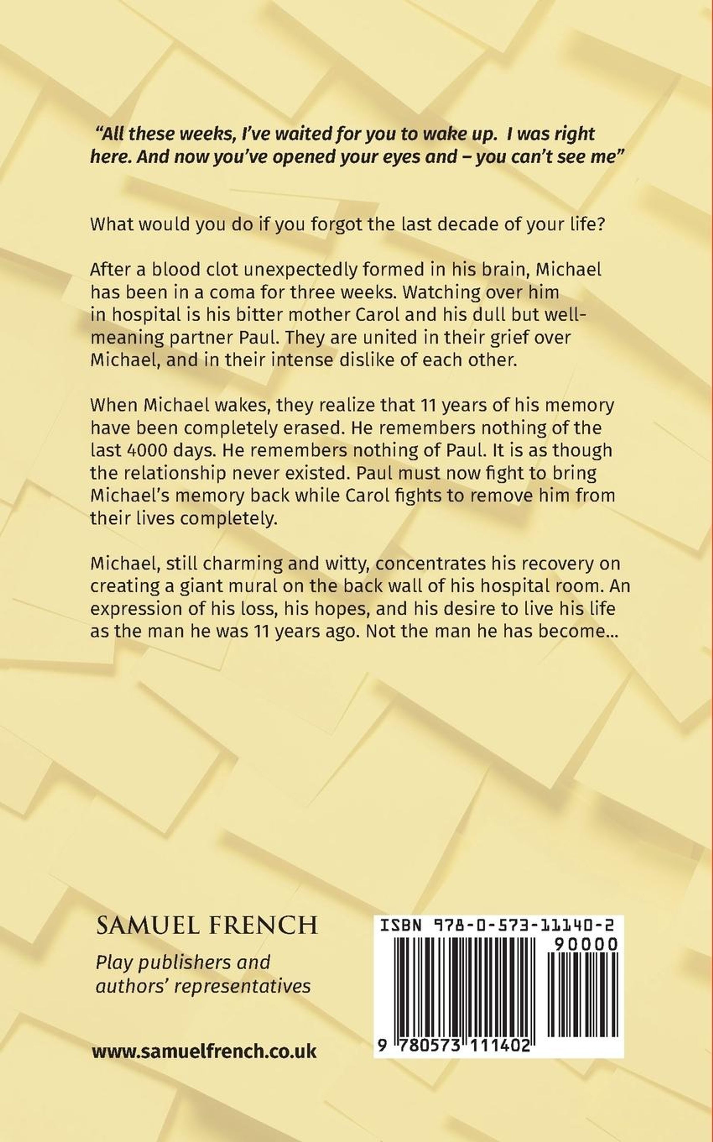 What would you do if you forgot the last decade of your life? After a blood clot unexpectedly formed in his brain, Michael has been in a coma for three weeks. Watching over him in hospital is his bitter mother Carol and his dull but well-meaning partner Paul. They are united in their grief over Michael, and in their intense dislike of each other. When Michael wakes, they realize that 11 years of his memory have been completely erased. He remembers nothing of the last 4000 days. He remembers nothing of Paul. It is as though the relationship never existed. Paul must now fight to bring Michael's memory back while Carol fights to remove him from their lives completely. Michael, still charming and witty, concentrates his recovery on creating a giant mural on the back wall of his hospital room. An expression of his loss, his hopes, and his desire to live his life as the man he was 11 years ago. Not the man he has become...