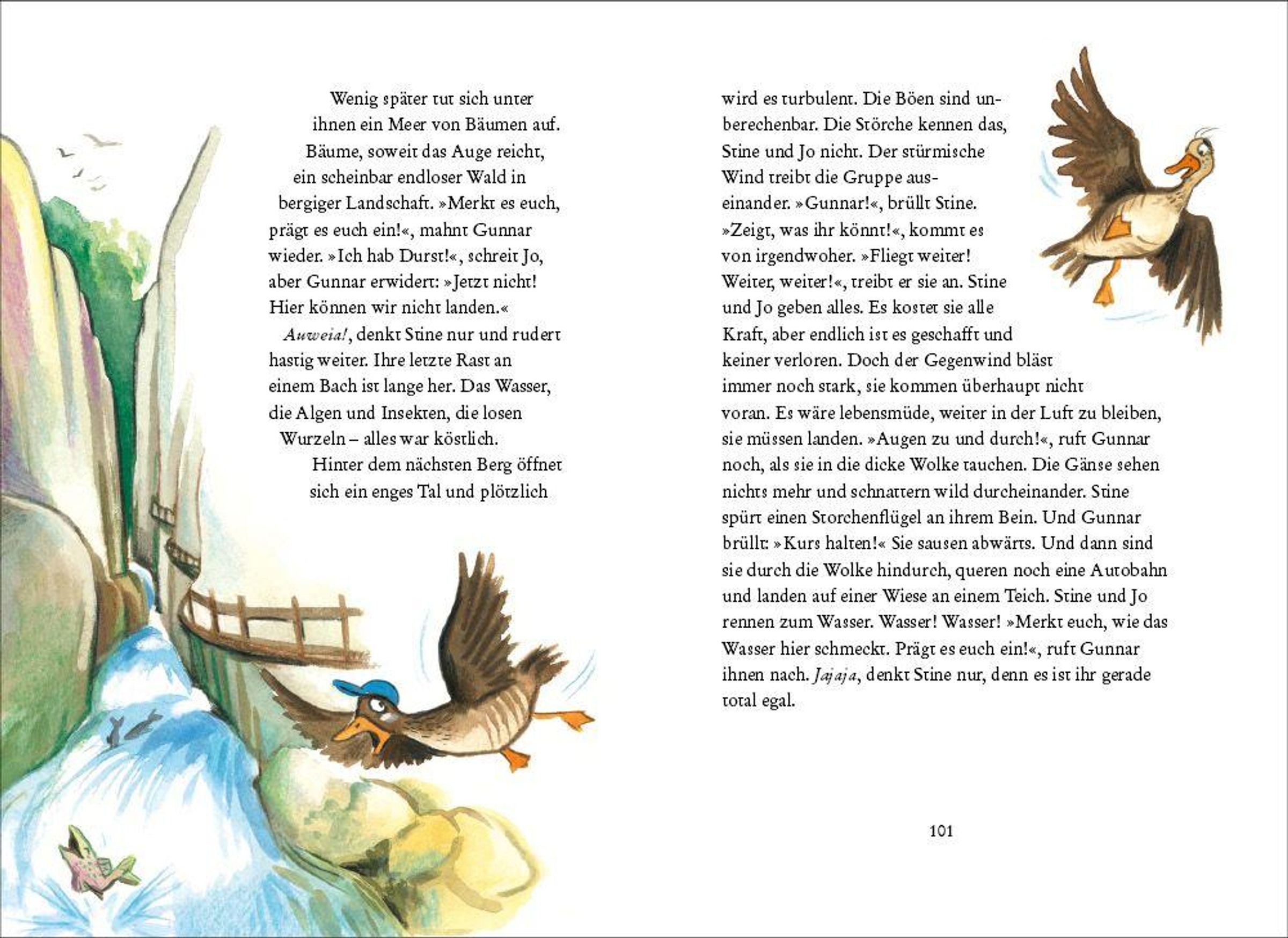 Nachdem Stine den Abflug der anderen Gänse in den Süden verpasst hat, wird es gegen Ende des Sommers empfindlich kalt. Wo sind alle hin? Da hält plötzlich ein Zug, in dem Stine auf ein wildes Durcheinander trifft, ein Ticket hat sie auch nicht. Zum Glück begegnet sie Jo, der ihr hilft. Doch als die beiden Gänse den Zug verlassen müssen und weiterfliegen, zeigt sich, dass auch Jo auf Stine angewiesen ist. ...