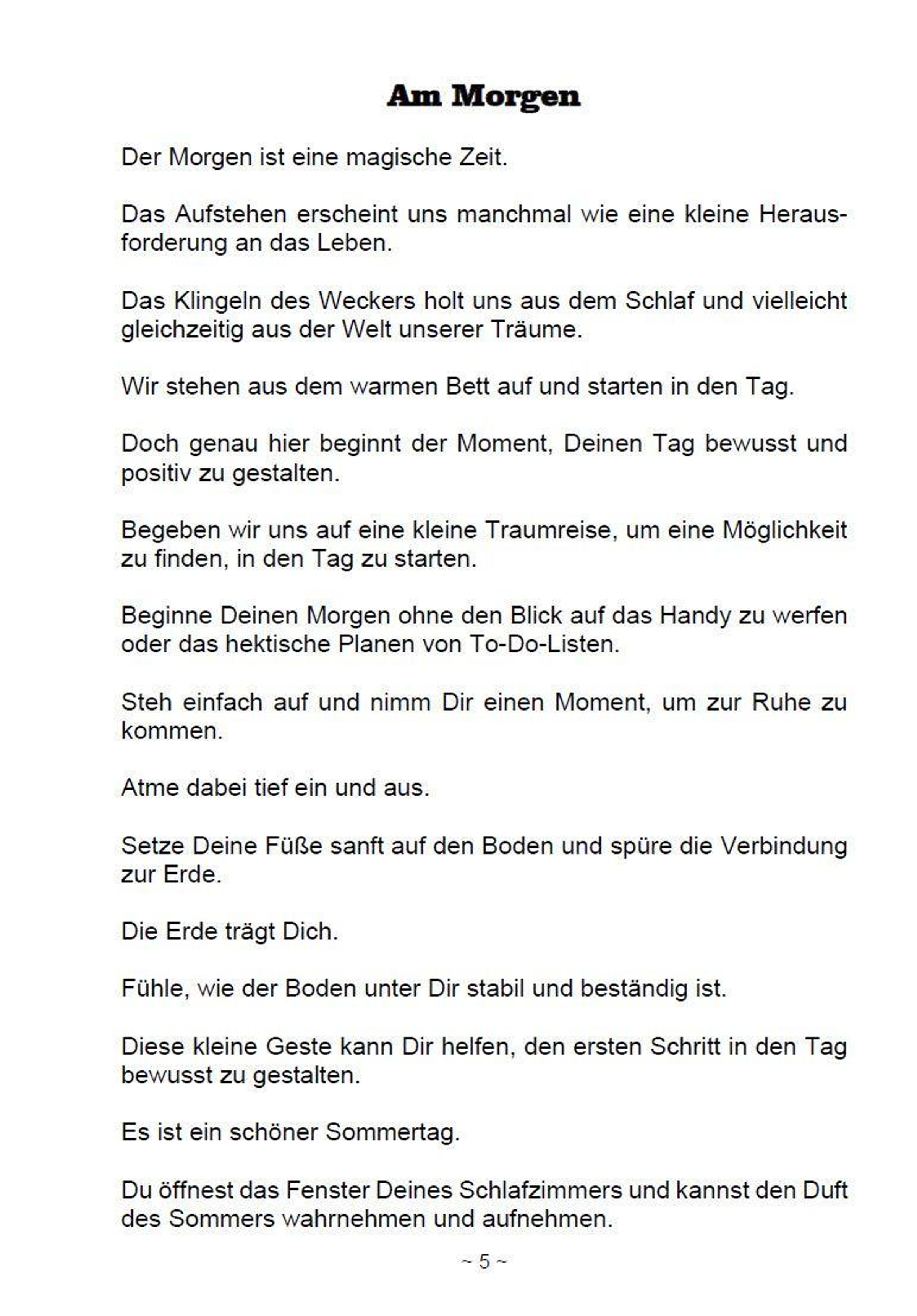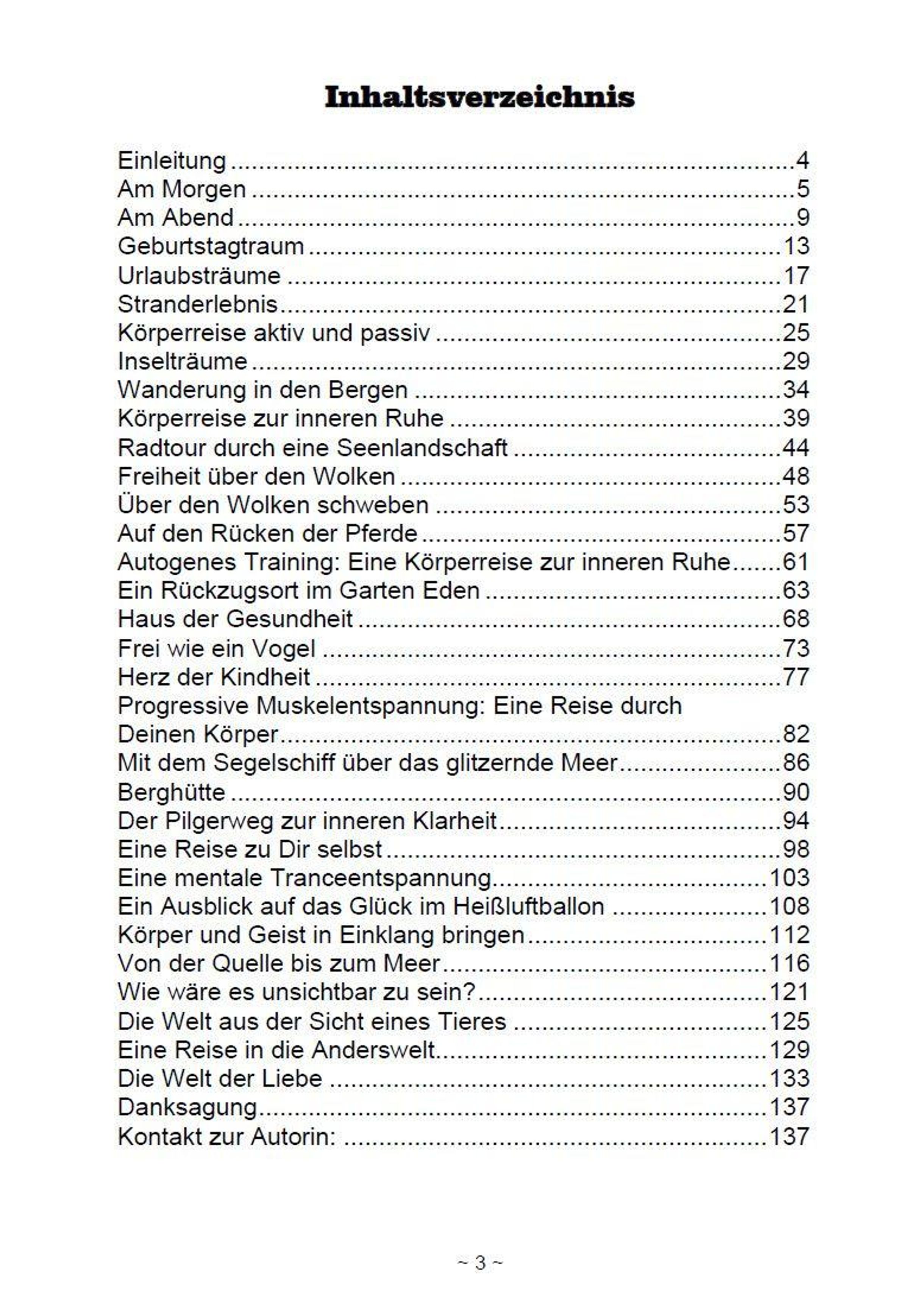 Am Morgen Am Abend Geburtstagstraum Urlaubsträume Stranderlebnis Körperreise aktiv und passiv Inselträume Wanderung in den Bergen Körperreise zur inneren Ruhe Radtour durch eine Seenlandschaft Freiheit über den Wolken Über den Wolken schweben Auf den Rücken der Pferde Eine Körperreise zur inneren Ruhe Rückzugsort Garten Eden Haus der Gesundheit Frei wie ein Vogel Herz der Kindheit Eine Reise durch den Körper Mit dem Segelschiff über das glitzernde Meer Berghütte Der Pilgerweg zur inneren Klarheit Eine Reise zu Dir selbst Eine mentale Tranceentspannung Glück im Heißluftballon Körper und Geist in Einklang bringen Von der Quelle zum Meer Wie wäre es unsichtbar zu sein? Die Welt aus der Sicht eines Tieres Eine Reise in die Anderswelt Die Welt der Liebe