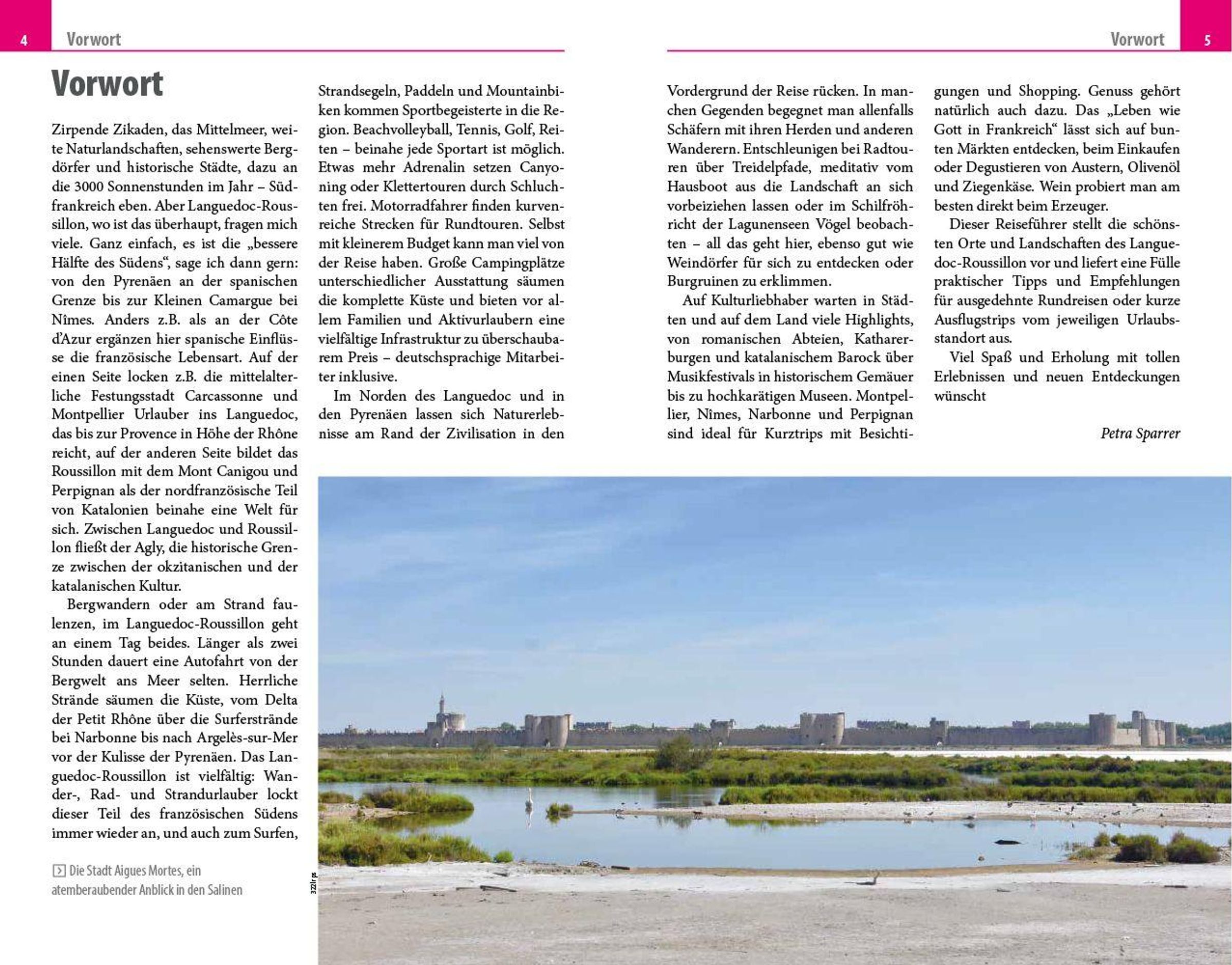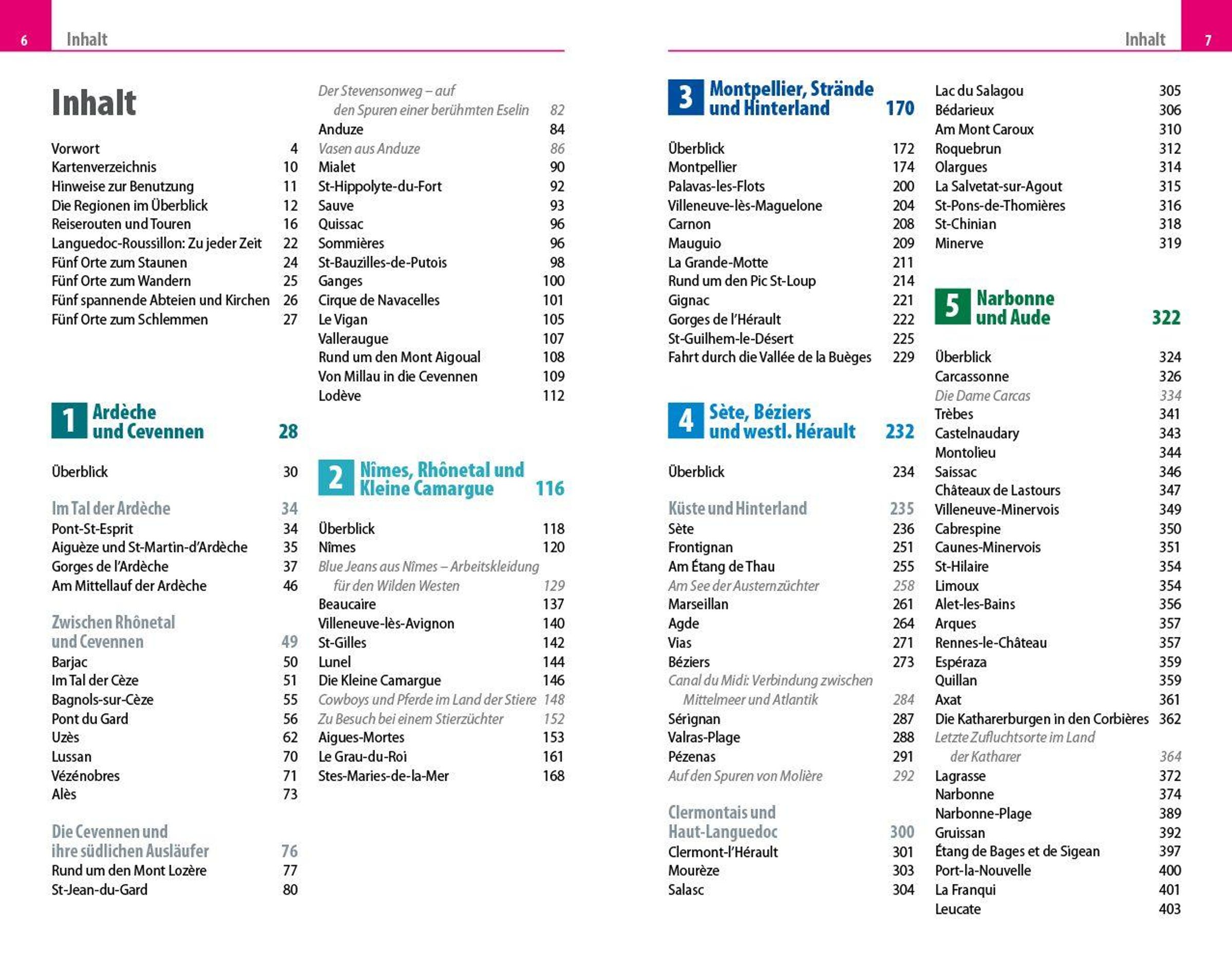 Übersichtsseiten mit den bedeutendsten Regionen im Überblick: Ardèche und Cevennen, Nîmes, Rhônetal und Kleine Camargue, Montpellier, Strände und Hinterland, Sète, Béziers und westliches Hérault, Narbonne und Aude sowie Perpignan und östliche Pyrenäen
