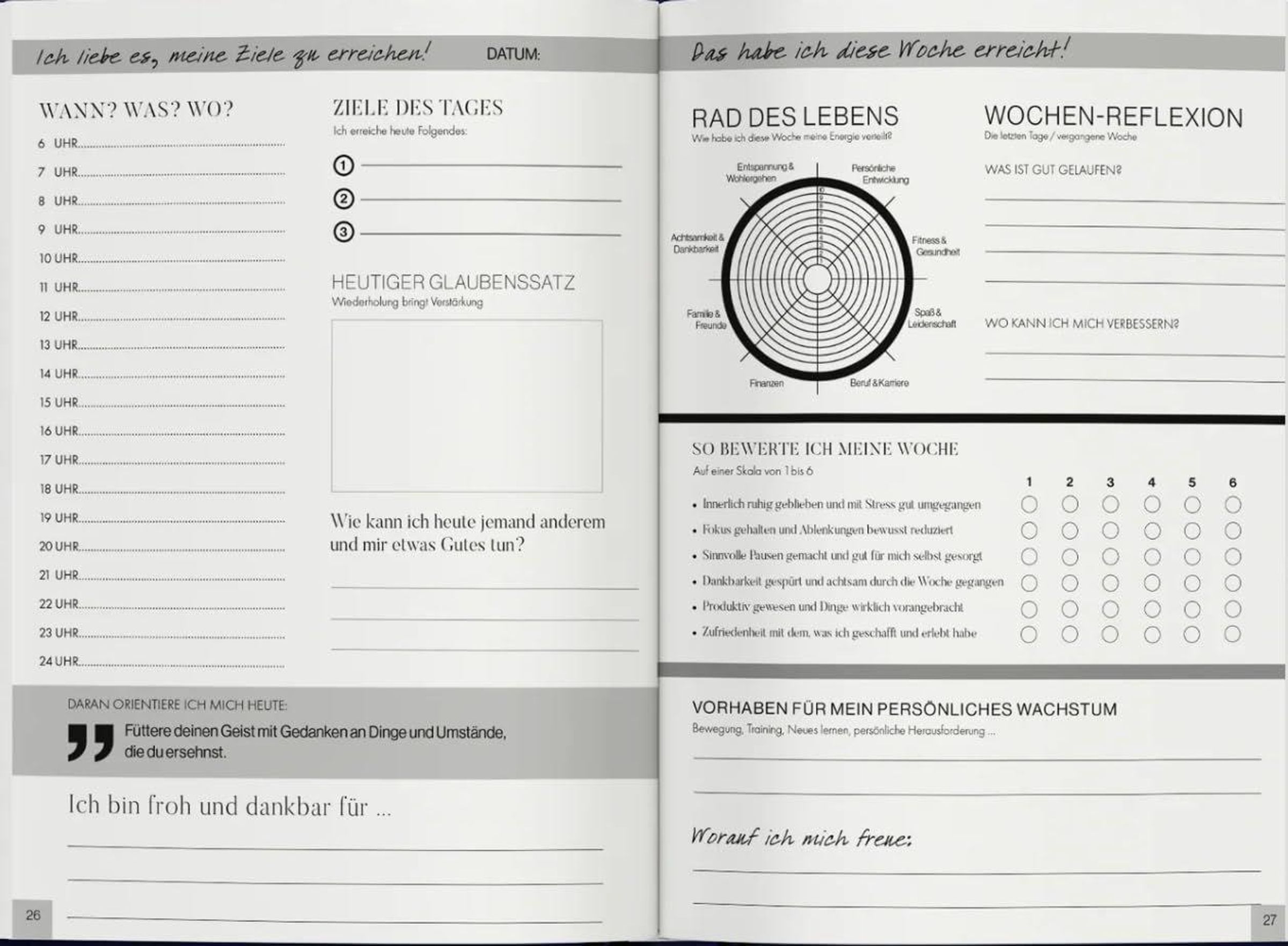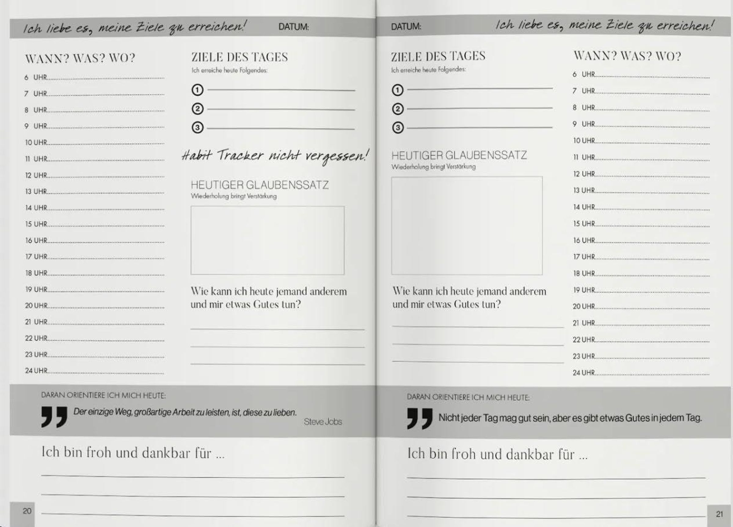 Das Erfolgsjournal ist weit mehr als nur ein Planer - es ist ein Werkzeug, das dir hilft, dein Leben mit minimalem Aufwand strukturierter und zielgerichteter zu gestalten. In diesem Journal sind all jene Methoden vereint, die Philip Hopf seit Jahren erfolgreich anwendet und die er als Schlüssel zu seinem Erfolg betrachtet. Es verbindet gezielte Tagesplanung mit Achtsamkeit und sorgt dafür, dass dein Erfolg nicht nur im beruflichen Bereich, sondern auch in deinem mentalen Wohlbefinden sichtbar wird. Das Erfolgsjournal hilft dir dabei, klare Ziele zu setzen, diese präzise zu formulieren und sie durch tägliche Arbeit sowie regelmäßige Reflexion systematisch zu erreichen. Schon wenige Minuten täglicher Anwendung reichen aus, um dein Leben nachhaltig zu verändern. Steigere deine Produktivität, erinnere dich an die Kraft der Dankbarkeit und nimm dir jeden Tag einen Moment, um über deinen Alltag nachzudenken - dein Erfolg wird nur noch eine Frage der Zeit sein!