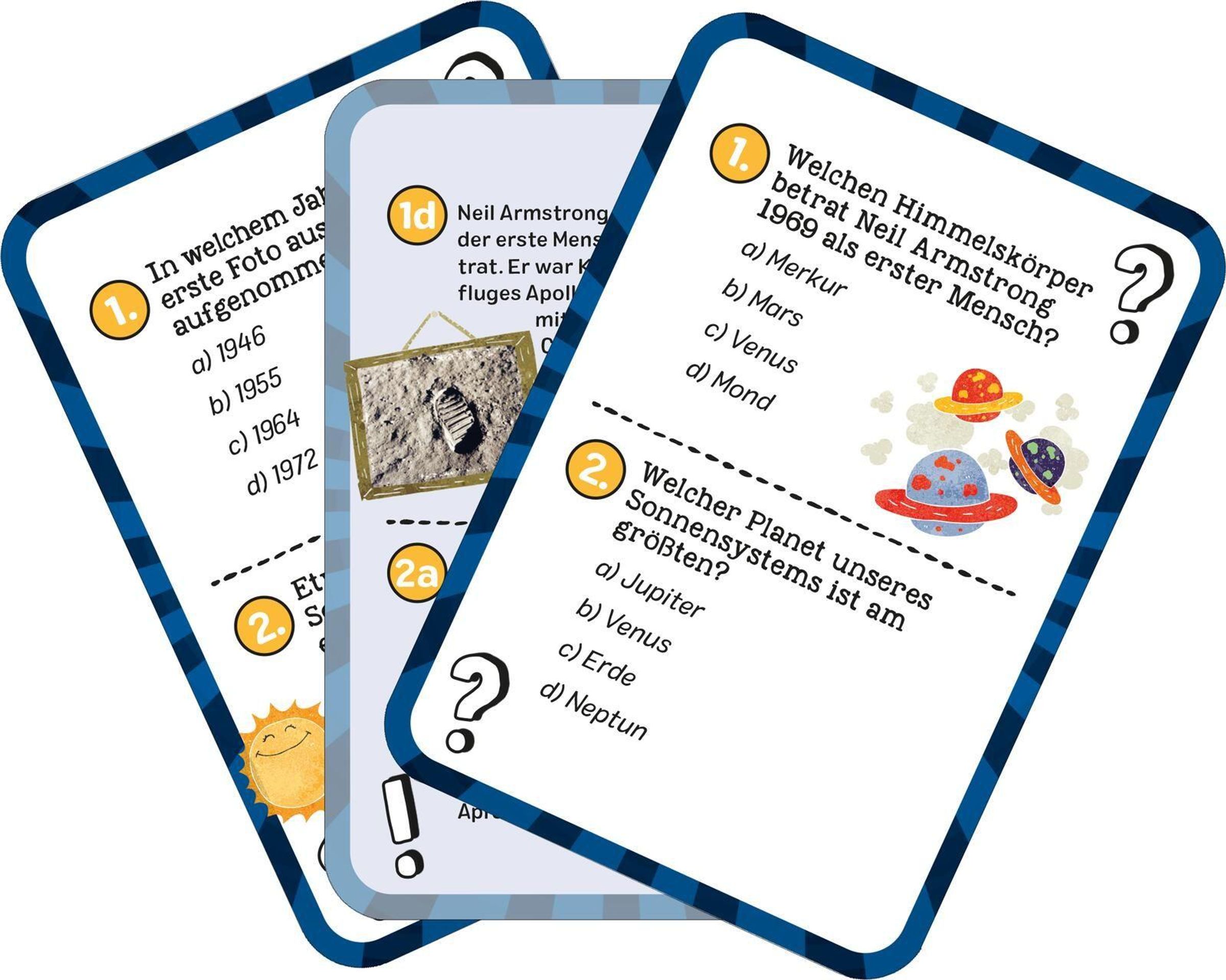 Mit vielen informativen Rätseln zum Weltraum auf 50 bunt illustrierten Quizkarten: Wie viele Planeten kreisen um die Sonne? Was sieht man am Nachthimmel, wenn "Neumond" ist? Wann wurde das erste Foto aus dem Weltall aufgenommen? Was müssen Astronauten im Weltall tragen? Dieses Wissens-Quiz bietet über 100 abwechslungsreiche Fragen und Antworten.