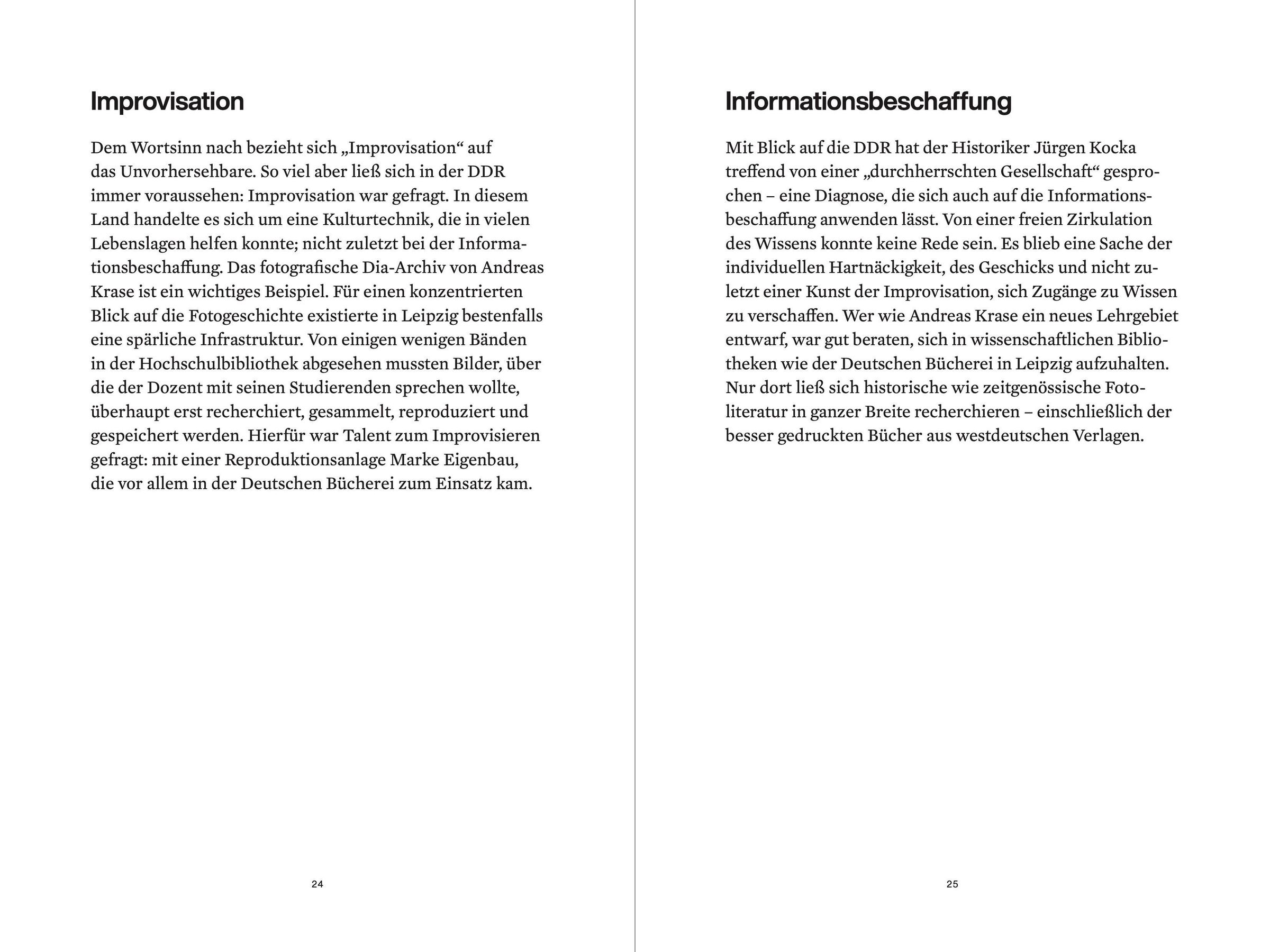 In Improvisierte Projektionen zeigen der Künstler Philipp Goldbach und der Fotohistoriker Steffen Siegel, wie in den späten Jahren der DDR Fotogeschichte erzählt worden ist. Von 1985 bis 1990 unterrichtete Andreas Krase an der Leipziger Hochschule für Grafik und Buchkunst und legte hierfür mit improvisierten Mitteln eine Diathek an. In ihrem visuell und lexikalisch angelegten Projekt überführen Goldbach und Siegel die Diathek in eine künstlerische Ordnung eigenen Rechts - ein neuer KONTEXT-Band, der über die Möglichkeiten und Grenzen der Wissenszirkulation in der späten DDR nachdenken lässt.