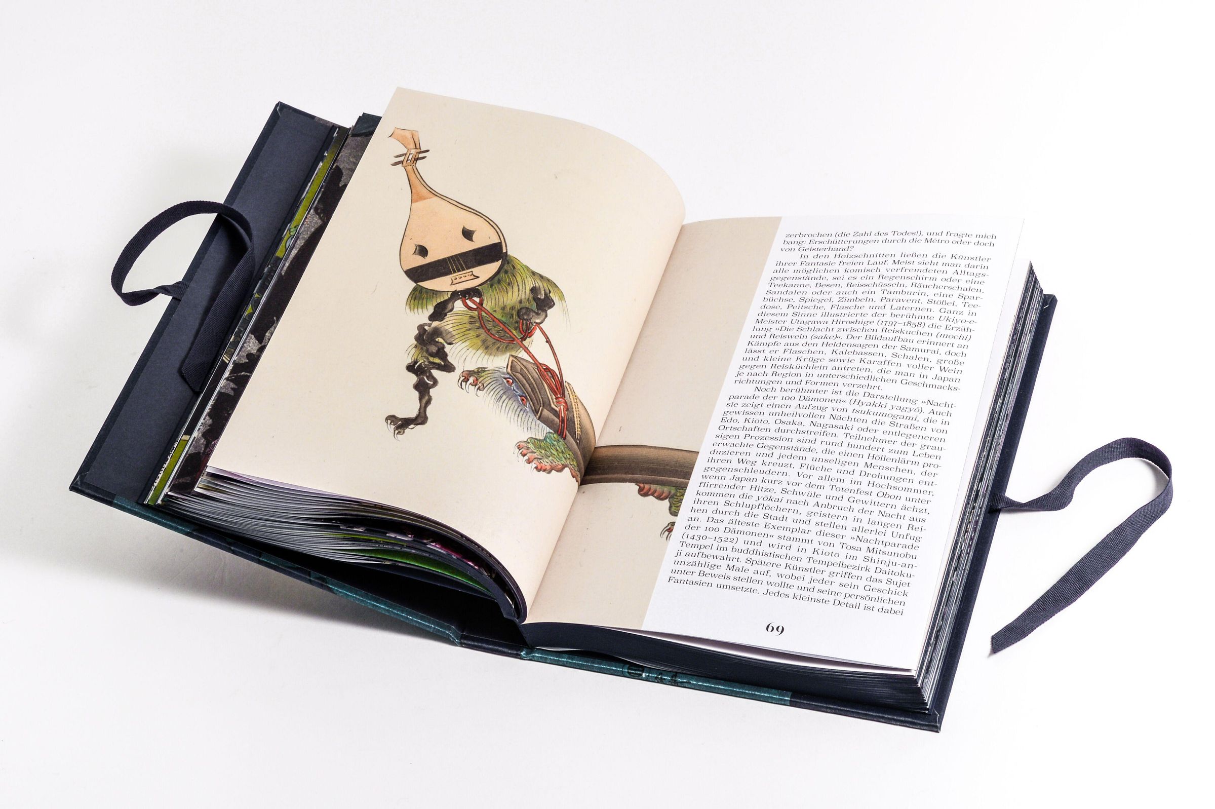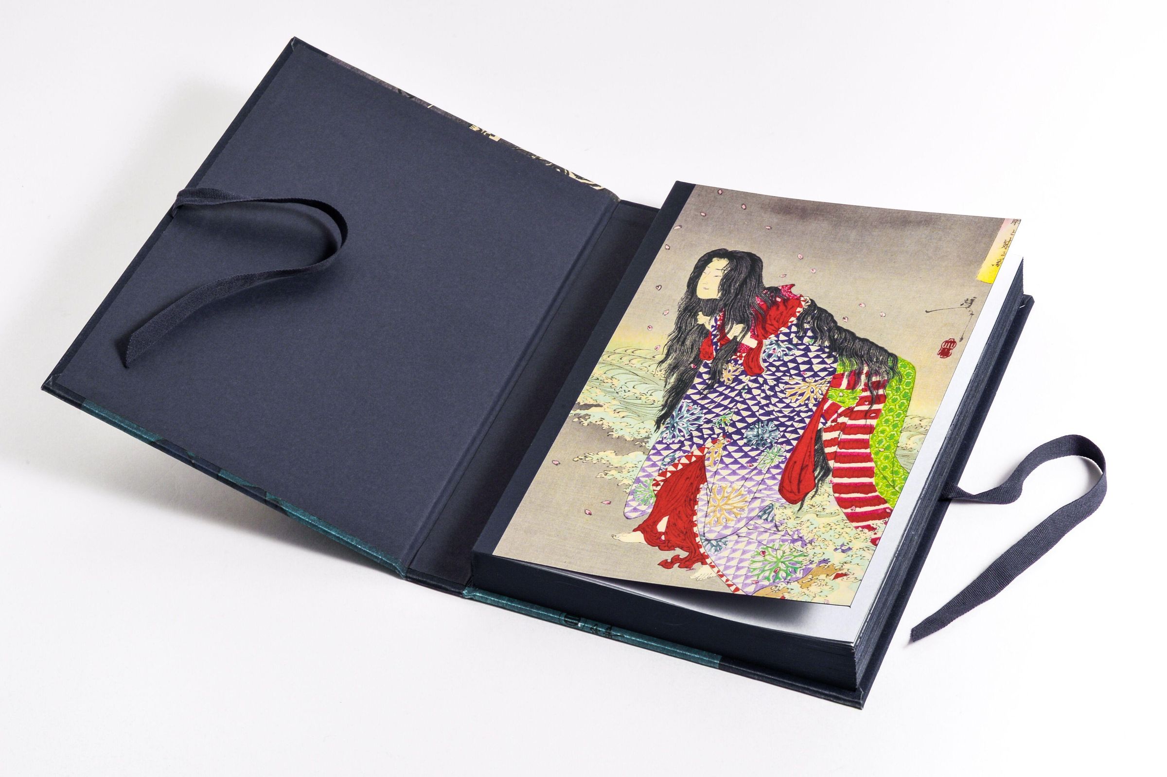 - in Werken der japanischen Holzschnittkunst - vereint in einer prachtvollen Ausgabe mit Seidenüberzug, schwarzem Farbschnitt und Verschlussbändchen mit japanischer Schlauchbindung