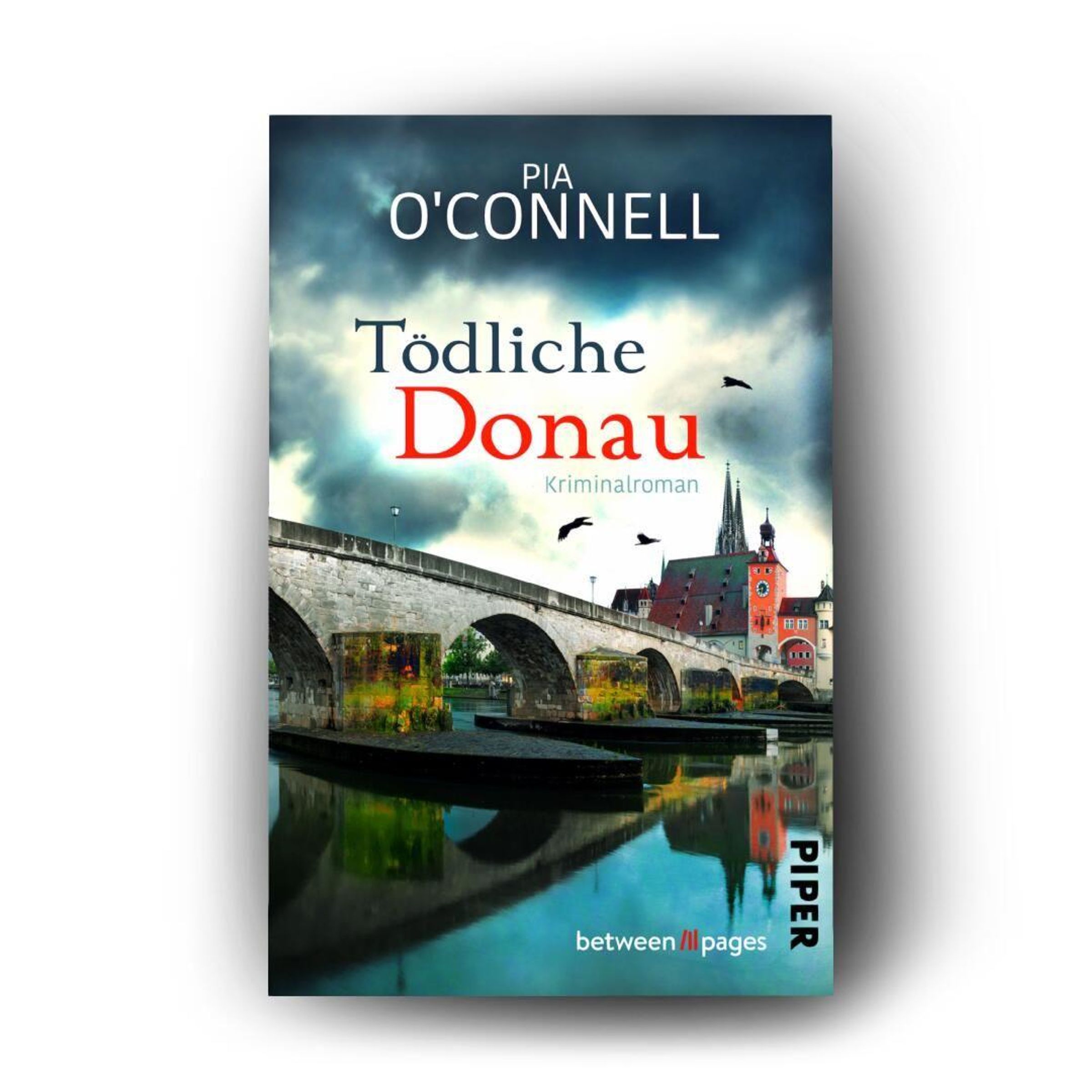 "Tödliche Donau: Kriminalroman" von Pia O'Connell. Eine alte Steinbrücke mit einer Stadt im Hintergrund, Vögel fliegen., Buch