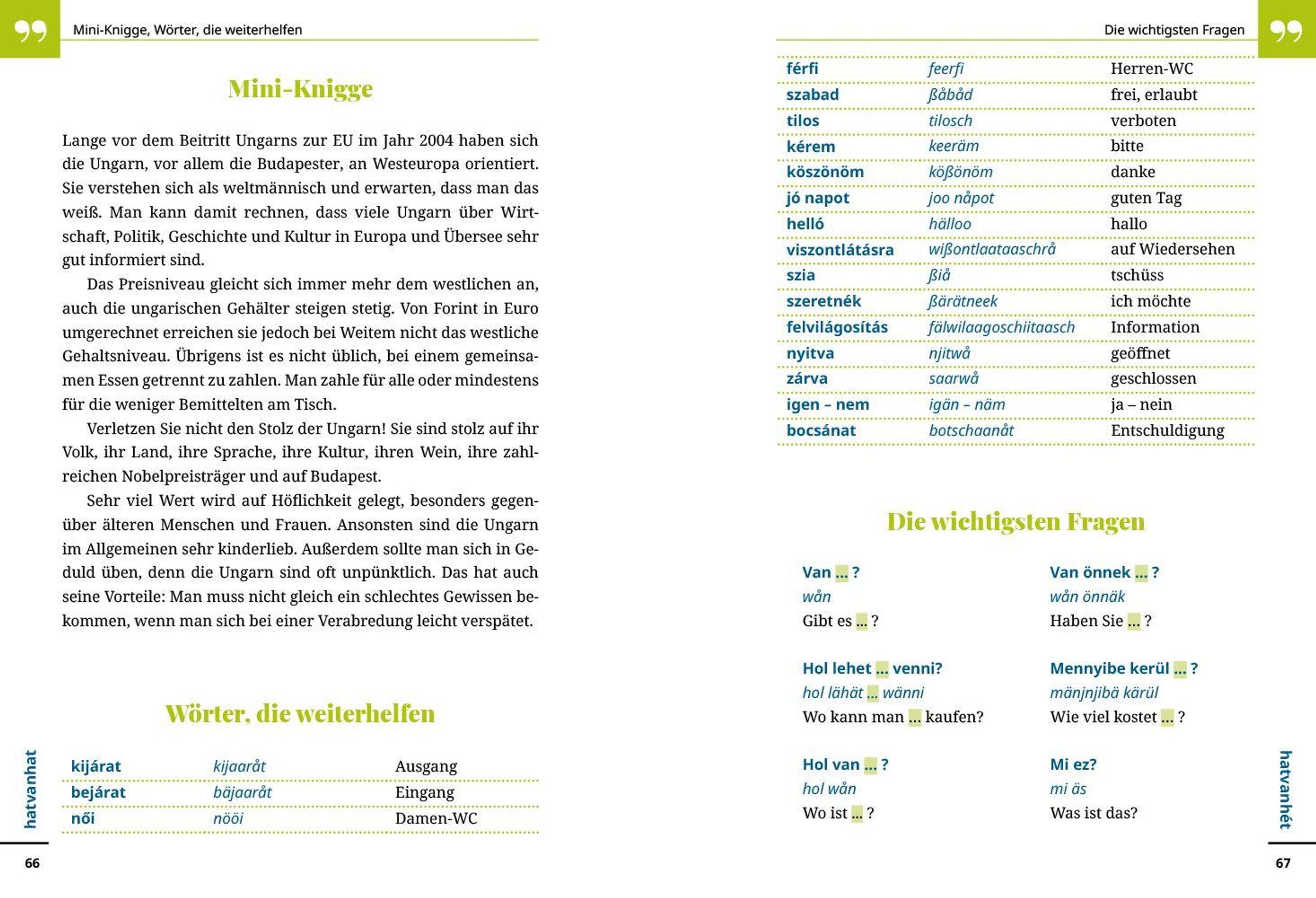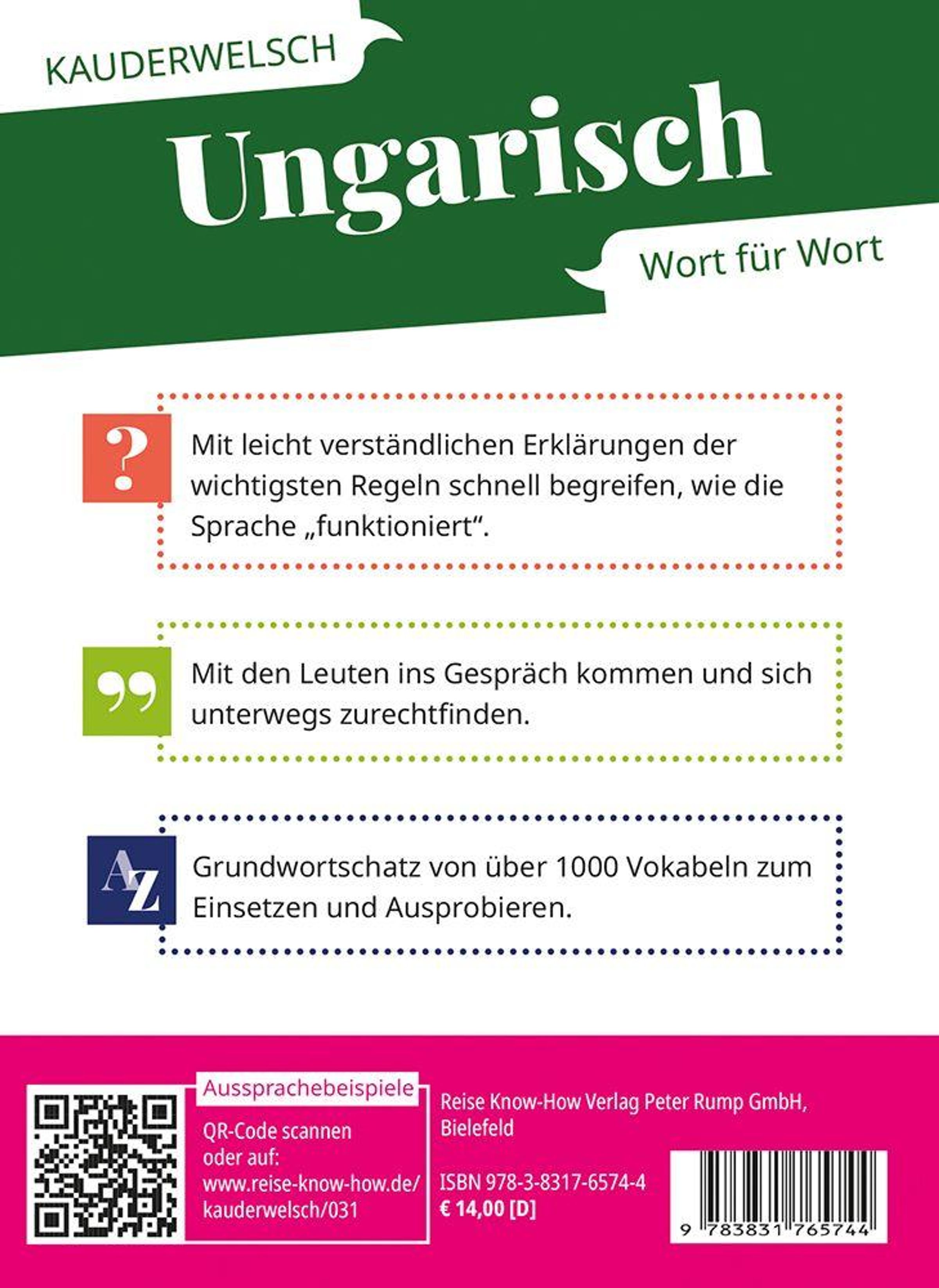 Ihre Besonderheit möglichst viel in einem Wort unterzubringen, hat dem Ungarischen den Ruf eingebracht, eine schwer zu erlernende Sprache zu sein. Dieser Kauderwelsch Sprachführer Ungarisch beweist das Gegenteil und zeigt, mit welch einfachen Prinzipien in Kürze erste Sätze gebildet werden können. Nach dem bewährten Kauderwelsch-Prinzip werden gängige Redewendungen neben einer sinngemäßen Übersetzung auch Wort für Wort übersetzt. So erwerben Anfänger und Einsteiger ein natürliches Sprachverständnis, einzelne Wörter lassen sich unkompliziert austauschen und Phrasen situationsbezogen anpassen. Das Buch vermittelt unterhaltsame Fakten zur Sprache und stimmt auf landestypische Besonderheiten ein. Die Texte wurden für diese Auflage grundlegend aktualisiert, so dass die Vokabeln den heutigen Reisealltag, gesellschaftlich relevante Themen und aktuelle Freizeitaktivitäten abdecken. Selbstverständlich wird auch die Grammatik kurz und verständlich erklärt, soweit es für das alltägliche Sprechen notwendig ist. Die eingebundenen QR-Codes verbinden das Buch mit Online-Aussprachebeispielen. Kauderwelsch-Sprachführer sind daher auch ergänzend zu Sprachkursen wertvolle Begleiter.