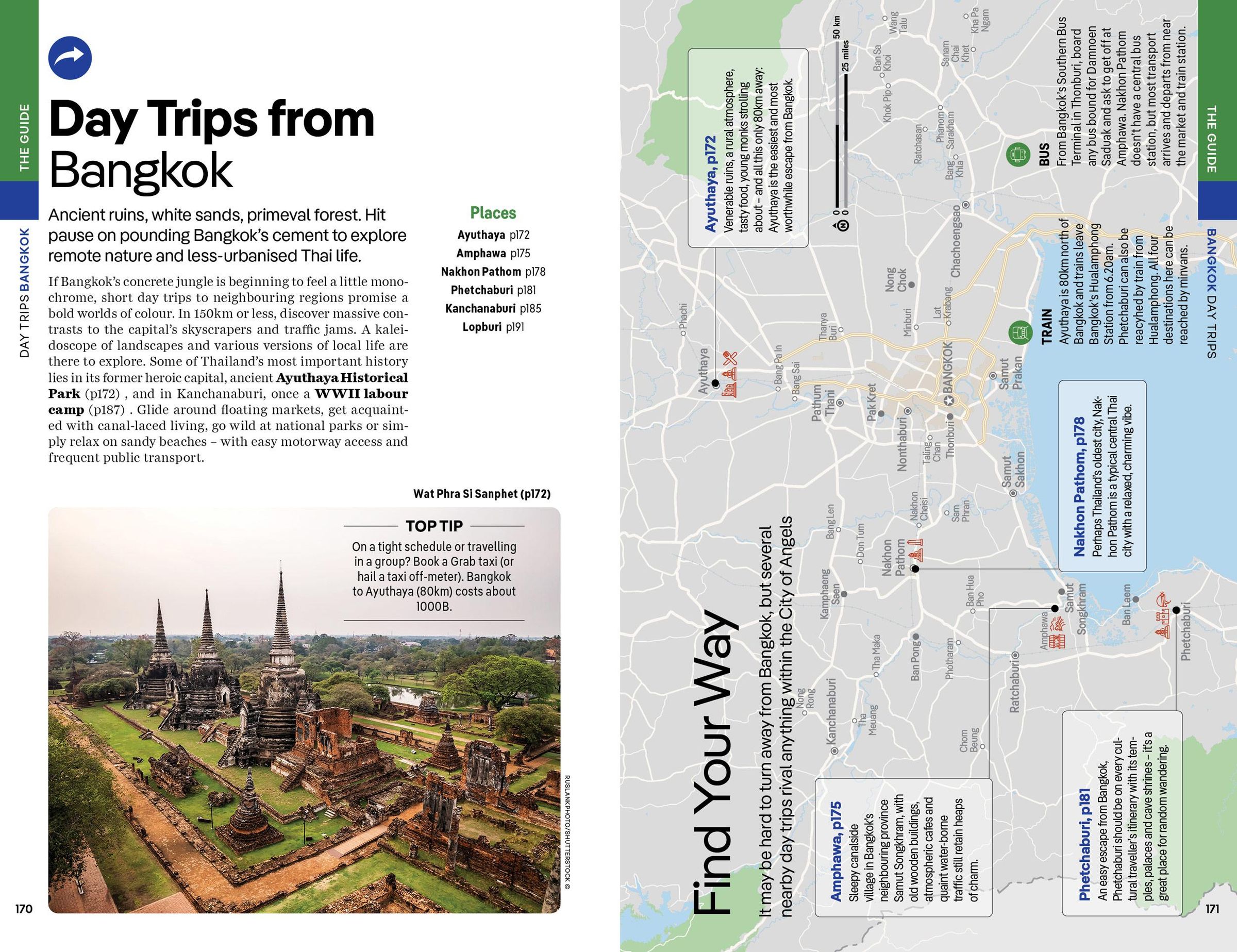 - Covers Ko Ratanakosin & Thonburi; Banglamphu; Thewet & Dusit; Chinatown; Siam Square, Pratunam, Phloen Chi & Ratchathewi; Riverside, Silom & Lumphini; Sukhumvit; Northern Bangkok plus day trips to Ayuthaya; Amphawa; Nakhon Pathom; Phetchaburi; Kanchanaburi; Lop Buri
