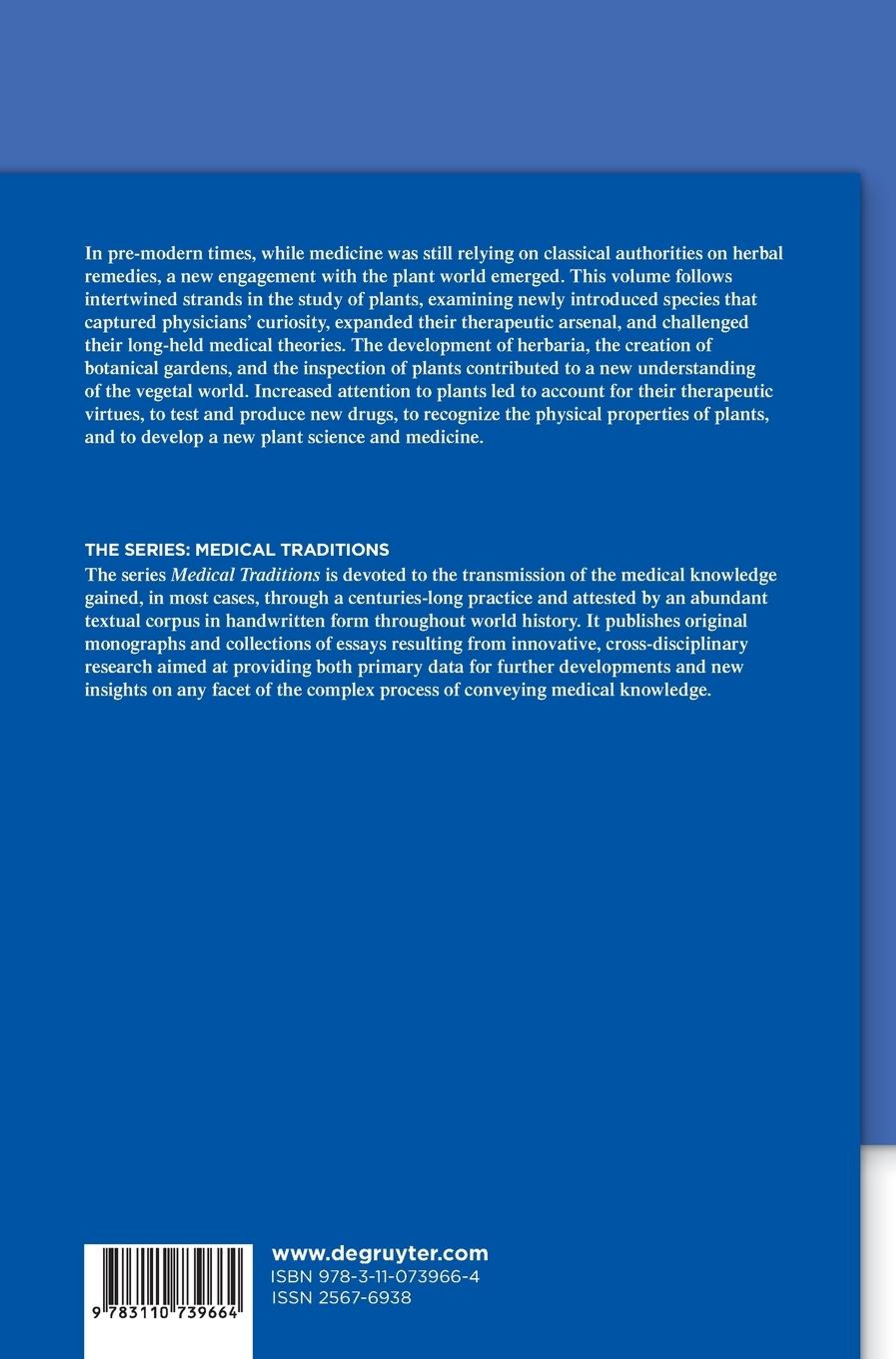 This volume collects essays on the various and multifaceted role the study of botany played as a branch of the medical discipline in the early modern time. Dealing with the methodologies of transmitting botanical knowledge, the practices with plants, and the attempts to reinforce or rebuke medical traditions, the contributions to this volume focus on the material study of plants in the period of the scientific revolution.