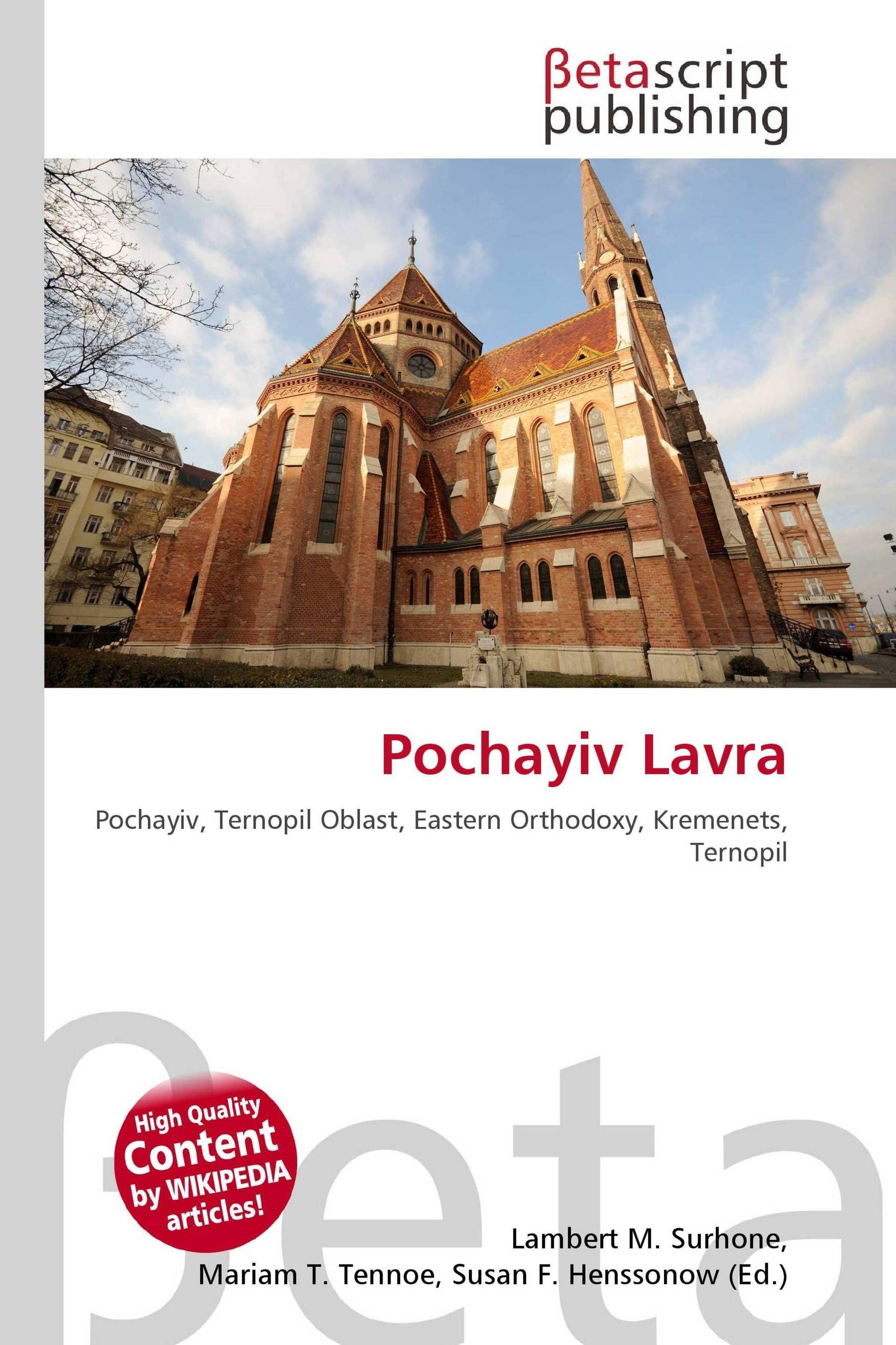 Please note that the content of this book primarily consists of articles available from Wikipedia or other free sources online. Holy Dormition Pochayiv Lavra (Ukrainian: - ; Russian: - ) has for centuries been the foremost spiritual and ideological centre of various Orthodox denominations in Western Ukraine. The monastery tops a 60-metre hill in the town of Pochayiv, Ternopil Oblast, 18 km southwest of Kremenets and 50 km north of Ternopil. A first record of the monastery in Pochayiv dates back to 1527, although a local tradition claims that it was established three centuries earlier, during the Mongol invasion, by several runaway monks, either from the Kiev Monastery of the Caves or from the Holy Mountain. The legend has it that the Theotokos appeared to the monks in the shape of a column of fire, leaving her footprint in the rock she stood upon. This imprint came to be revered by the local population and brethren for the curative, medicinal properties of the water that issued from it. In the 16th century, the abbey was prosperous enough to commission a stone cathedral and to host a busy annual fair.