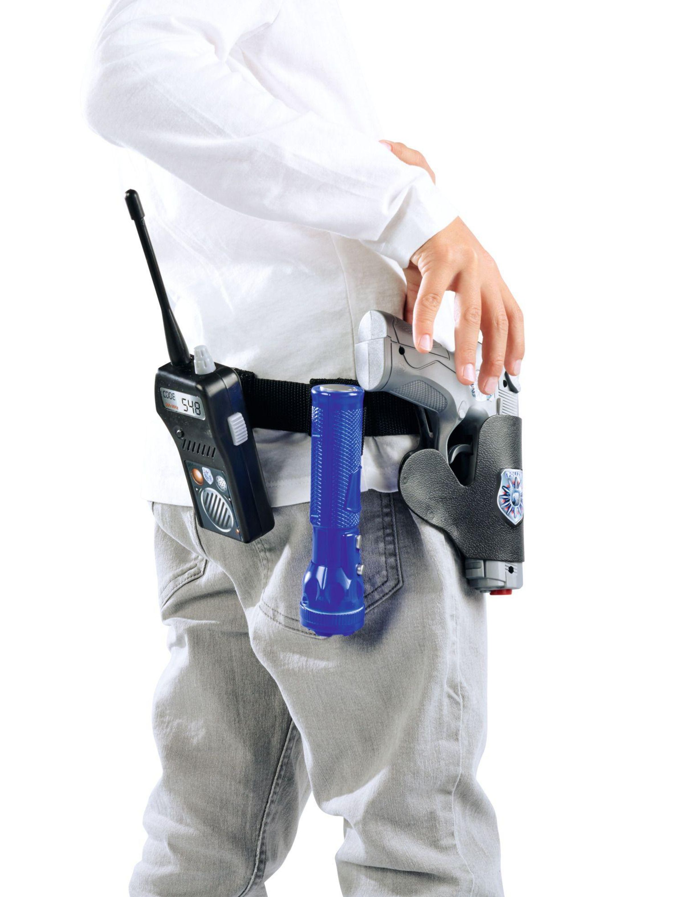 Wenn kleine Polizisten auf Streife gehen, benötigen sie die richtige Ausrüstung. Mit Gürtel, Handschellen, Funkgerät, Pistole und Pistolentasche ist jeder Polizist perfekt ausgerüstet. Der Gürtel ist von 40-80cm stufenlos verstellbar. Für Kinder ab 3 Jahren geeignet.