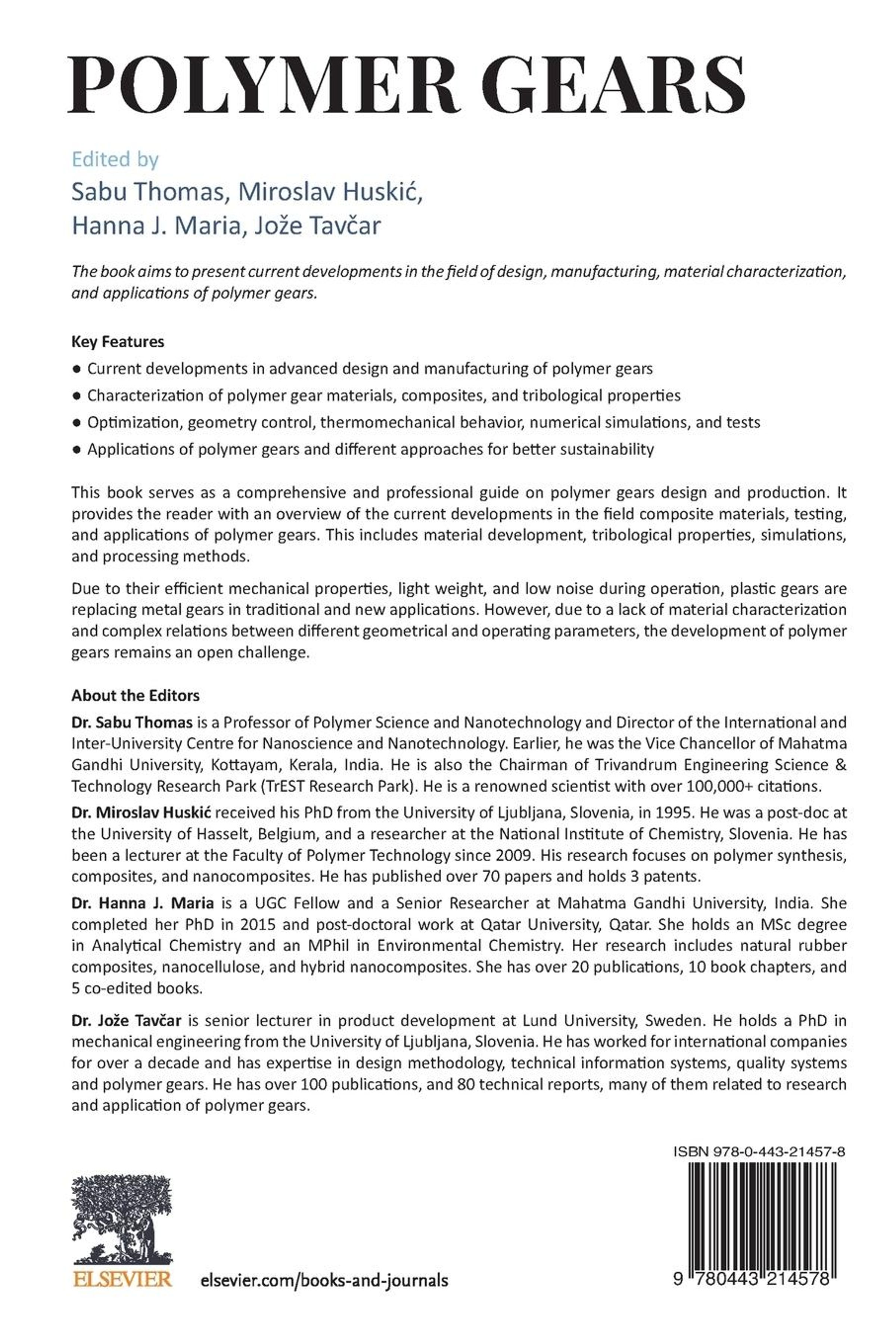 Polymer Gears discusses polymer gear design and their efficient mechanical properties, light weight, and low noise during operation. As plastic gears are replacing metallic gears in traditional and new applications, there is still lack of material characterization and complex relations between different geometric and operating parameters. Thus, polymer gear design remains an open challenge. This book serves as a comprehensive and professional guide on the topic, providing readers with current developments carried out in the field of plastic gears production, characterization, and applications. This will include material development, tribological properties, simulations, and processing methods.Biografie (Sabu Thomas)