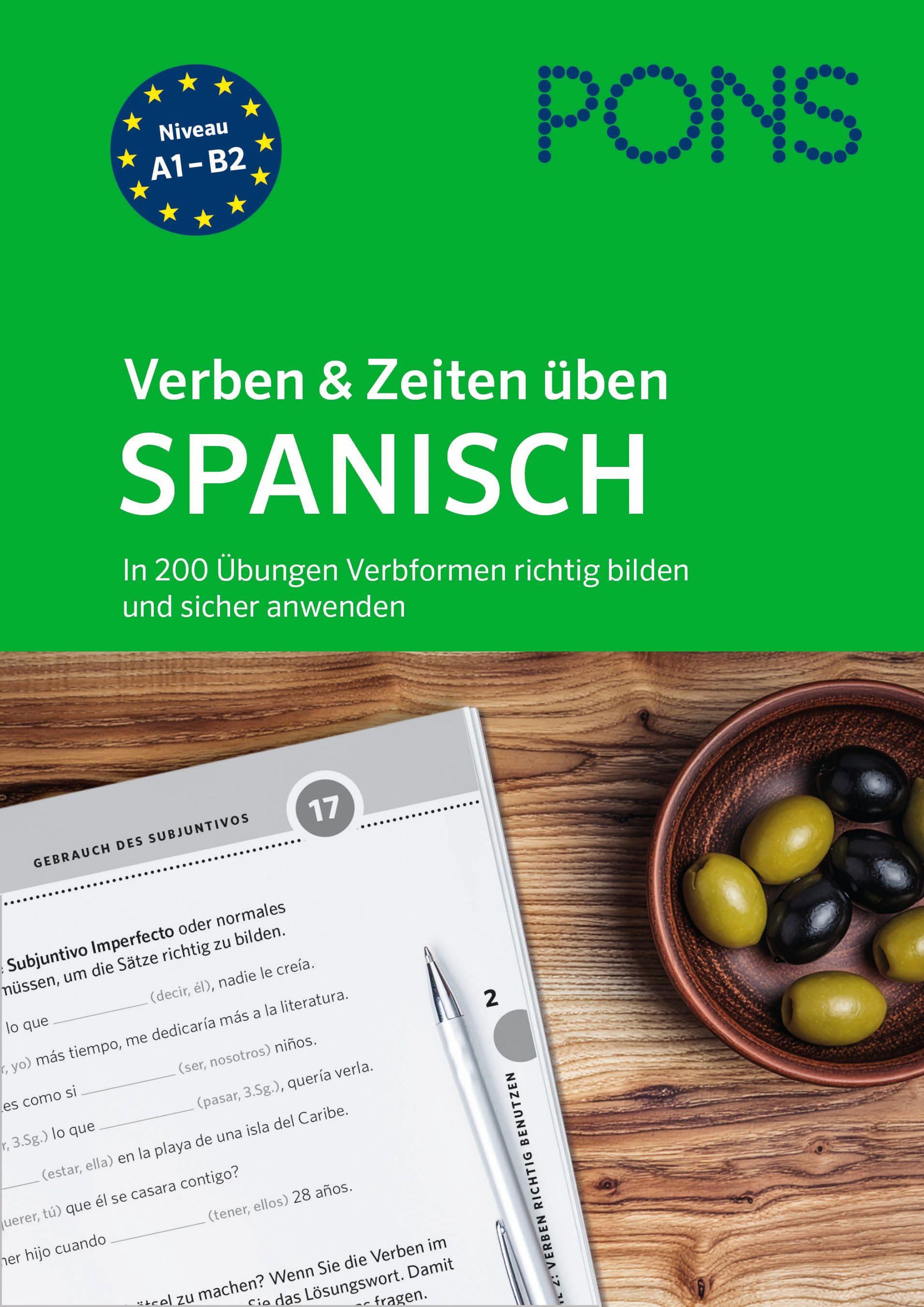 PONS Spanisch Buchcover, grüner Hintergrund, Texte zu Sprachübungen, darunter Olivenschale und geöffnete Buchseite., Buch