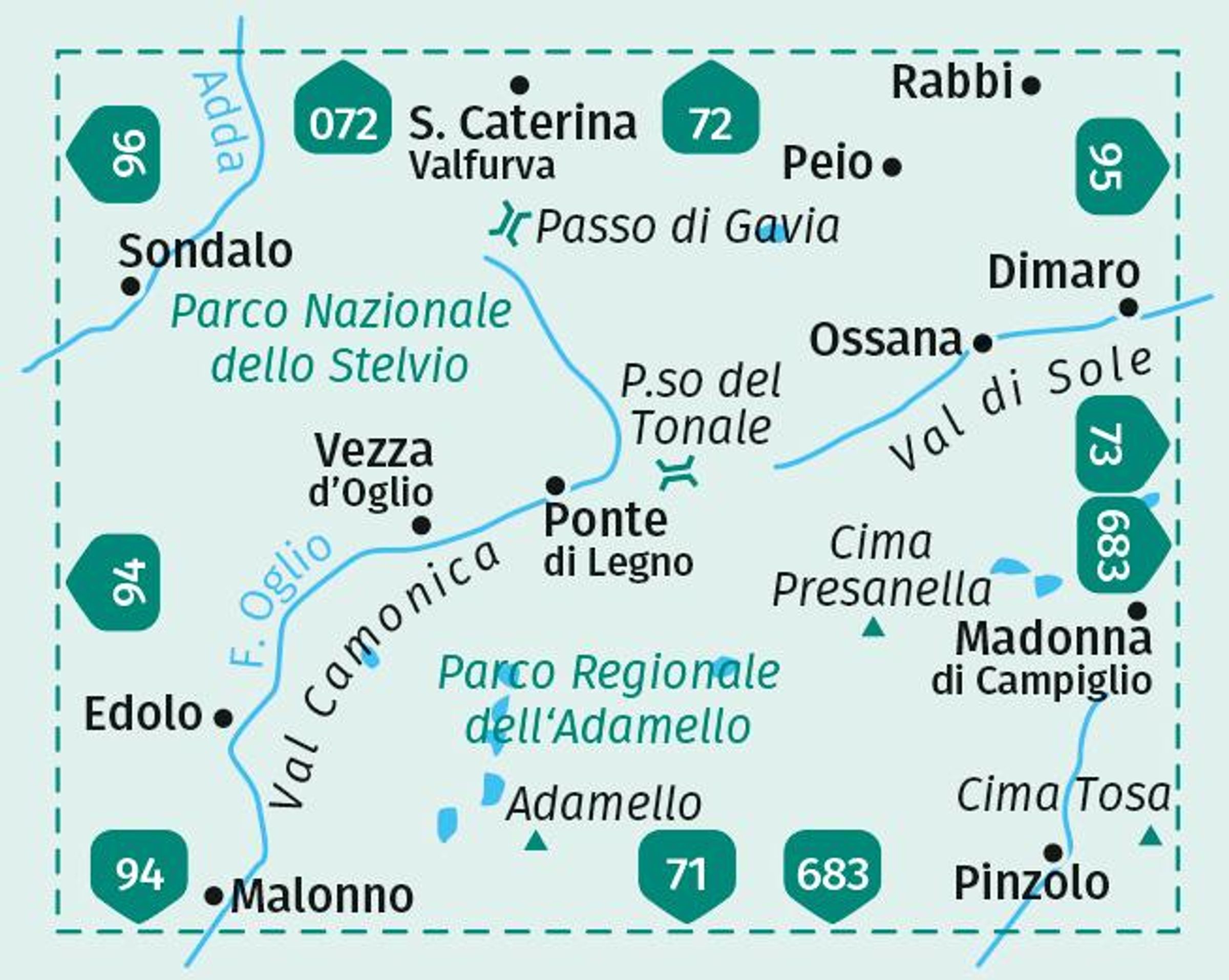 Ausstattung der Wanderkarte Ponte di Legno, Alta Val Camonica, Passo del Tonale, Val di Vermiglio, Val Genova: