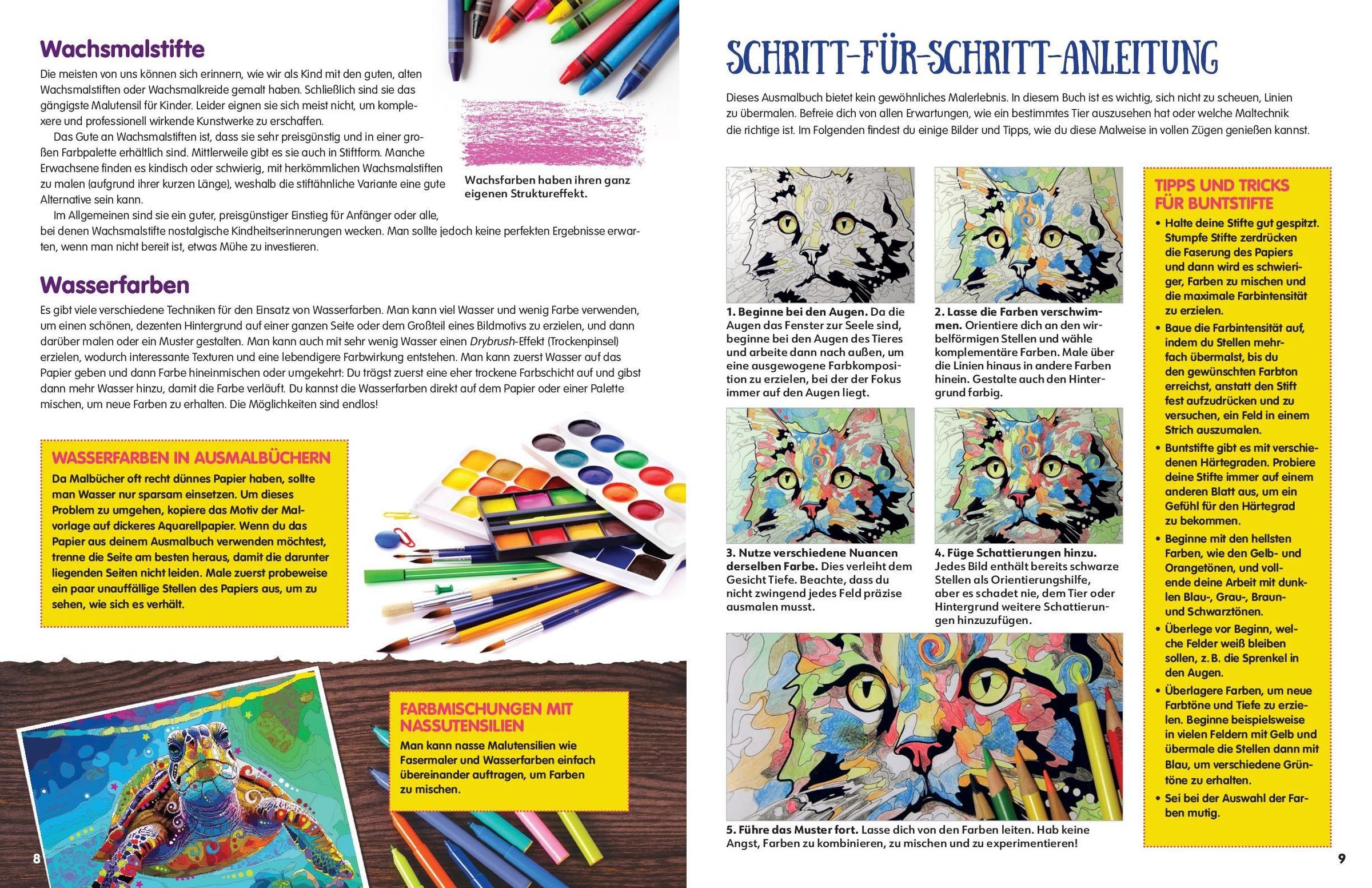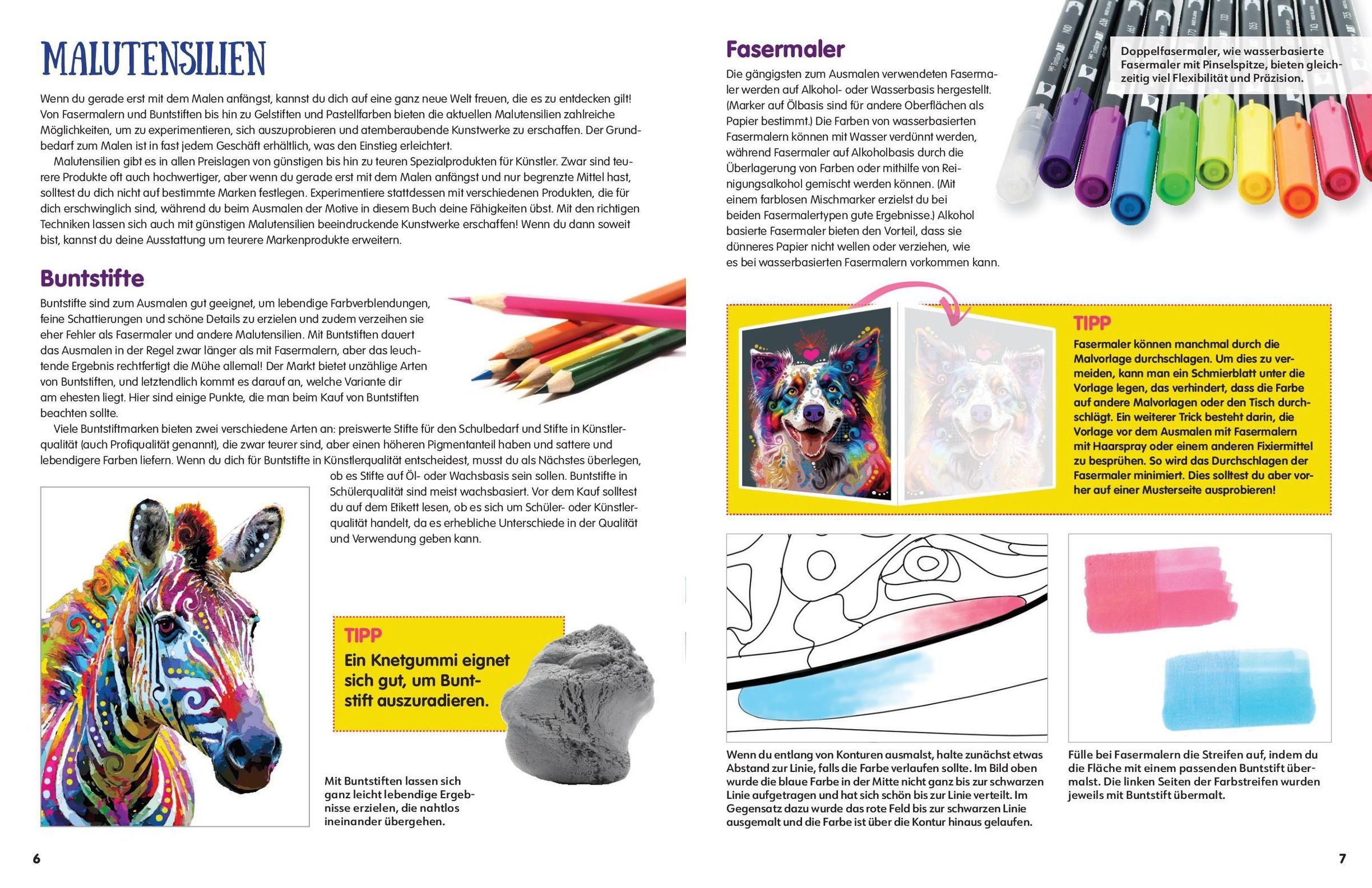 Ein kleiner Anleitungsteil bietet dir wertvolle Tipps direkt vom Künstler. Lerne seine lebendige und farbenfrohe Ausmaltechnik kennen und erfahre, wie du die richtigen Farben und Stifte auswählst, um deine Kunstwerke zum Leben zu erwecken.