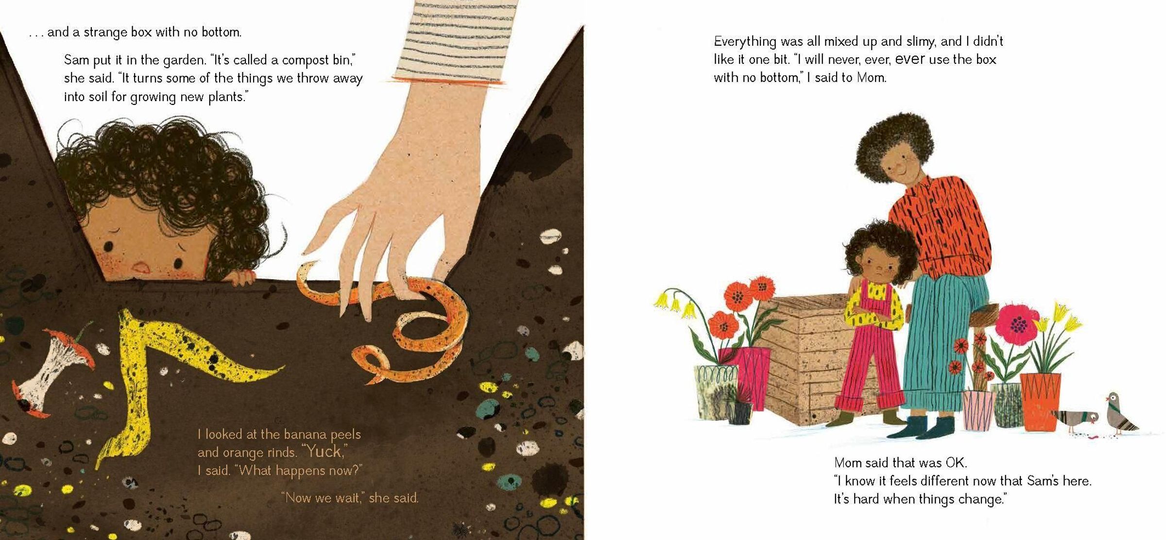 Eventually, just as the compost nourishes the plant and turns it into something amazing, the child's relationship with Sam blooms and they find their way. And by the same time next year, they have enough pumpkins to make all kinds of treats, and new seeds to plant.