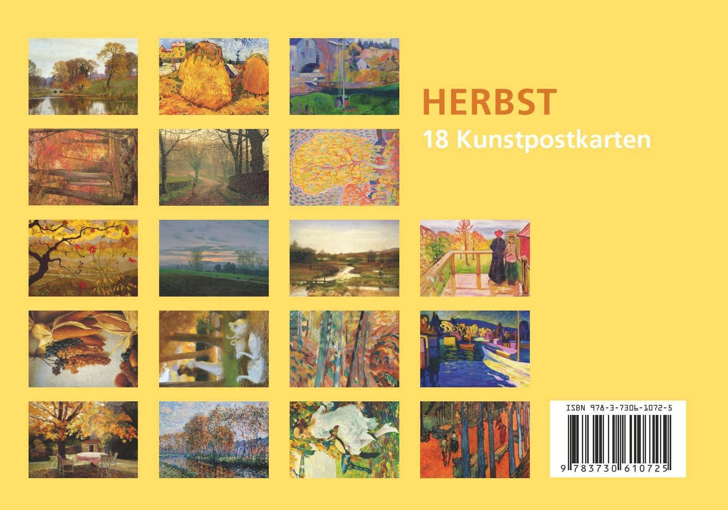 Der Herbst ist in unserer Region die Zeit der Ernte und des Blätterfalls, die Verbindung zwischen Sommer und Winter, zwischen hell und dunkel und zwischen kalt und warm. Wenn die Sonne die Landschaft in intensive Töne taucht, erscheint die Welt in einer ganz besonderen Farbvielfalt. Zahlreiche Künstler haben diese Jahreszeit genutzt, um einige der ausdrucksstärksten Gemälde der Kunstgeschichte zu schaffen. In diesem Postkartenbuch werden 20 der schönsten Werke zum Thema Herbst vorgestellt, wie immer im praktischen Postkartenformat, mit kurzen Informationen zum jeweiligen Motiv. Alle Motive lassen sich leicht heraustrennen und als Postkarten nutzen.