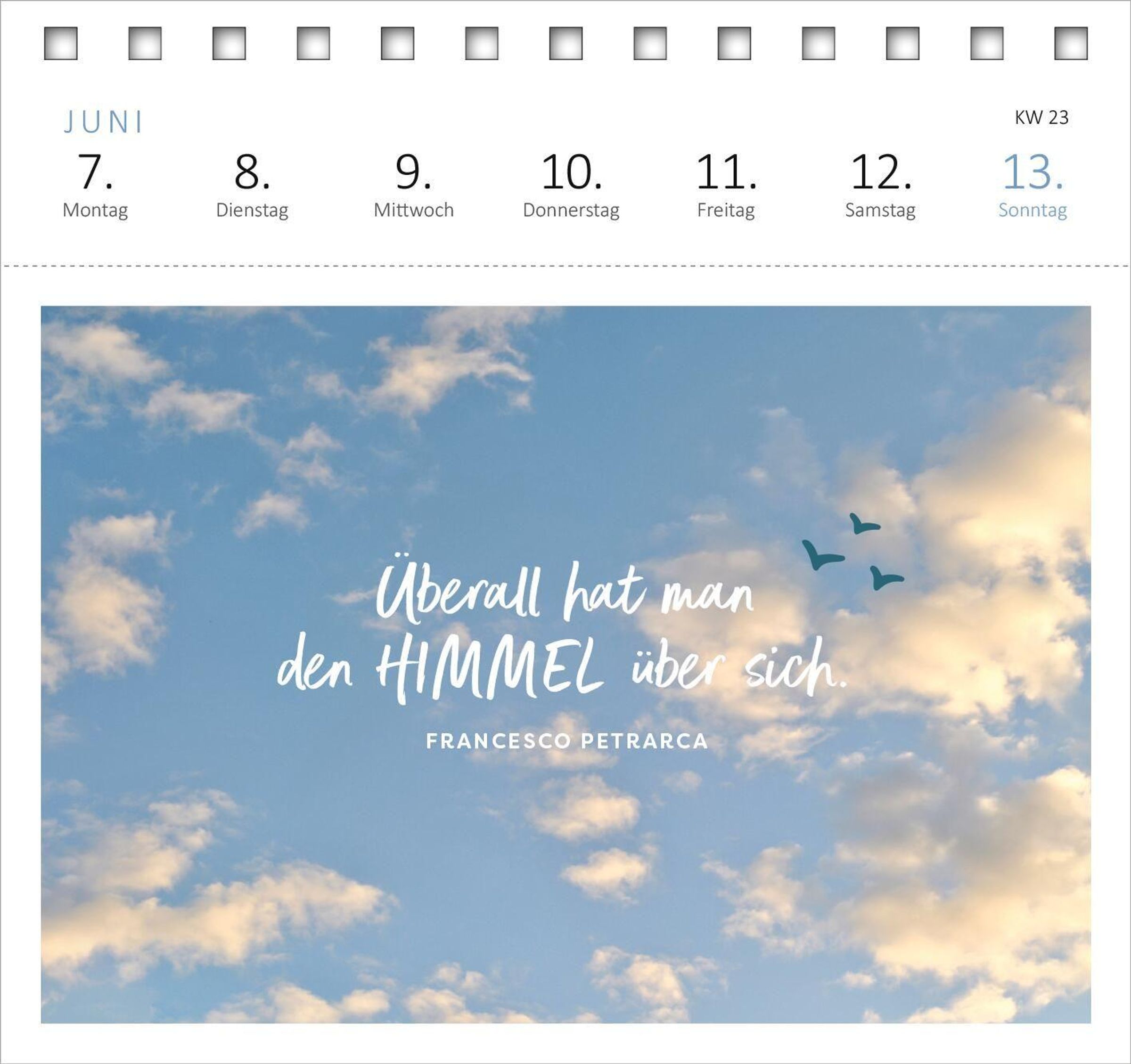 Ob Gelassenheit, Liebe, Freundschaft oder Hoffnung - die vielfältigen Zitate und Weisheiten dieses Aufstellkalenders umfassen die großen und kleinen Themen des Alltags und schenken immer wieder neue Inspiration. Durch das praktische Wochenkalendarium behält man stets den Überblick, egal ob im Büro oder zu Hause. Auf fester Pappe gedruckt, lassen sich die 53 Postkarten an der Perforation ganz einfach vom Kalendarium trennen und können so an liebe Menschen verschickt werden. Durch seine geschmackvolle Gestaltung ist der Kalender auch eine schöne Schreibtischdeko.