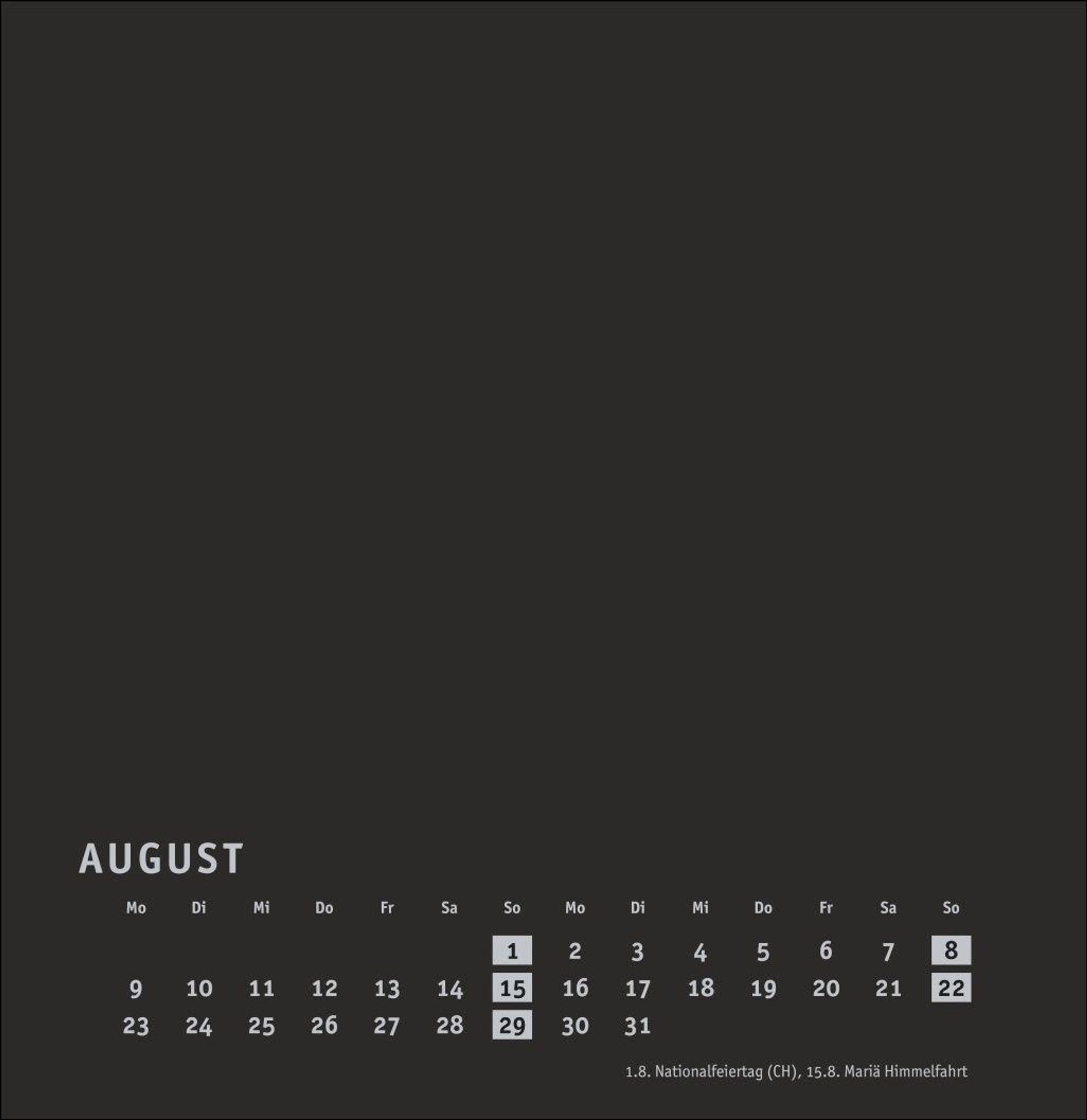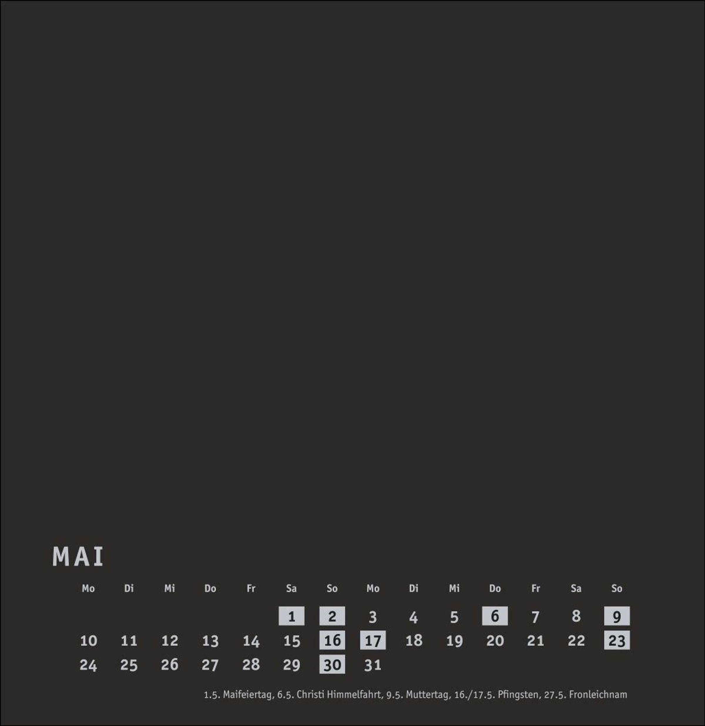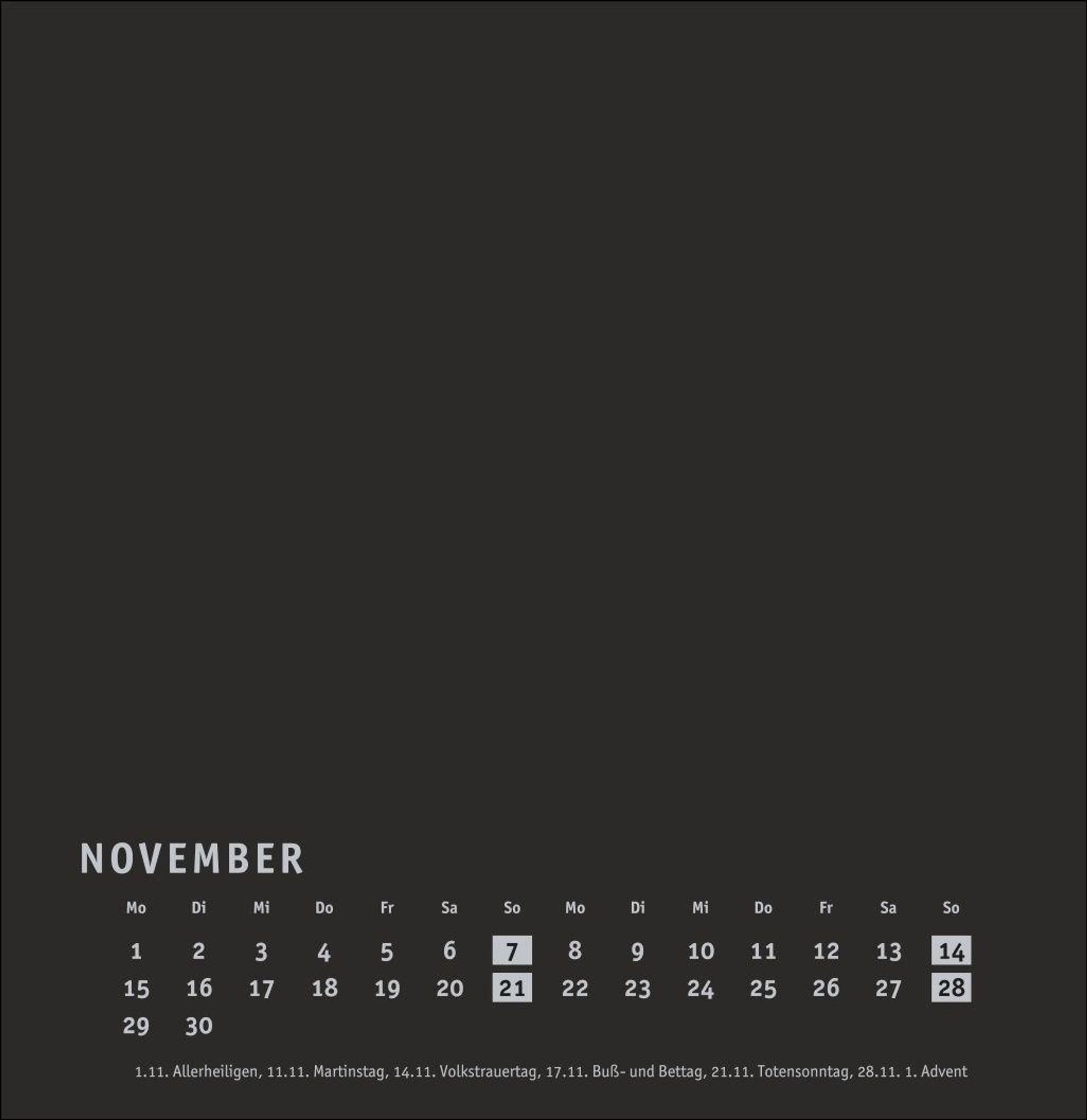 Kalender im quadratischen Format mit schwarzer Grundfarbe als neutralem Hintergrund