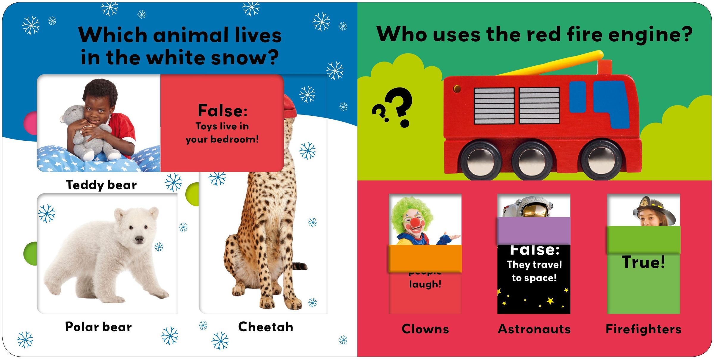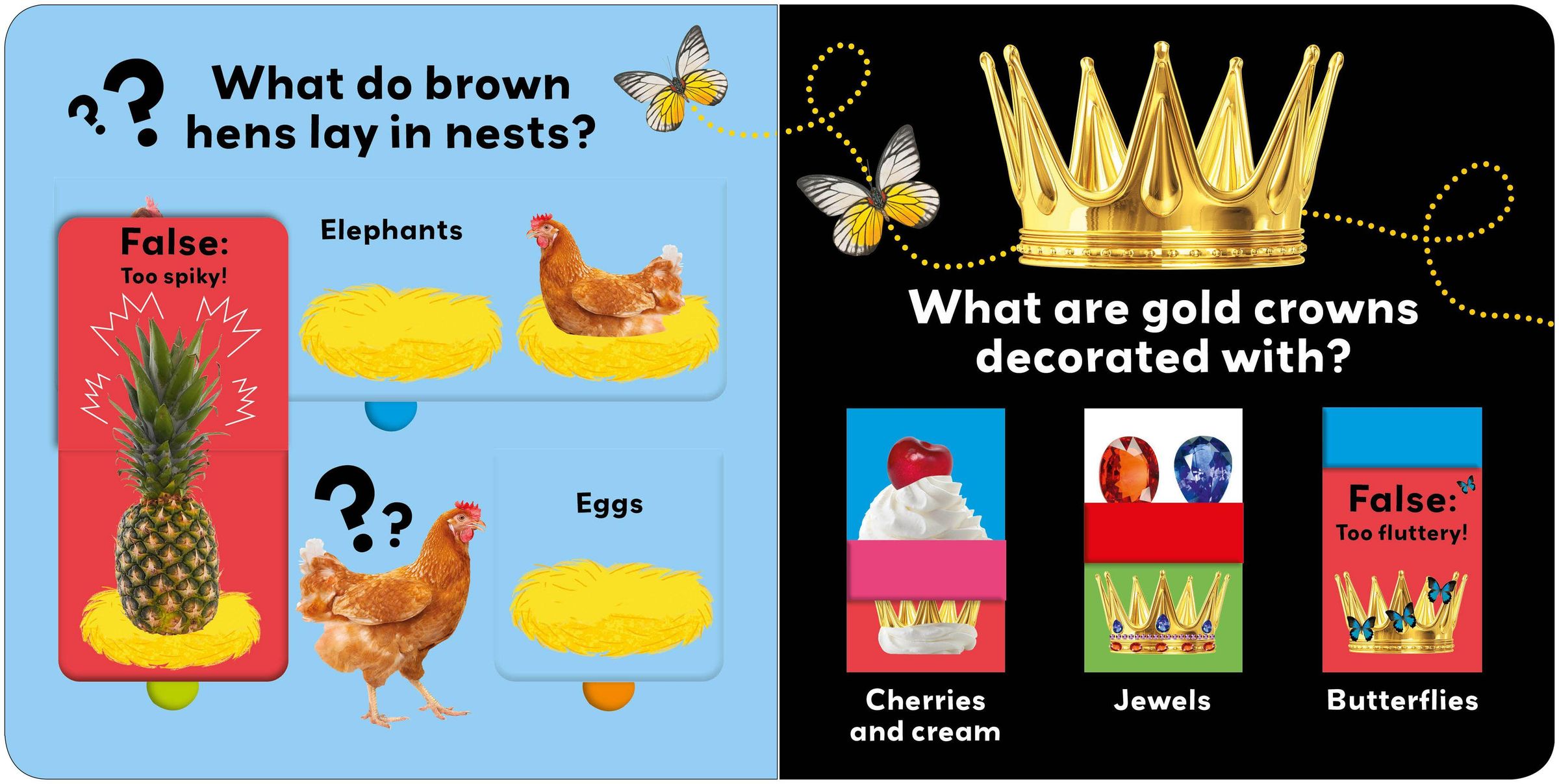 Each page features a simple question, with two fantastically silly false answers and one true answer, all hidden behind flaps and sliders that little ones can open and move themselves.