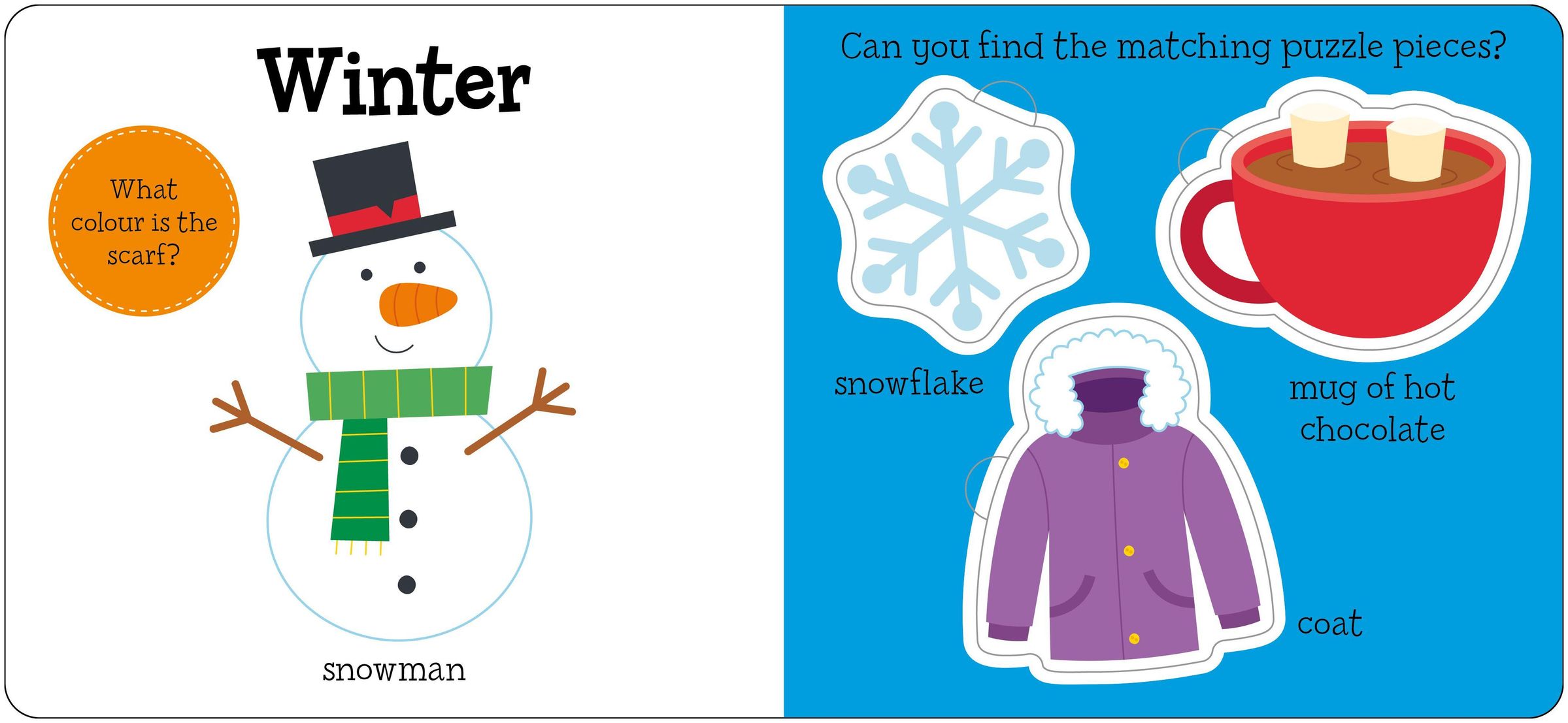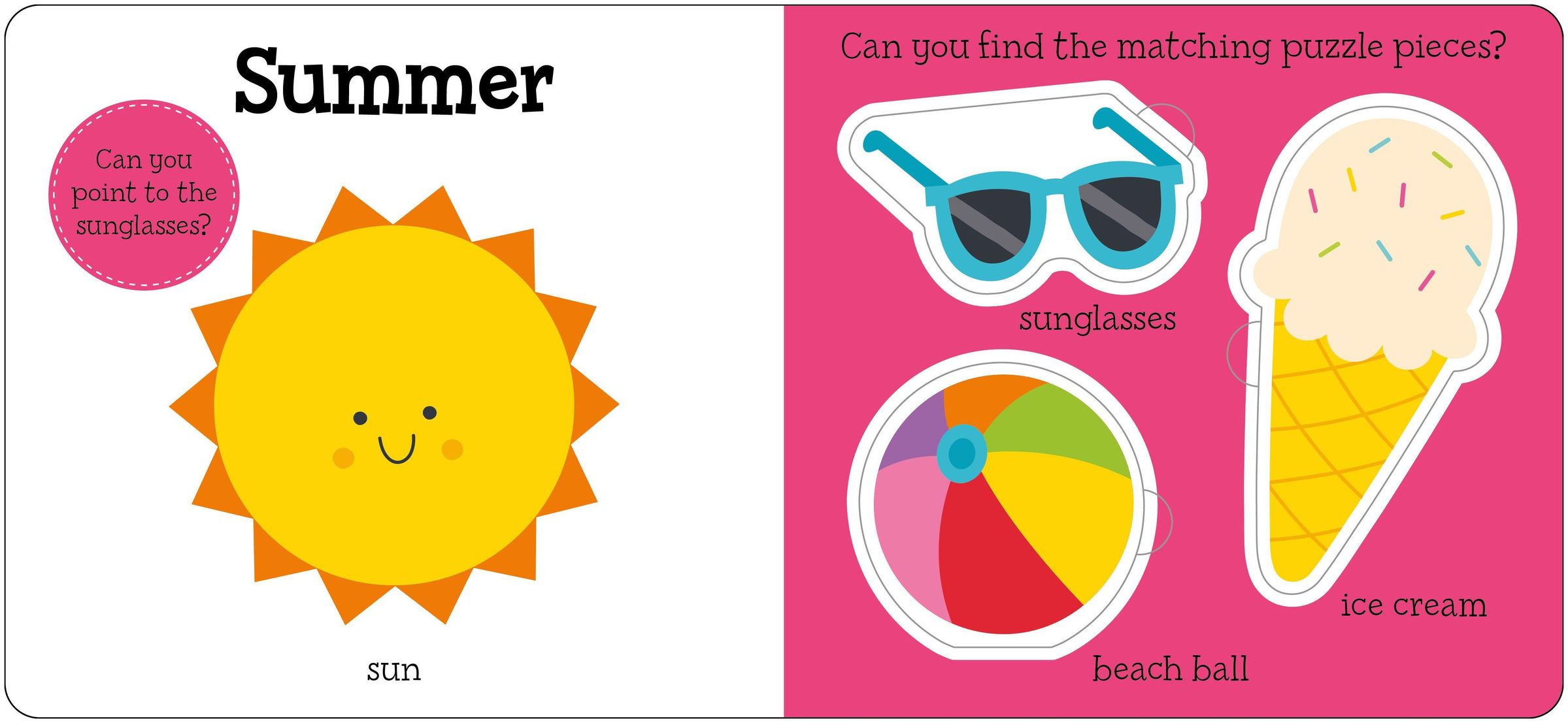 Preschoolers can learn about Winter, Spring, Summer and Autumn as they go through the book and find the press-out pieces. Each of the 12 play pieces matches an image on the page and fits securely into the die-cut spaces, but can also be used separately as flash cards. This book encourages fine motor skills and problem-solving, as well as teaching core vocabulary.