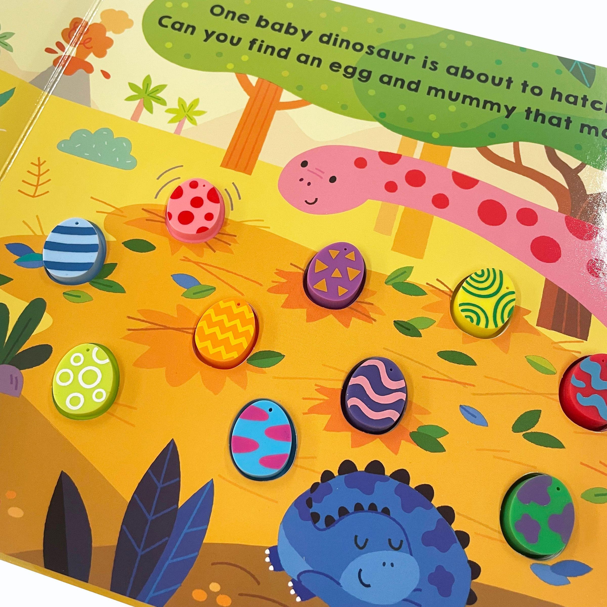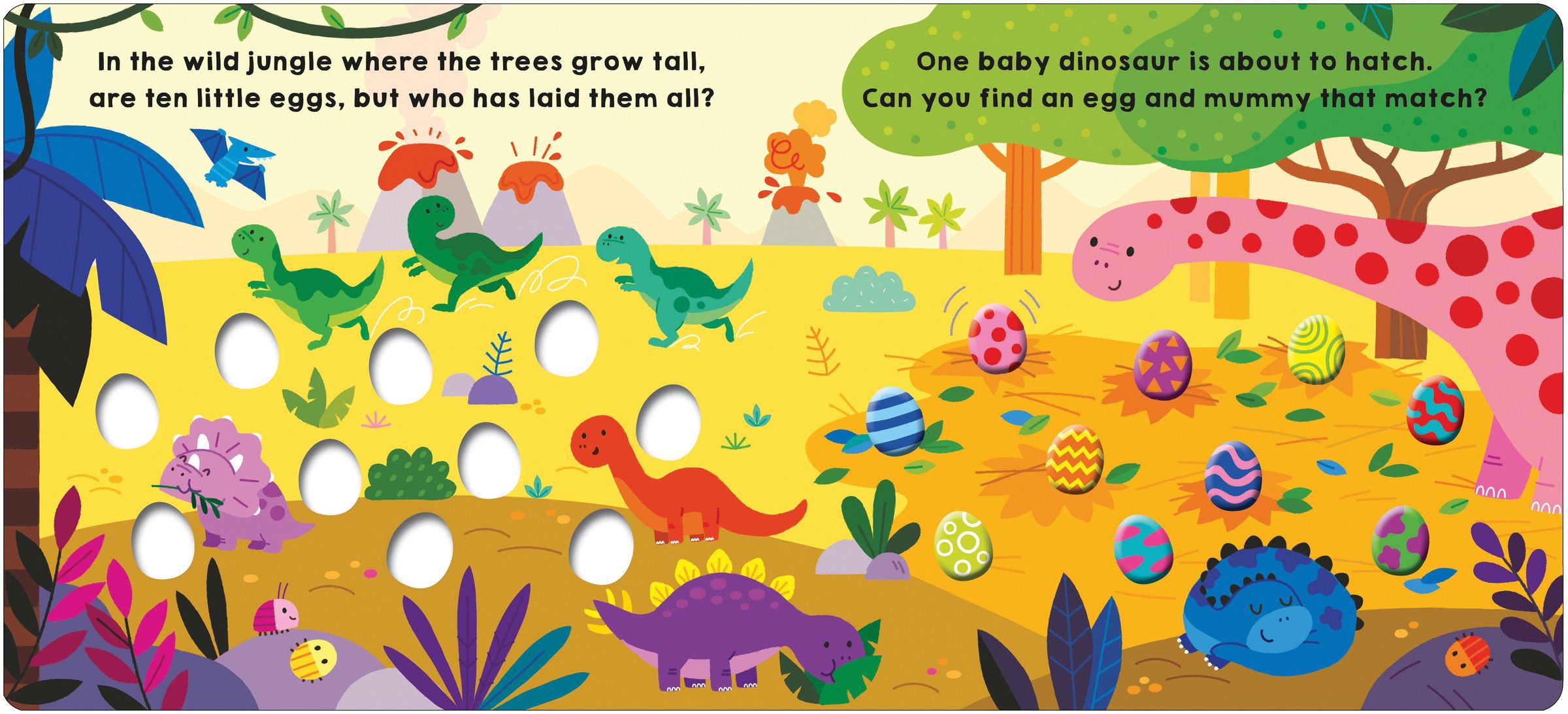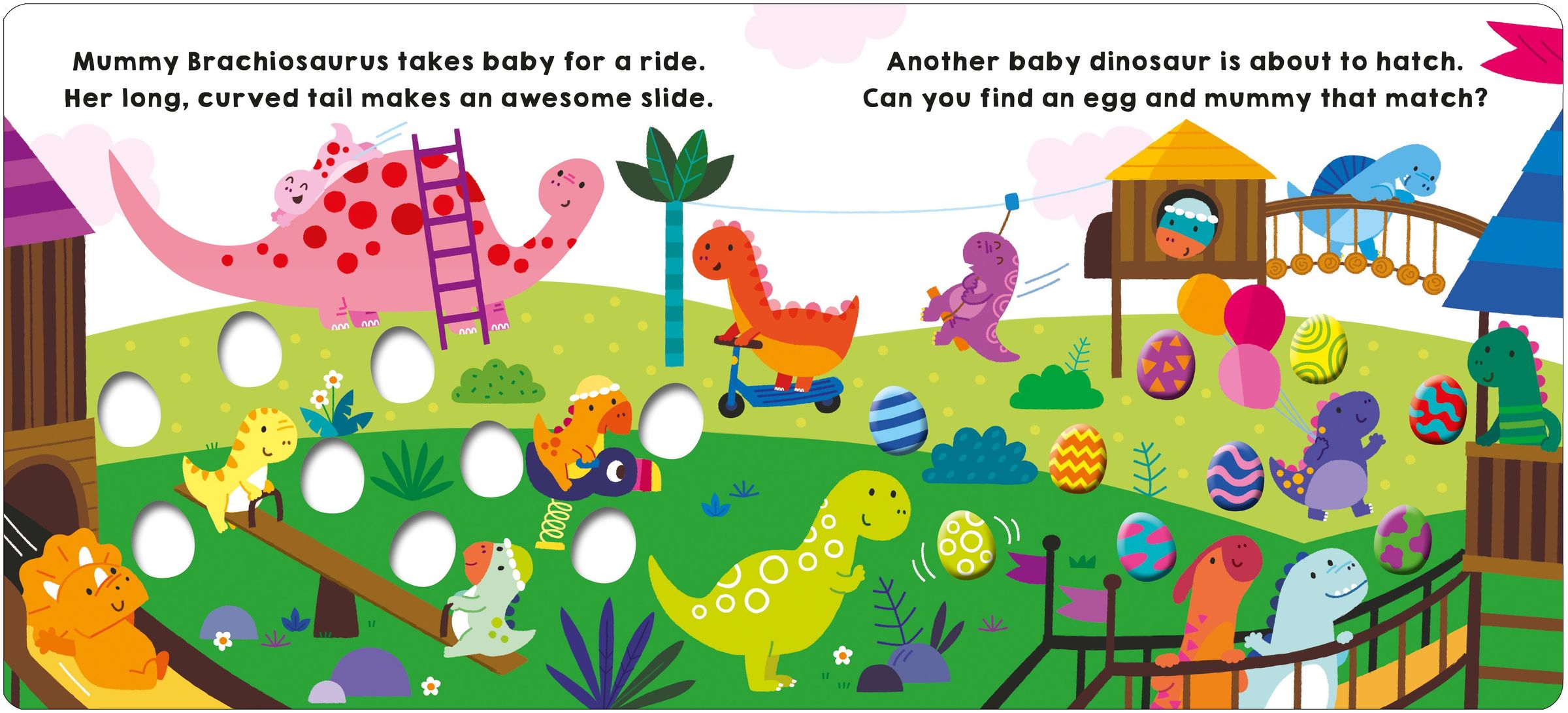 Each dinosaur mummy has a unique pattern that children can match to one of the squishy eggs. Once found, children can turn the page to see the mummy dinosaur playing with her newly hatched baby.