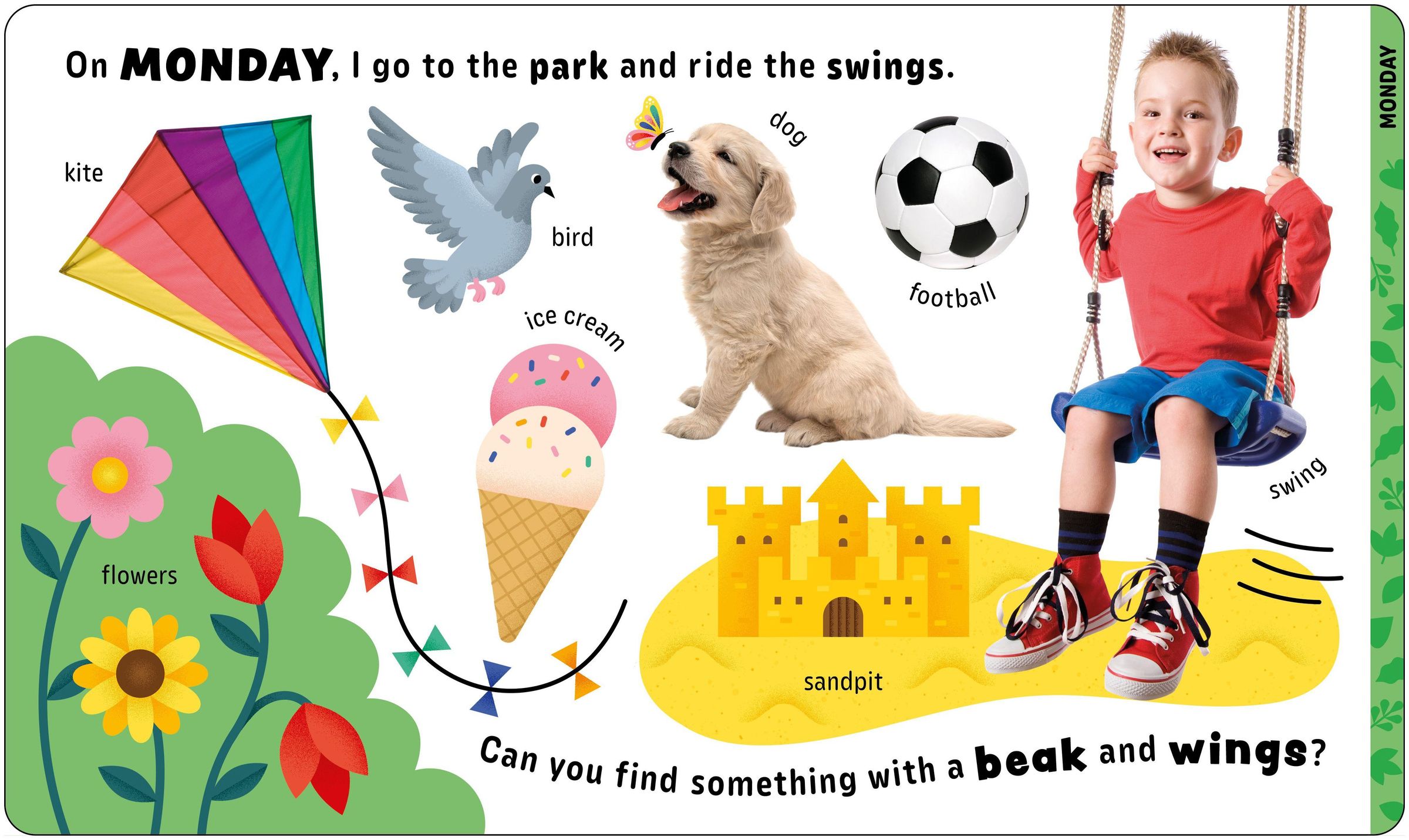 On Monday I visit the park and ride the swings.