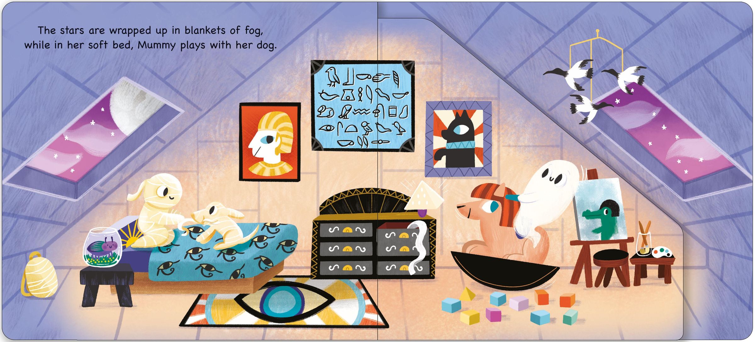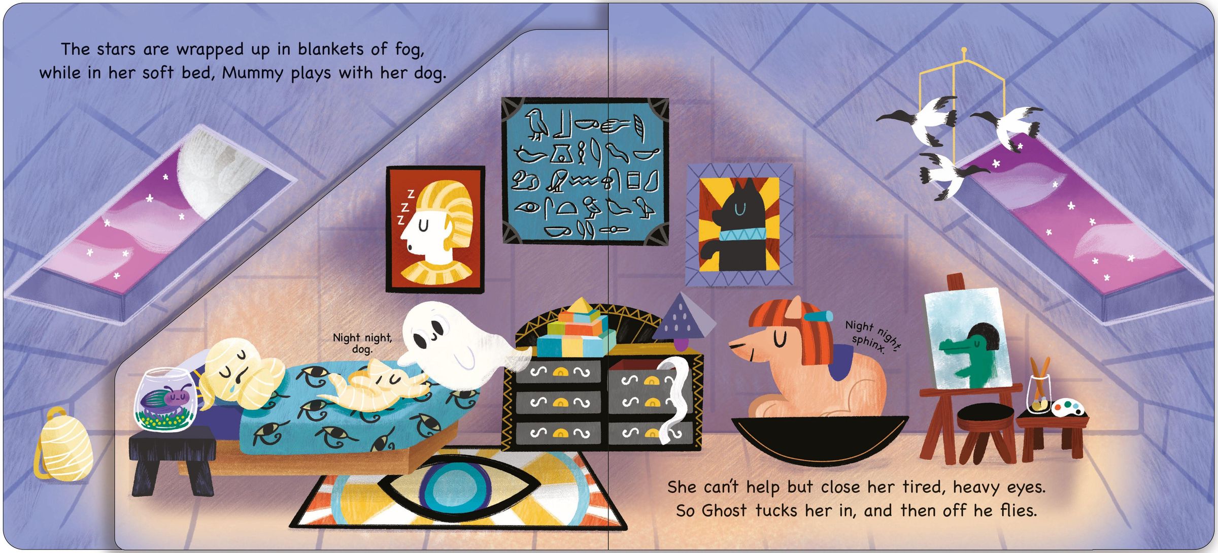 It's Halloween night and the monsters are very sleepy after an evening of trick-or-treating fun. Ghost helps each of them get settled in their monster beds and says goodnight, before getting into his own warm bed and drifting off to sleep.