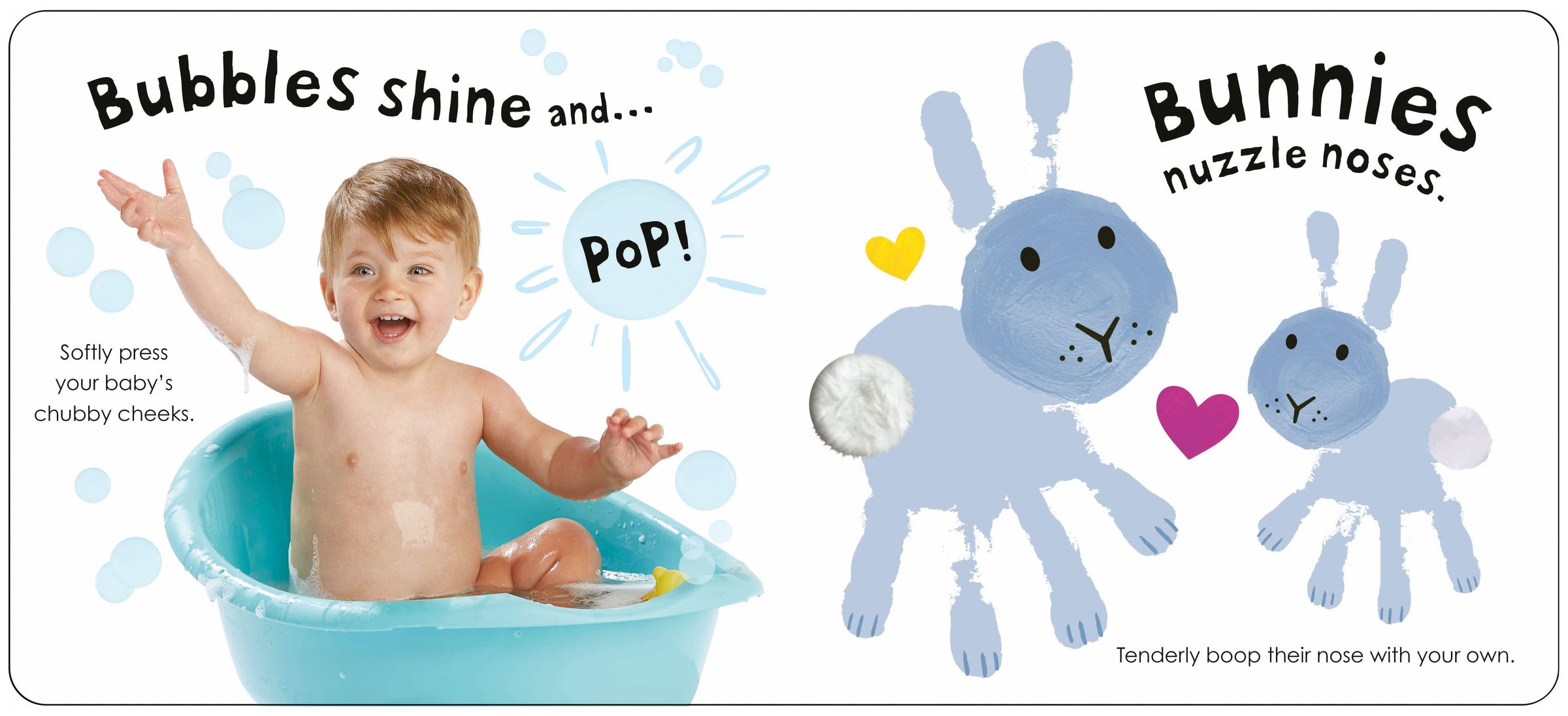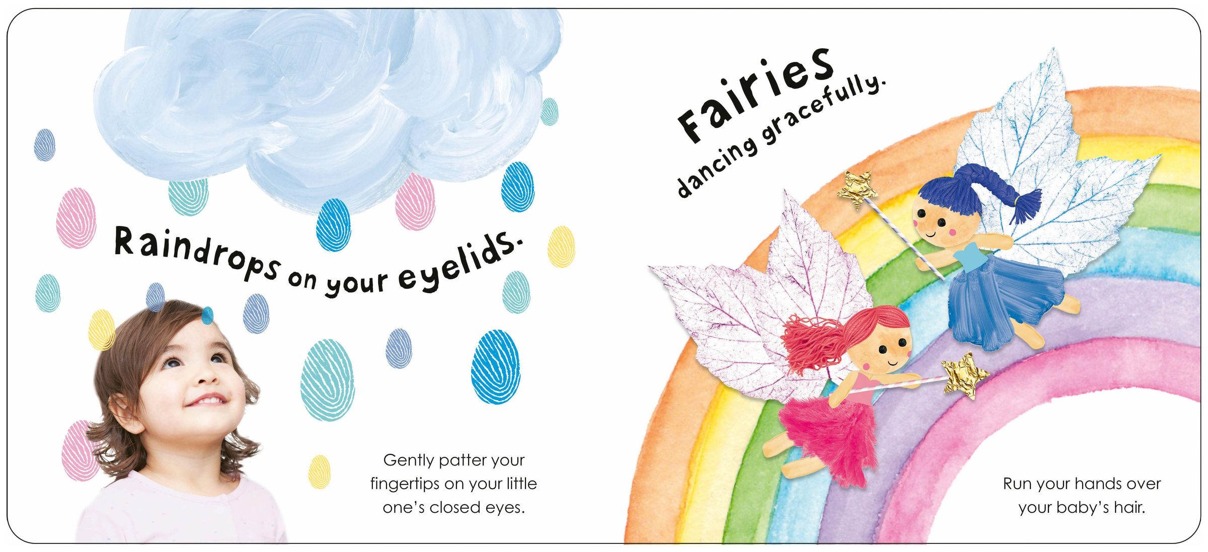 The gentle sing-song rhymes can be read to little ones before a nap or their bedtime after an over-stimulating day. Alongside the soft rhyming text on every page is a sensory action for parents to do as they read the book to their babies, like pattering their fingertips on their child's closed eyelids or booping their little nose.