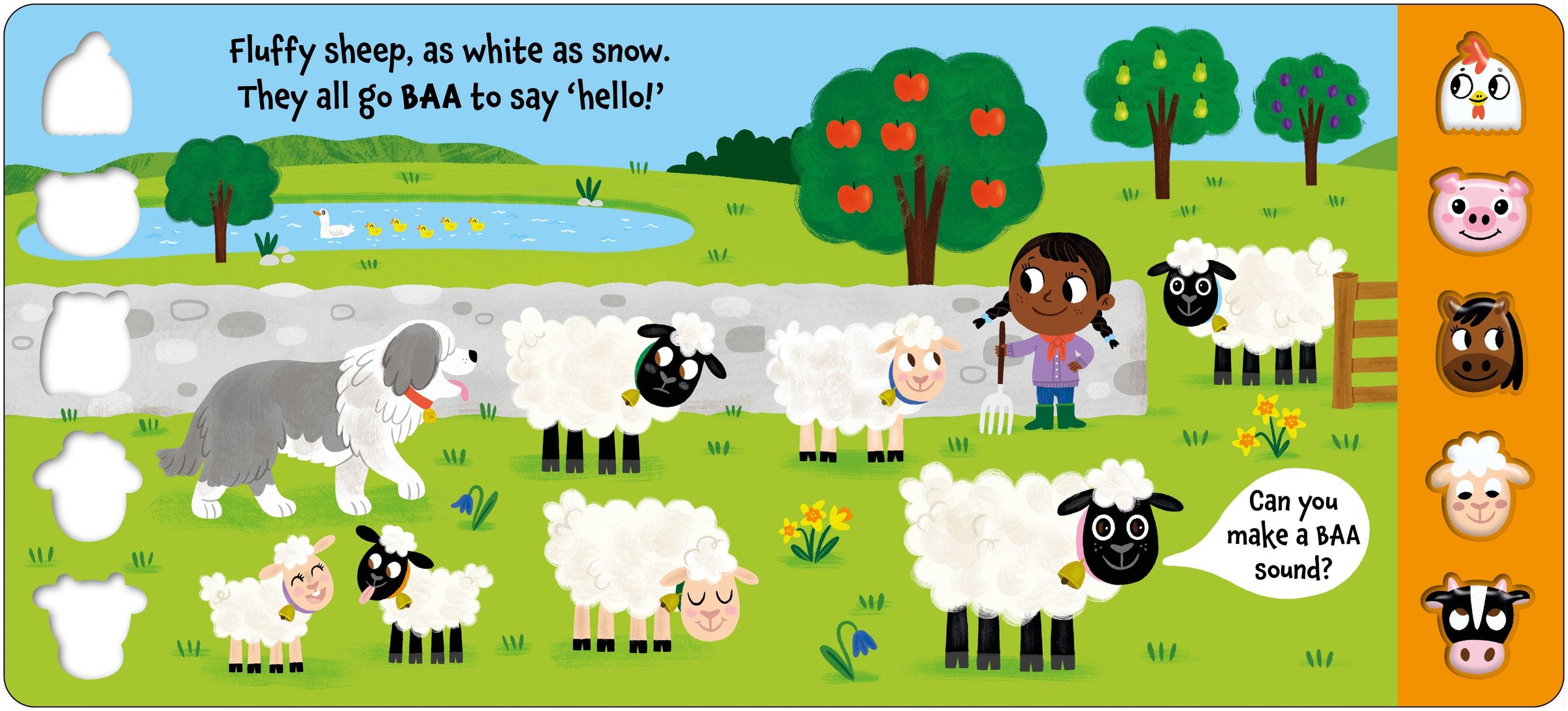 Toddles will have fun pushing the squishy animal heads to hear their sounds, and enjoy saying "MOO!" along with Cow, "BAA!" along with Sheep, "CLUCK!" along with Chicken, and more!