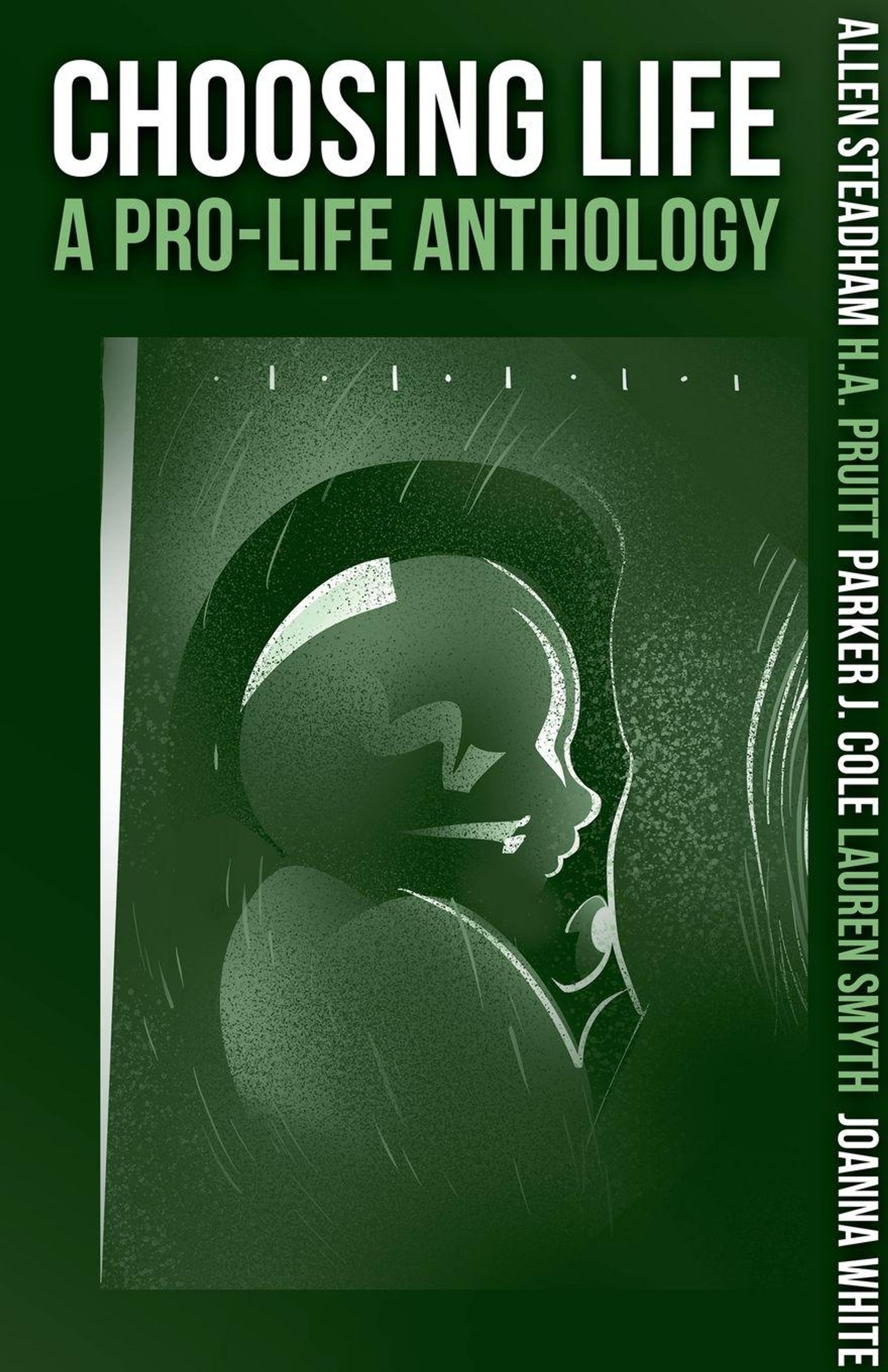 „CHOOSING LIFE: A PRO-LIFE ANTHOLOGY“ steht in großen Buchstaben. Eine stilisierte Illustration eines Fötus in grünlichen Tönen., Buch