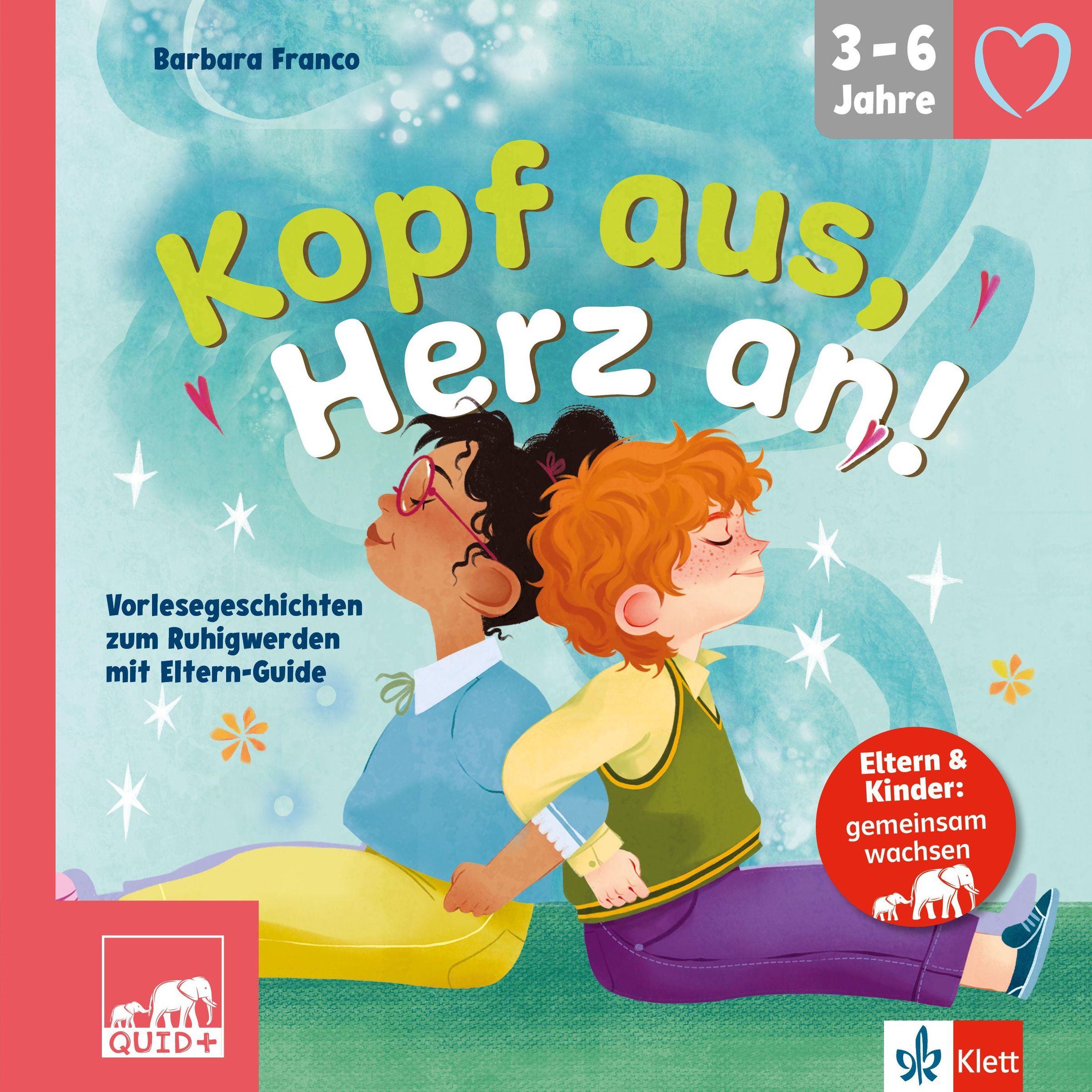 „Kopf aus, Herz an!“ Vorlesegeschichten zum Ruhigwerden mit Eltern-Guide. Zwei Kinder sitzen Rücken an Rücken., Buch