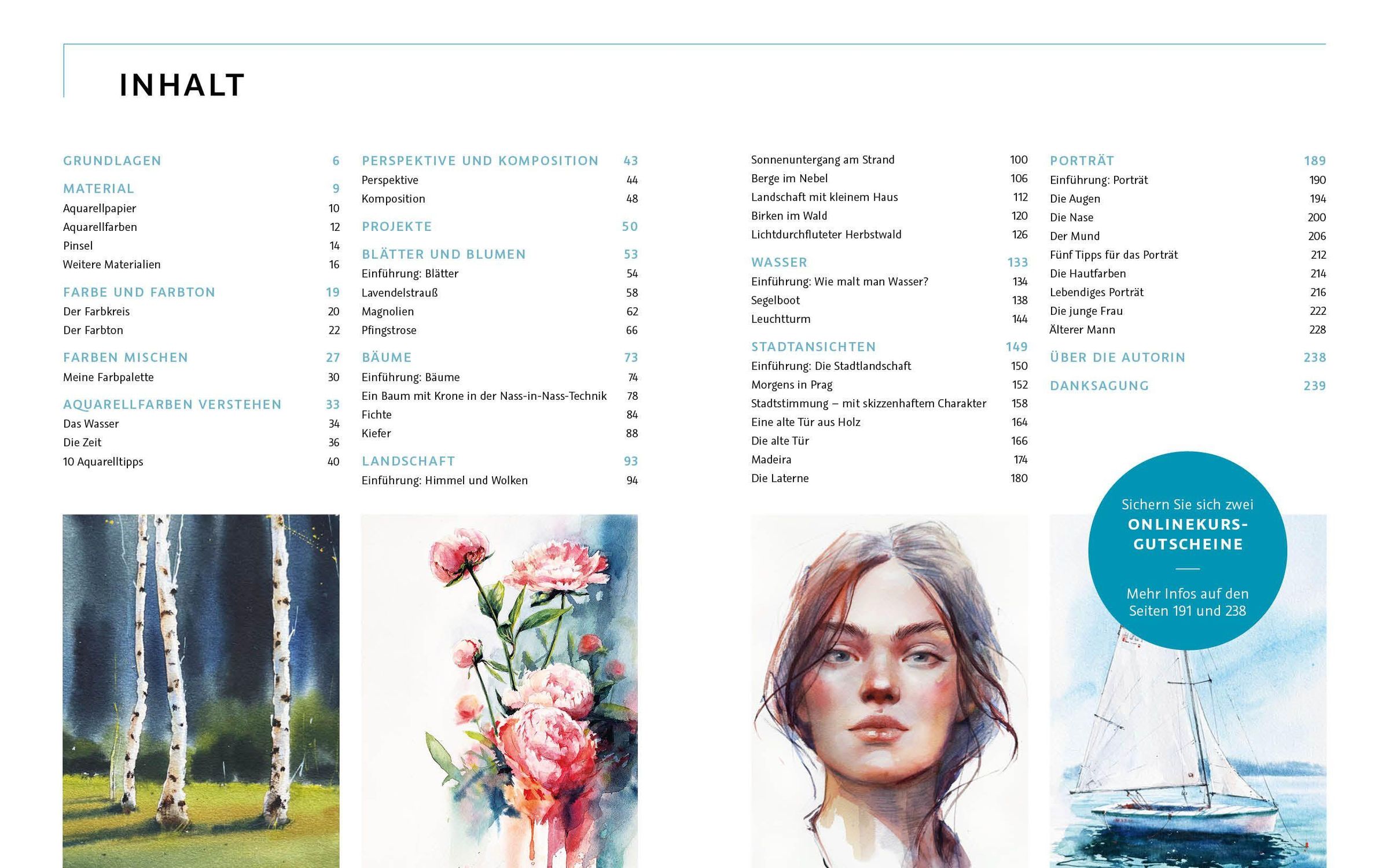 Mit ihrem neuen Buch können Anfänger*innen und auch Fortgeschrittene die Kunstwerke von ihr nun endlich nachempfinden. Mit dem praktischen Grundlagenteil zu Farbtheorie , Perspektive bis hin zu Proportionen ist man bestens vorbereitet, um sich den traumhaft schönen Porträts, Stillleben und Landschaften zu widmen. Jedes Motiv wird Schritt für Schritt erklärt und die hilfreichen Tipps führen einen sicher zum Erfolg. Aquarell-Mal-Spaß garantiert!