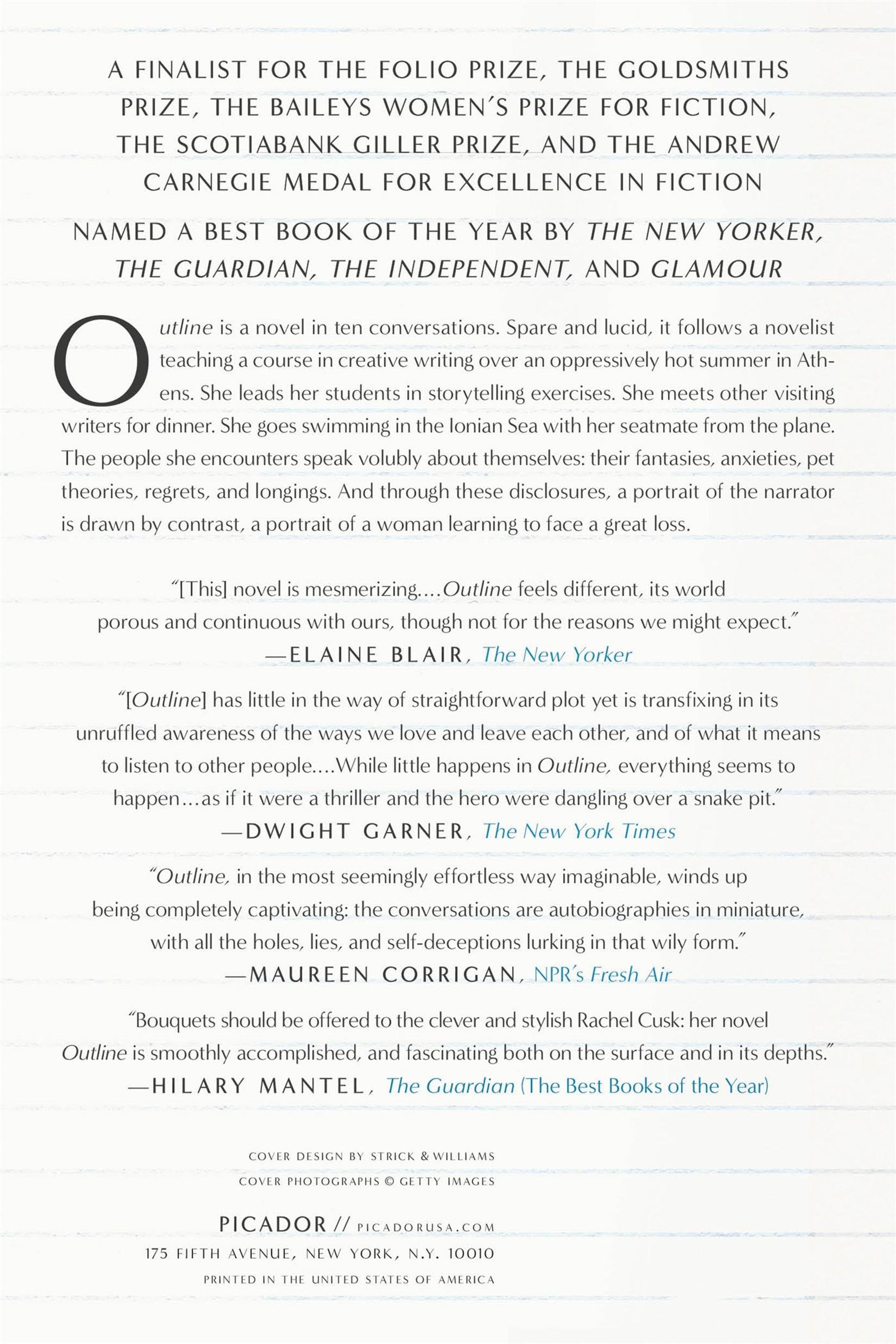 Rachel Cusk'sOutlineis a novel in ten conversations. Spare and lucid, it follows a novelist teaching a course in creative writing over an oppressively hot summer in Athens. She leads her students in storytelling exercises. She meets other visiting writers for dinner. She goes swimming in the Ionian Sea with her neighbor from the plane. The people she encounters speak volubly about themselves: their fantasies, anxieties, pet theories, regrets, and longings. And through these disclosures, a portrait of the narrator is drawn by contrast, a portrait of a woman learning to face a great loss.