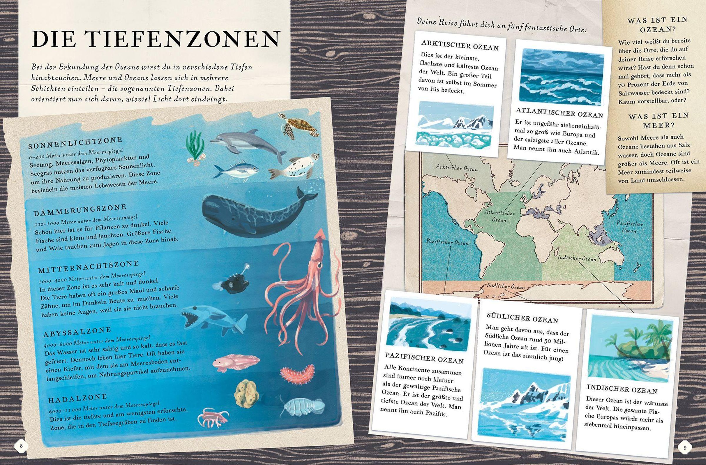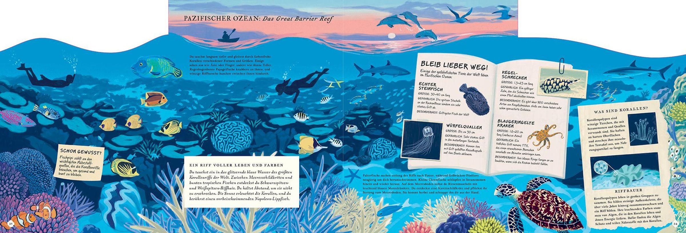 Bereit für einen Tauchgang? Dieses Sachbuch nimmt Kinder ab 6 mit auf eine spannende Reise durch die Ozeane der Erde - vom arktischen Eis rund um Spitzbergen bis in die geheimnisvollen Tiefen des Marianengrabens. Über und unter Wasser gibt es faszinierende Lebensräume zu entdecken: die klare Sargassosee mit ihren fliegenden Fischen, das bunt schillernde Great Barrier Reef oder die finstere Tiefsee, wo Vampirtintenfische, giftige Quallen und leuchtende Anglerfische zu Hause sind.