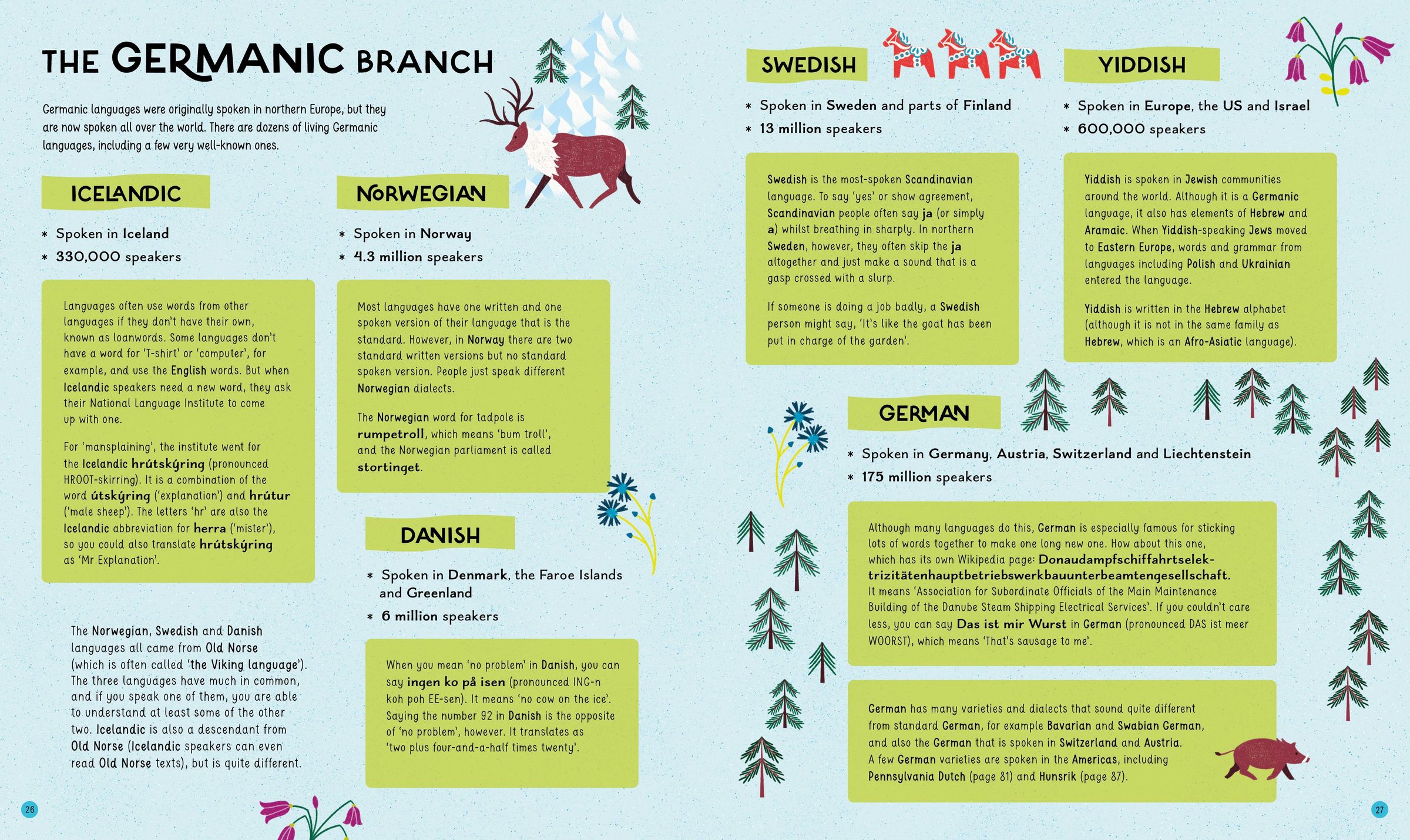 Discover the well-known and the rare languages spoken in every country on a map of each continent. Pore over vibrant and exquisite language family trees that show how different languages have grown, developed and connected over time. Then explore the languages in more detail - how many people speak them, how to pronounce a fun phrase, and why they are so important to a nation's identity and culture.