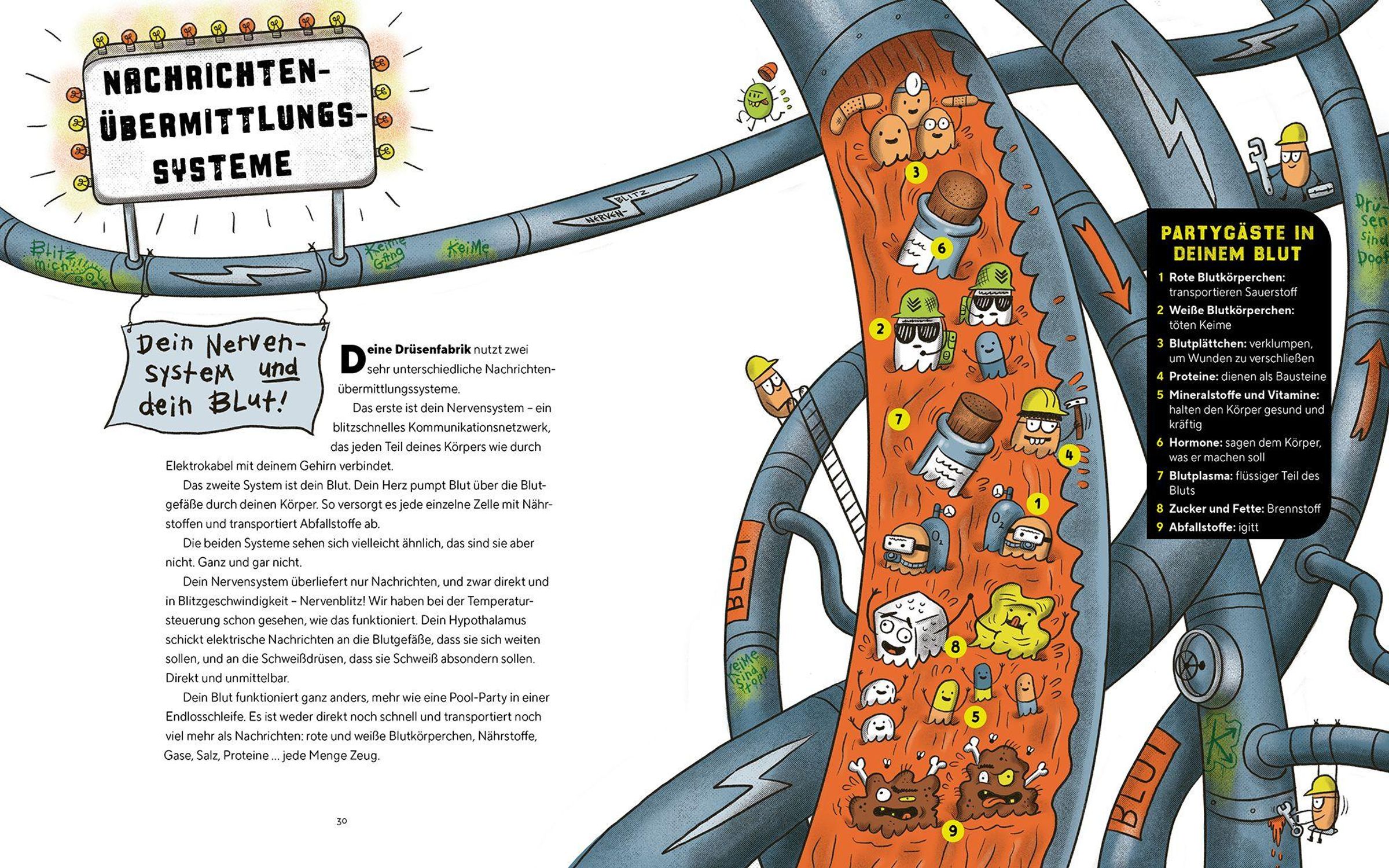Ein weiteres, wunderbar schräges und informatives Sachbuch von Rachel Poliquin und Clayton Hanmer (Das Museum der unnützen Körperteile)! Die Drüsenfabrik läuft auf Hochtouren - rund um die Uhr. Hier wird gesteuert, verdaut und geheilt. Eine spannende Besichtigungstour führt unerschrockene Kinder tief hinein in den menschlichen Körper. Bei zahlreichen Zwischenstopps, unter anderem bei Schilddrüse und Nervensystem, erfährt man, wie das endokrine und das exokrine System arbeiten und wozu Speichel, Schweiß und Hormone eigentlich gut sind. Dieses Buch vermittelt medizinisches Wissen mit viel Humor, wissenschaftlicher Präzision und einer kleinen Portion Ekel - ideal für Kinder ab 8 Jahren.