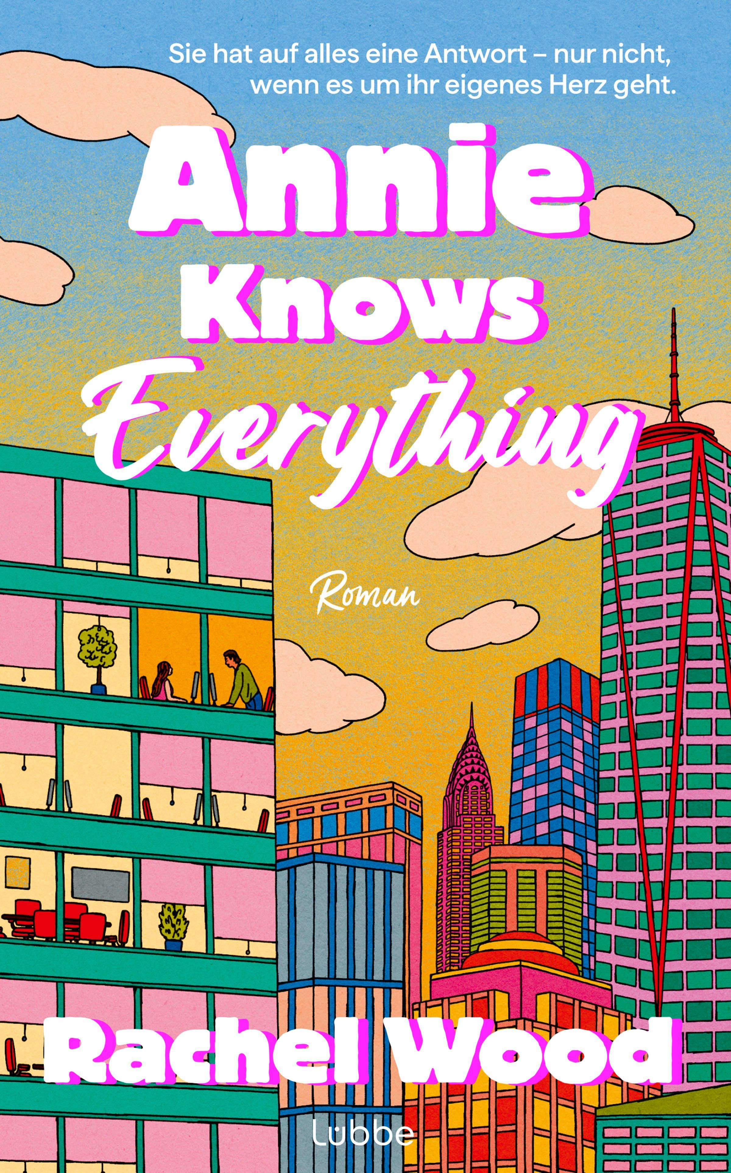 Buchtitel: "Annie Knows Everything". Autorin: Rachel Wood. Bunte Skyline mit Wolkenkratzern, rosa Buchrücken., Buch