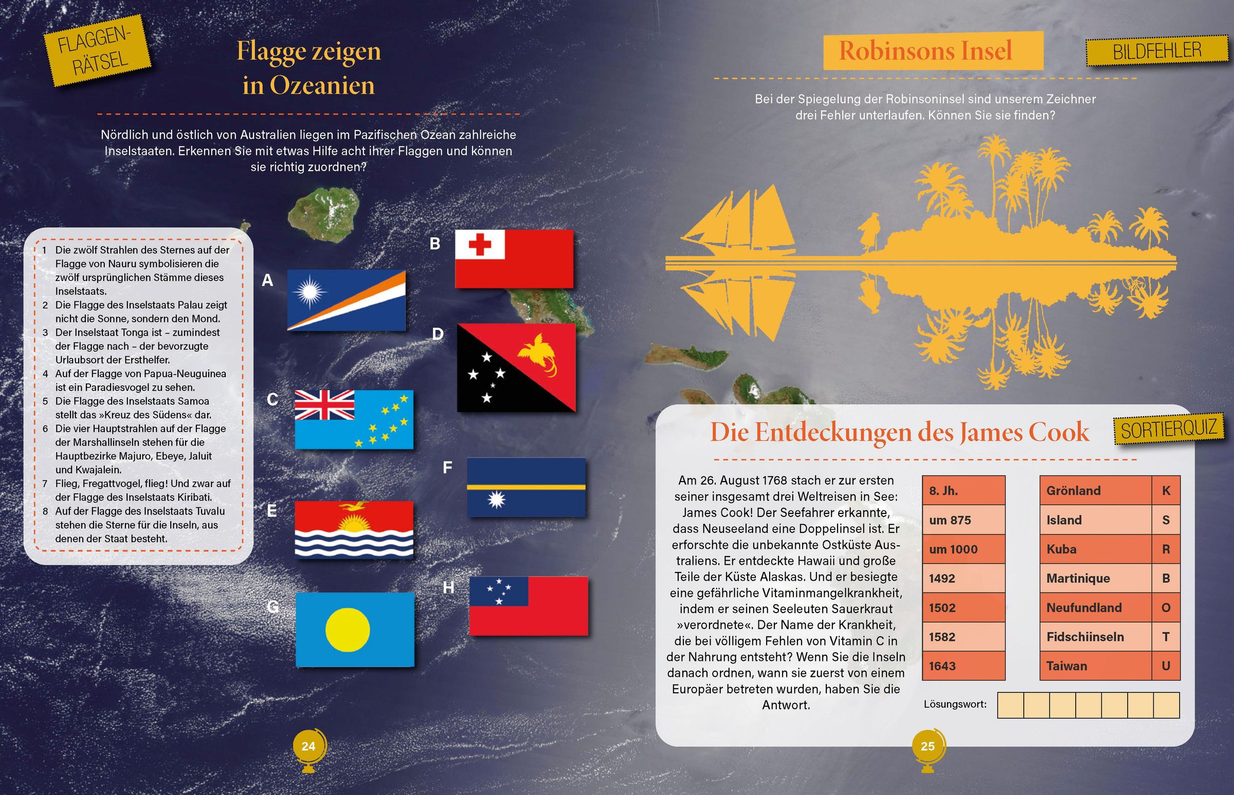 Dieses Geografie-Rätselbuch bietet einen abwechslungsreichen Mix aus Rätseln und Quizfragen, die Ihre geografischen Kenntnisse und Ihr logisches Denken auf die Probe stellen. Dabei ist nicht nur Ihr Wissen gefragt, sondern auch Ihr Auge für Details, denn das Buch enthält auch zahlreiche Bilder-, Flaggen- und Kartenrätsel.