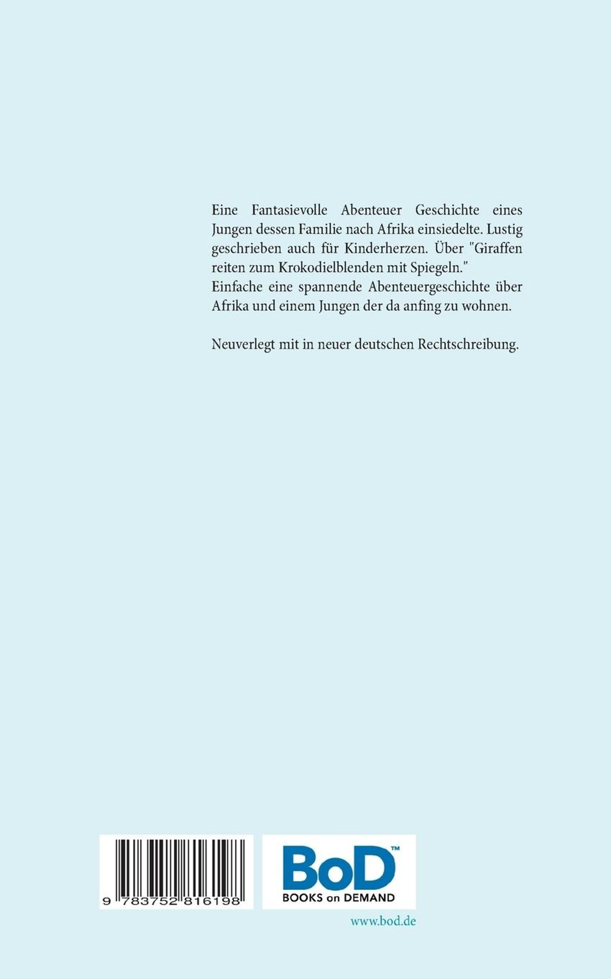 Eine fantasievolle Abenteuergeschichte eines Jungen dessen Familie nach Afrika einsiedelte. Lustig geschrieben, auch für Kinderherzen. Über "Giraffen reiten zum Krokodilblenden mit Spiegeln." Einfach eine spannende Abenteuergeschichte über Afrika und einen Jungen, der da auswanderte. Unterhaltung für die ganze Familie.