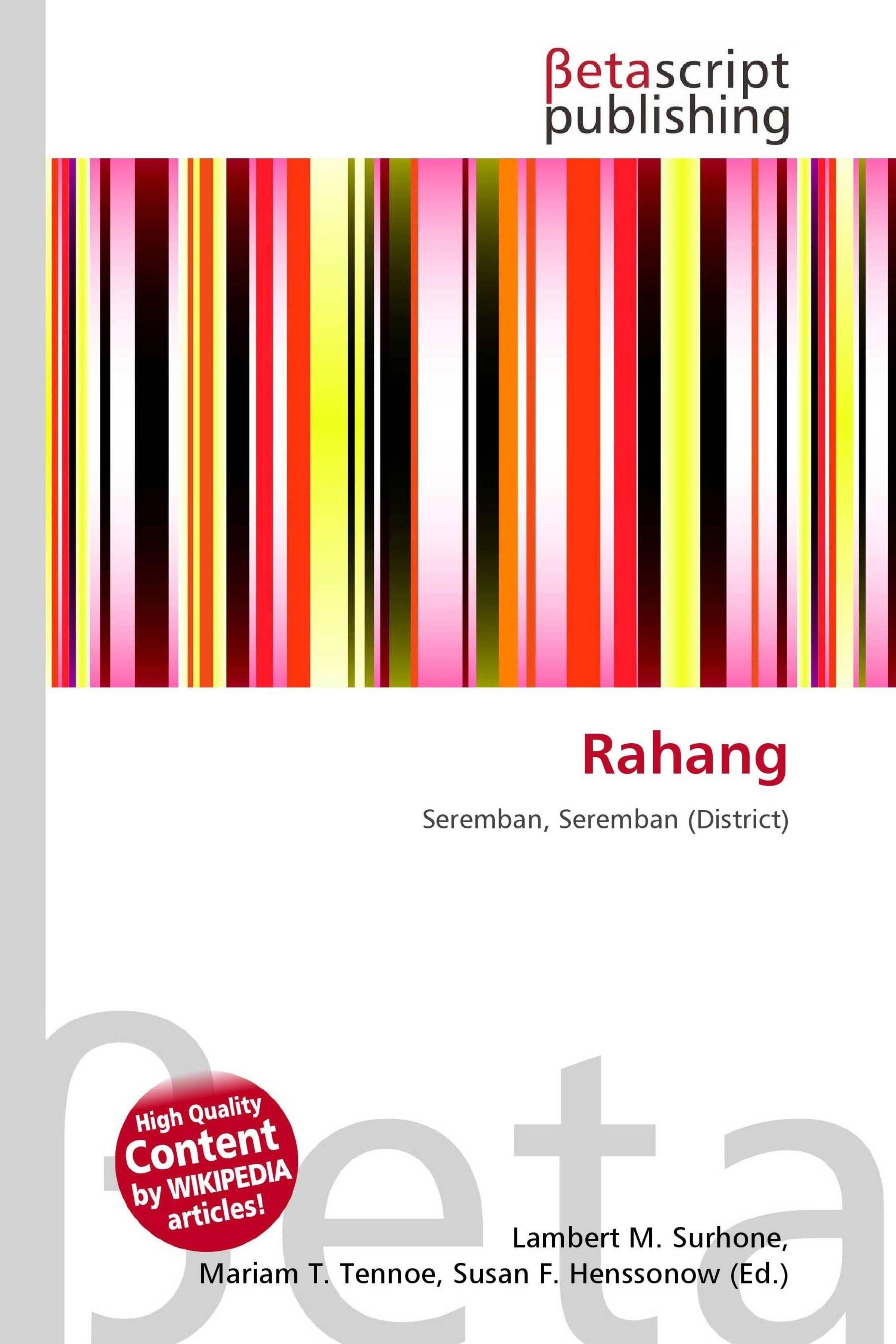 Please note that the content of this book primarily consists of articles available from Wikipedia or other free sources online. Rahang is a suburb of Seremban in Negeri Sembilan. It is an industrial and business area. Serembanis the capital of the Malaysian state of Negeri Sembilan, located within the district of Seremban, one of the seven districts of Negeri Sembilan. The town's administration is run by the Seremban Municipal Council or Majlis Perbandaran Seremban. On 9 September 2009, Seremban was to be declared as a city, however it did not materialise due to irregular rules.
