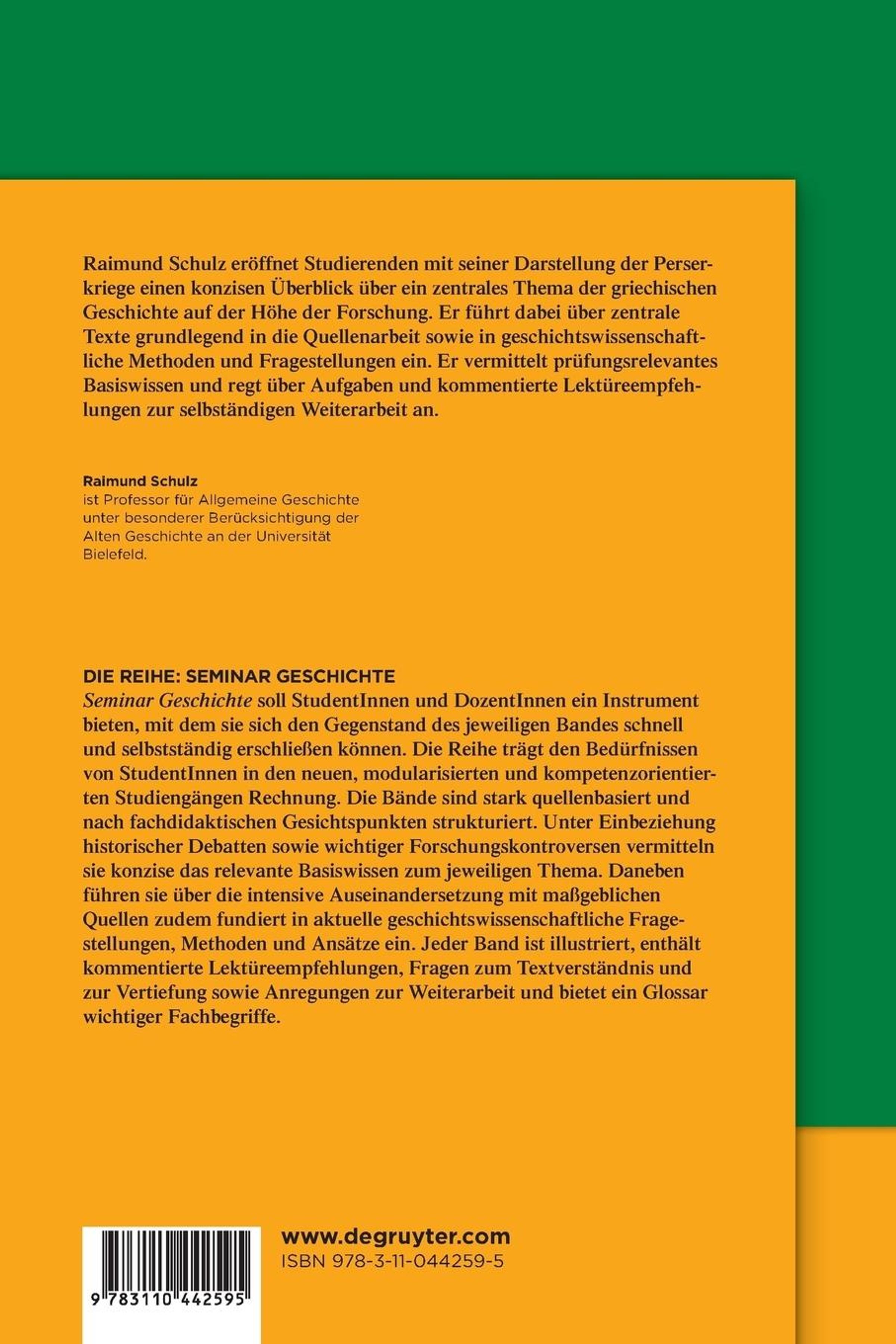 Raimund Schulz, geboren 1962 in Hildesheim, lehrt Alte Geschichte an der Universität Bielefeld. Seine Arbeitsschwerpunkte sind Seefahrt, Krieg, Herrschaft und Völkerrecht in der Antike.Anmerkungen: