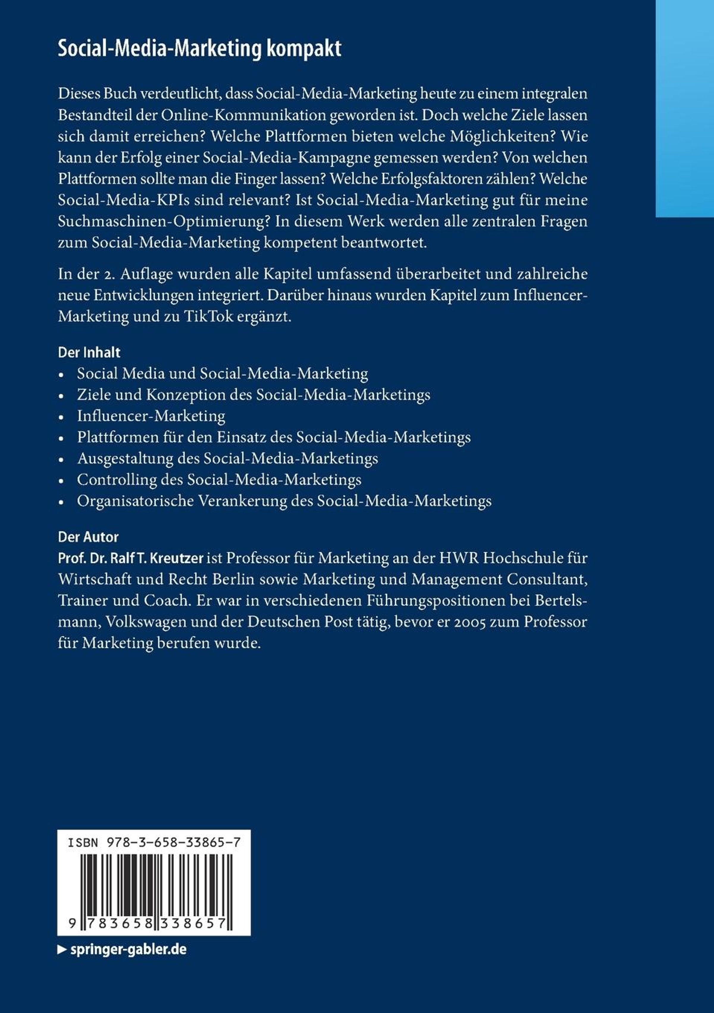 Dieses Buch verdeutlicht, dass Social-Media-Marketing heute zu einem integralen Bestandteil der Online-Kommunikation geworden ist. Doch welche Ziele lassen sich damit erreichen? Welche Plattformen bieten welche Möglichkeiten? Wie kann der Erfolg einer Social-Media-Kampagne gemessen werden? Von welchen Plattformen sollte man die Finger lassen? Welche Erfolgsfaktoren zählen? Welche Social-Media-KPIs sind relevant? Ist Social-Media-Marketing gut für meine Suchmaschinen-Optimierung? In diesem Werk werden alle zentralen Fragen zum Social-Media-Marketing kompetent beantwortet. In der 2. Auflage wurden alle Kapitel umfassend überarbeitet und zahlreiche neue Entwicklungen integriert. Darüber hinaus wurden Kapitel zum Influencer-Marketing und zu TikTok ergänzt. Der Inhalt