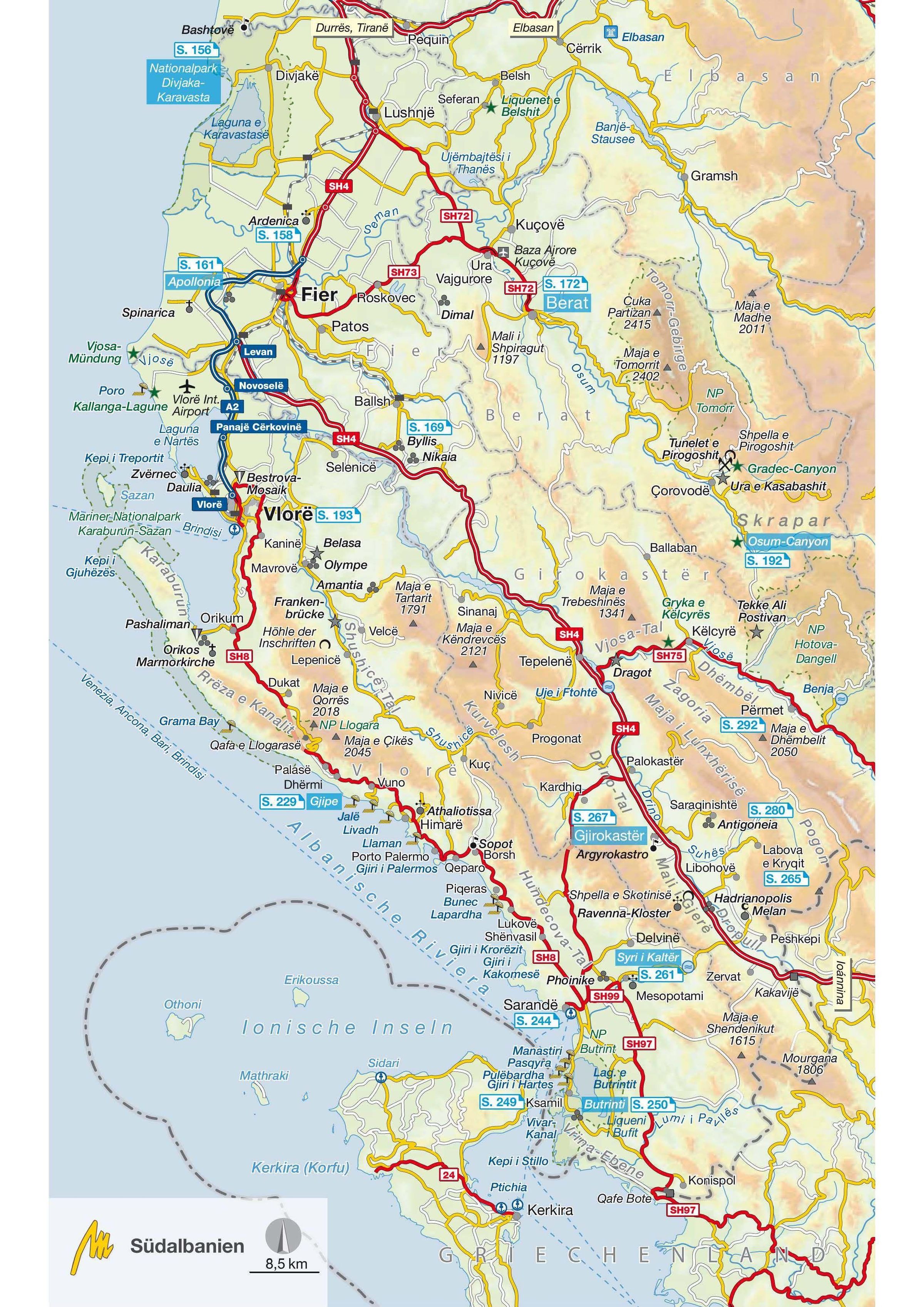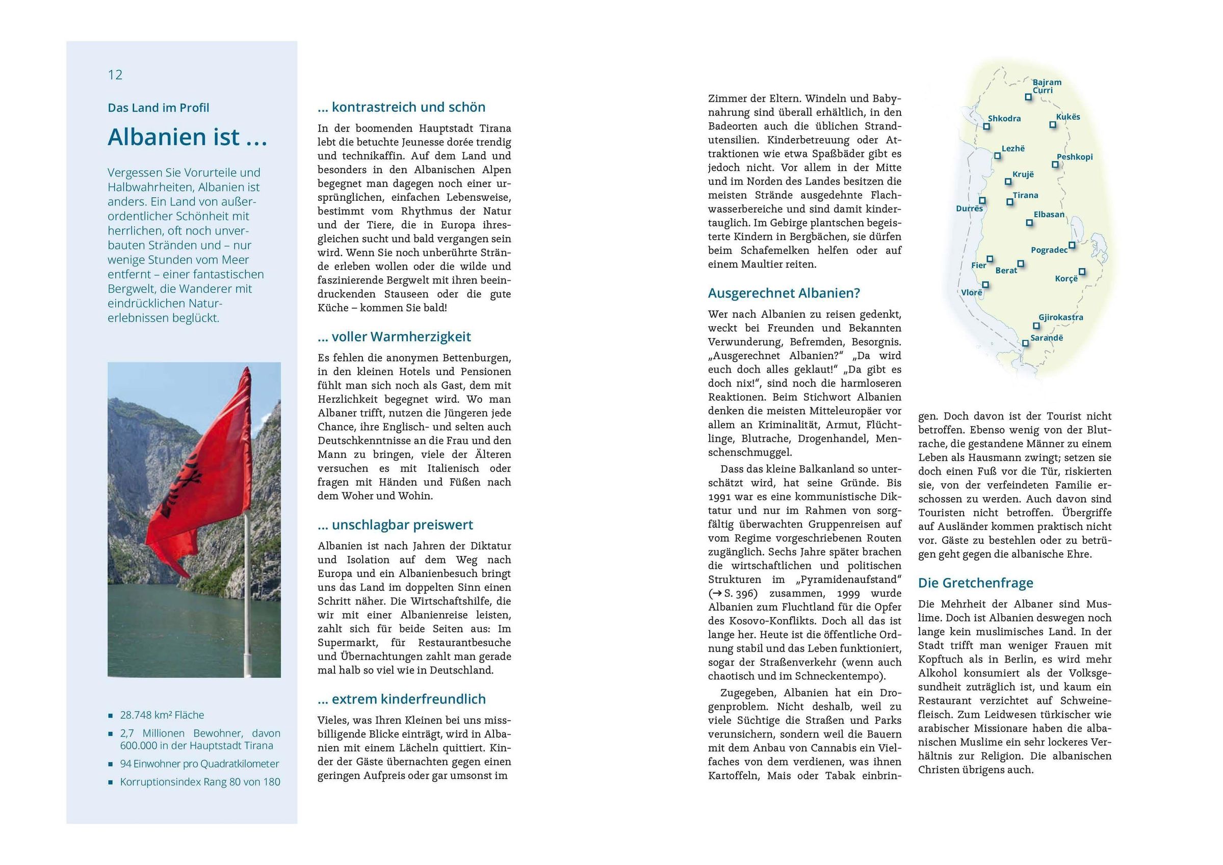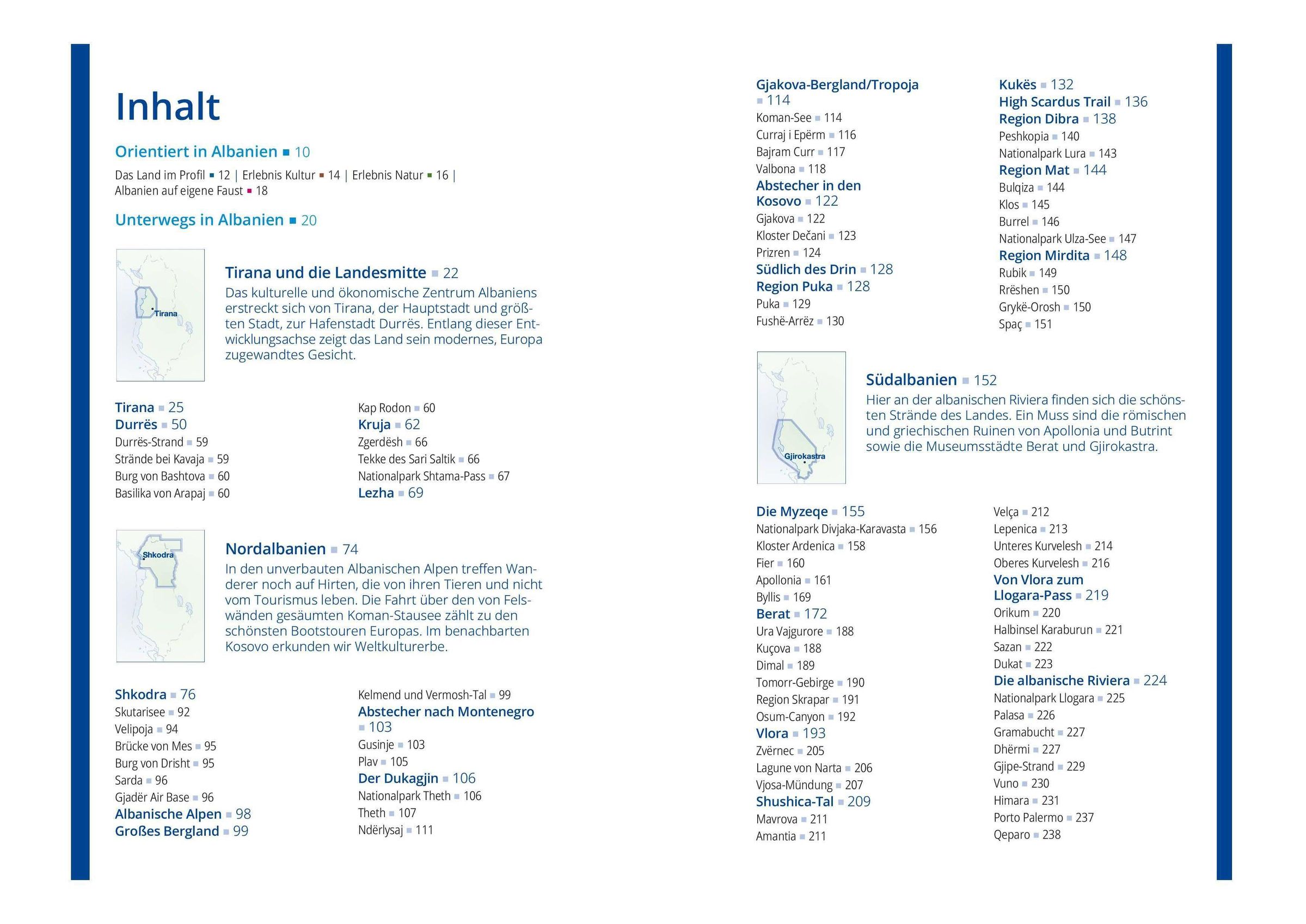 Erkunden Sie mit dem Albanien-Reiseführer die ganze Pracht des Landes: Tirana, die Haupstadt Albaniens und die Landesmitte mit Durrës, Krujë und Lezha. Nordalbanien um Shkodra. Die Albanischen Alpen mit dem von Felswänden gesäumten Koman-See, dem Großen Bergland, Dukagjin, Gjakova-Bergland / Tropoja. Die Regionen Puka, Dibra, Mat, Mirdita südlich des Drin. Plus: ein Abstecher in den Kosovo. Südalbanien lockt mit der Myzeqe, Berat, Vlora, dem Shushica-Tal, dem Llogora-Pass. Albaniens Strände an der albanischen Riviera und der Küste am Ionischen Meer, Saranda, Drino-Tal, Gjirokastra, den Regionen Dropull und Lunxhera sowie dem Vjosa-Tal. Das nur wenig bereiste Ostalbanien ist für Abenteurer sowie Natur- und Vogelfreunde wie gemacht: Korça, Voskopoja, Nationalpark Prespa mit den Prespaseen, der Ohridsee und Elbasan.