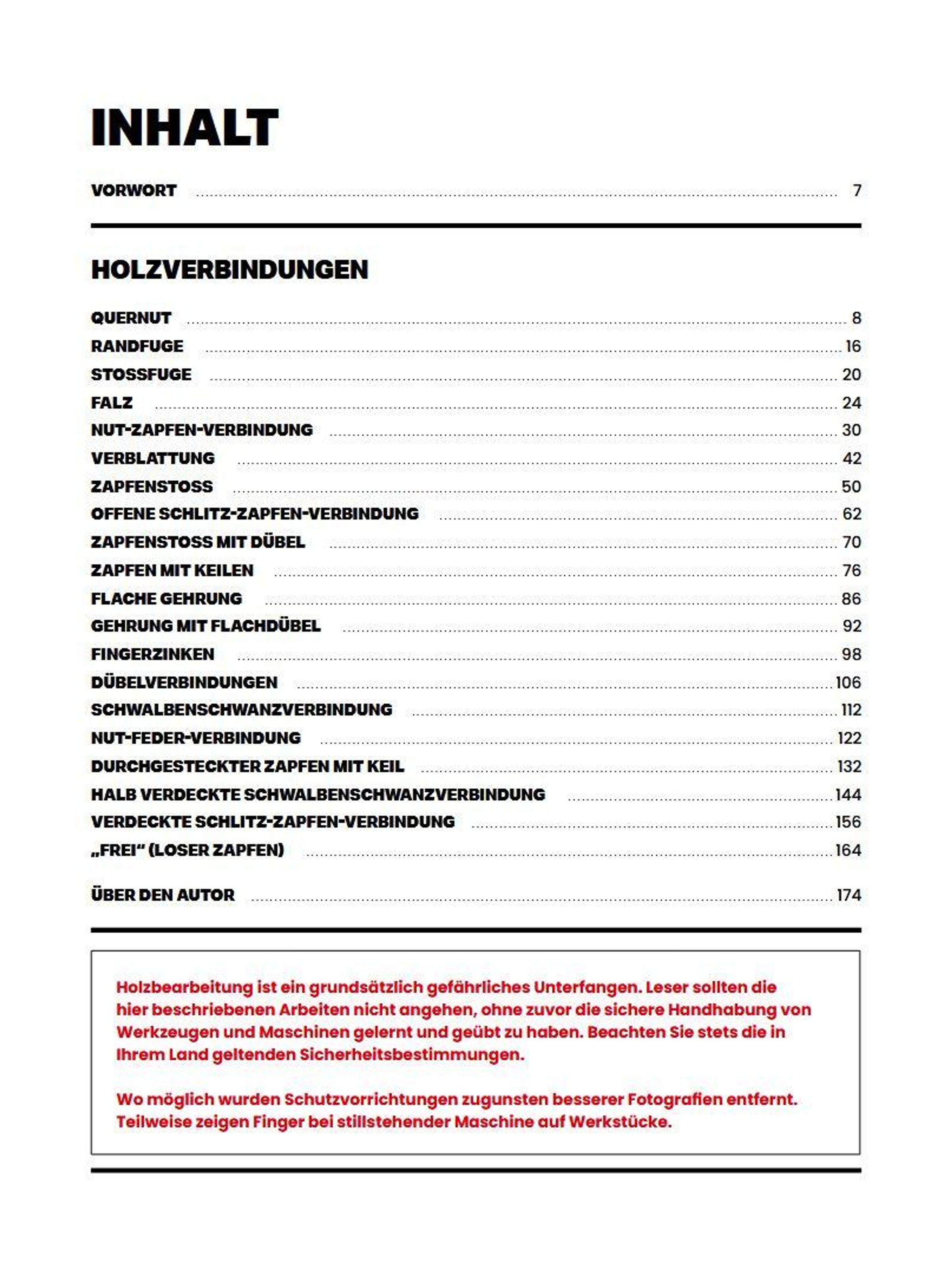Je nach Werkstück werden die einzelnen Teile dabei mit Fugen, Falz oder Gehrung, mit Zapfen, Zinken, Dübel u. v. m. verbunden. Insgesamt werden 20 Holzverbindungen vorgestellt. Optimale Grundlagenlektüre für Einsteiger wie auch Nachschlagewerk für Praktiker.