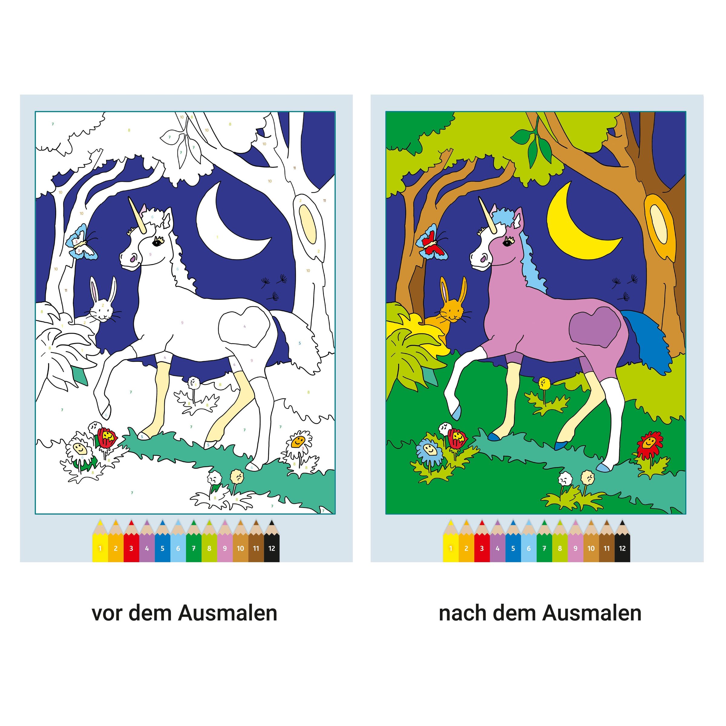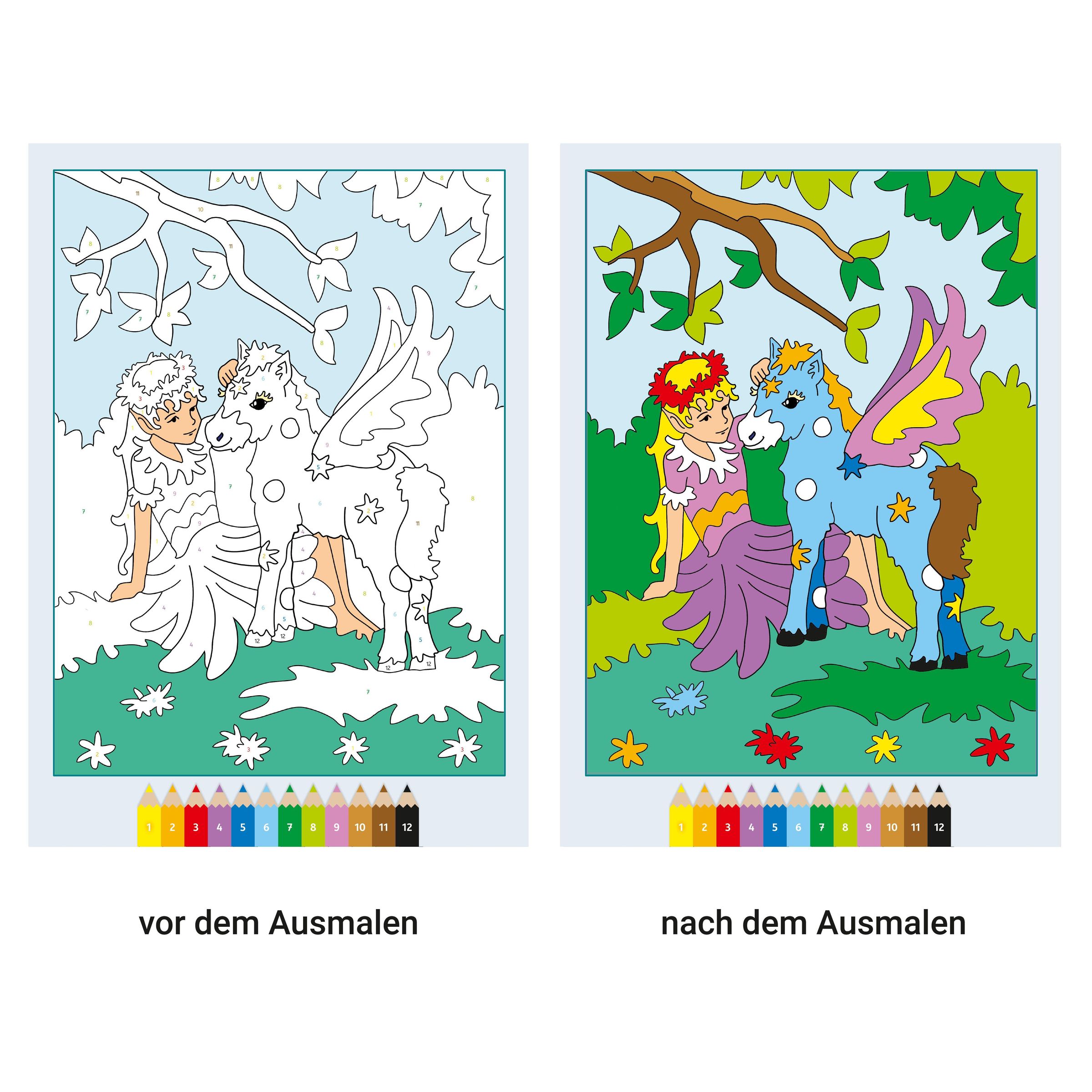 Das Malbuch enthält viele wunderschöne Ausmalmotive rund um das Thema Fantasy, Zauber und Magie: spielende Tiere im magischen Wald, ein Einhorn im Mondschein, zauberhafte Feen und Elfen und noch viel mehr. Die altersgerechten Motive und nummerierten Ausmalfelder machen das Weitermalen der Bilder kinderleicht. So entstehen im Handumdrehen perfekte Kunstwerke. Die Zahlen sind so zart, dass sie beim Übermalen verschwinden. Die Farbpalette der Motive entspricht handelsüblichen Stiftpackungen.